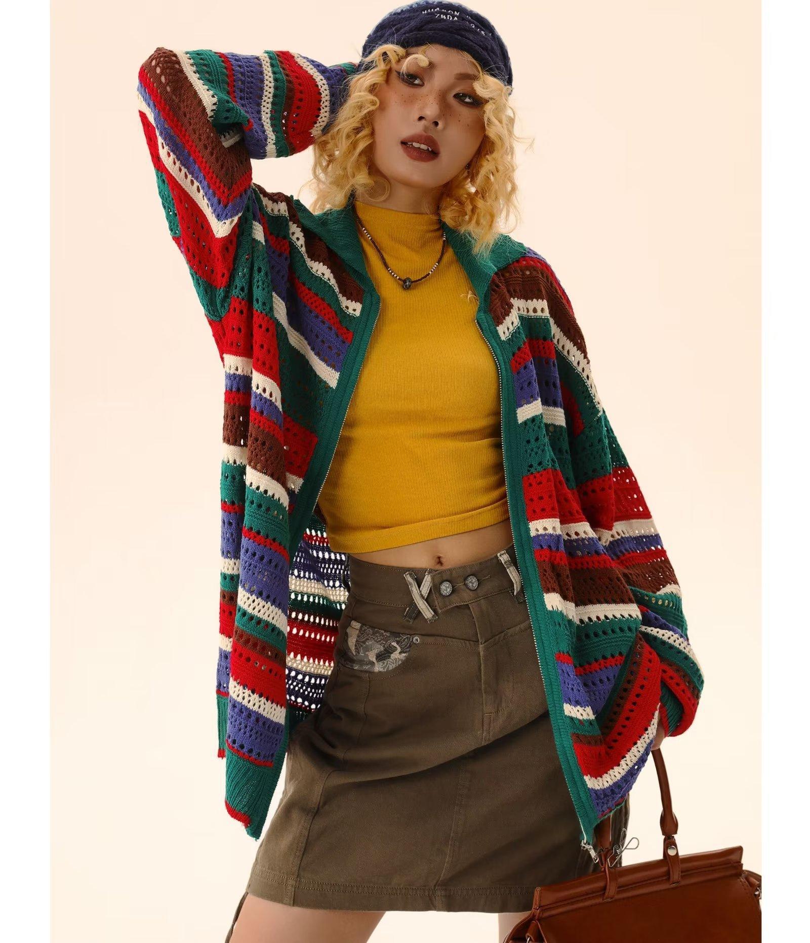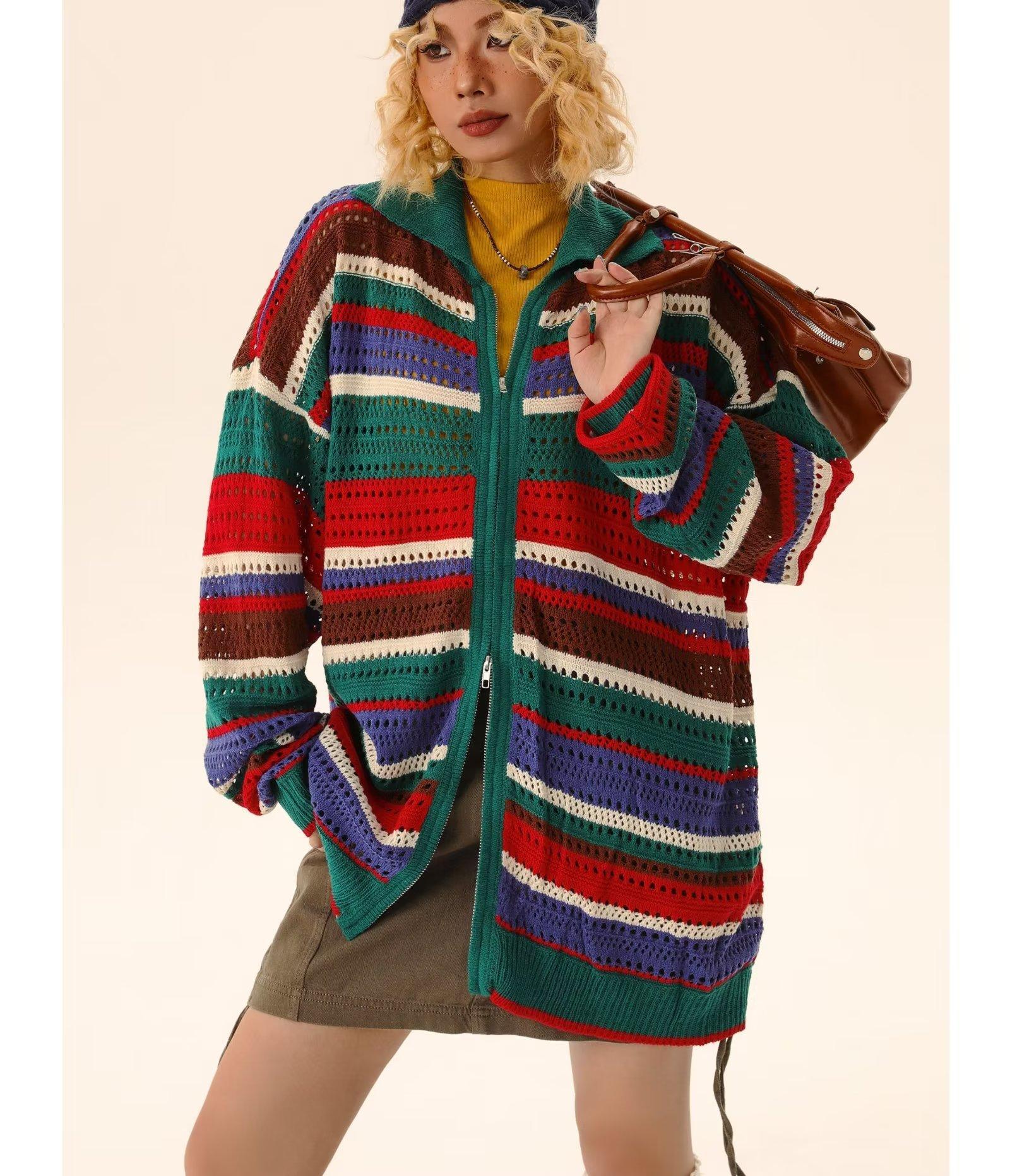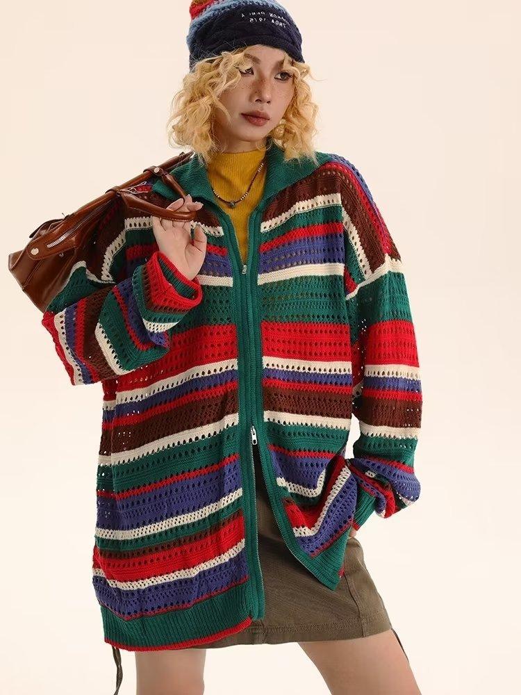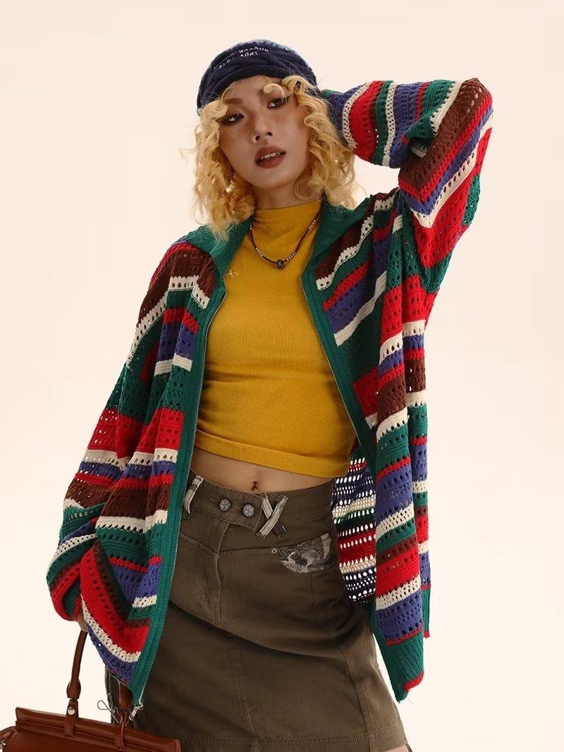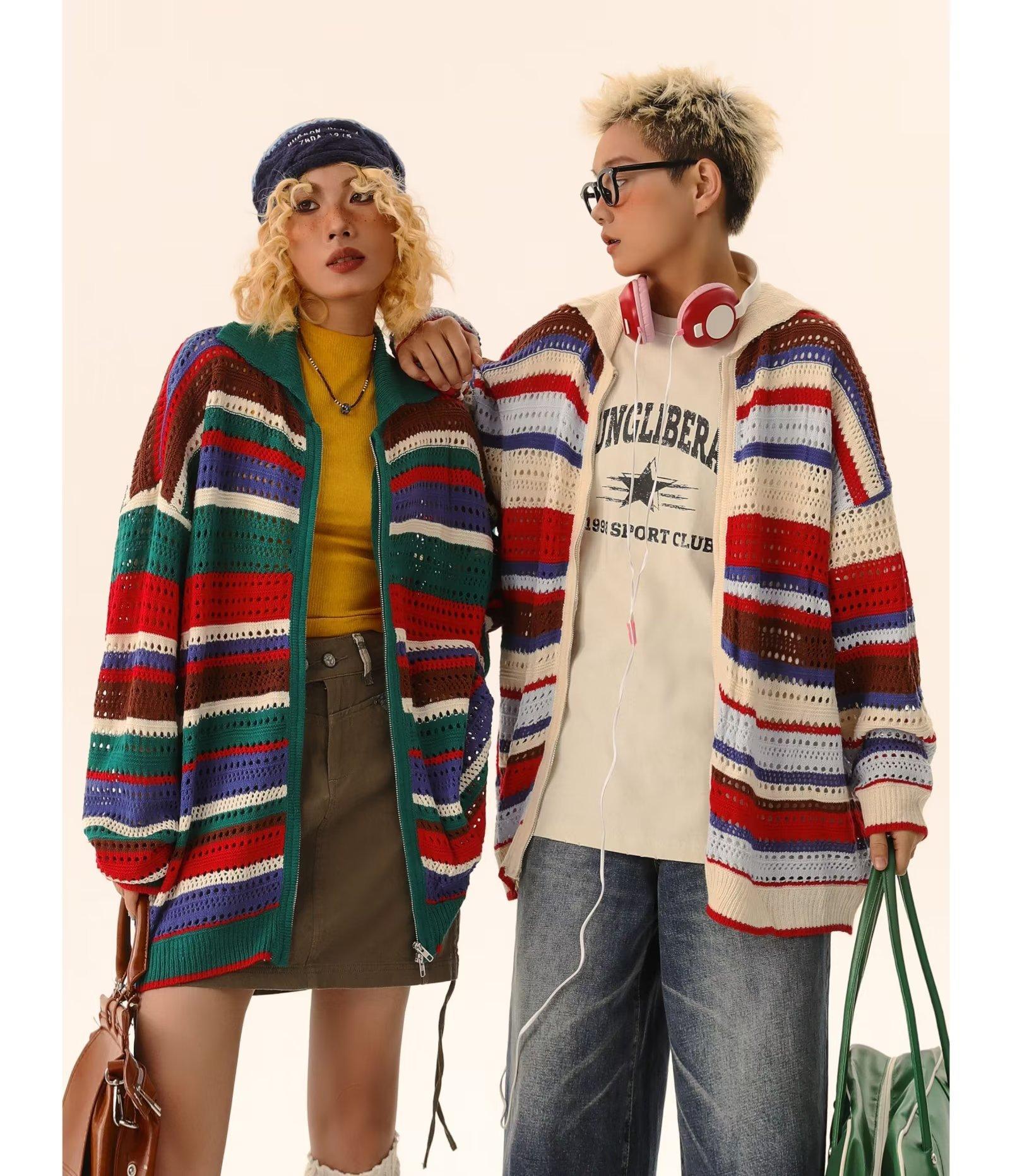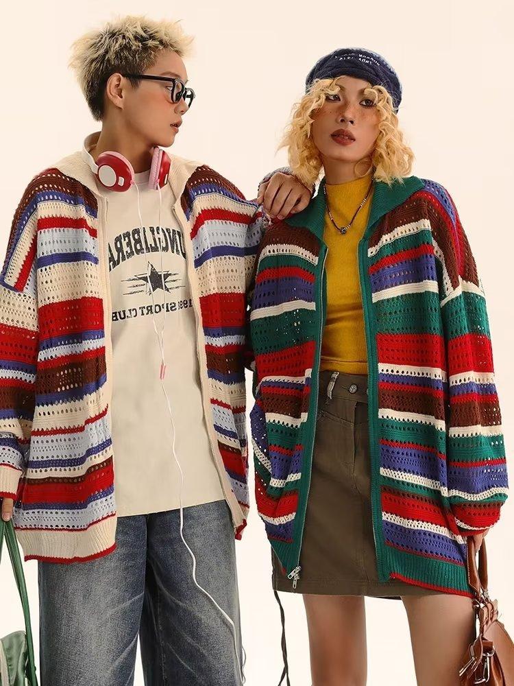 Suéter cárdigan con cremallera a rayas de color en contraste ahuecado de color retro americano suelto casual marca de moda suéter para pareja exterior