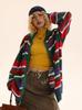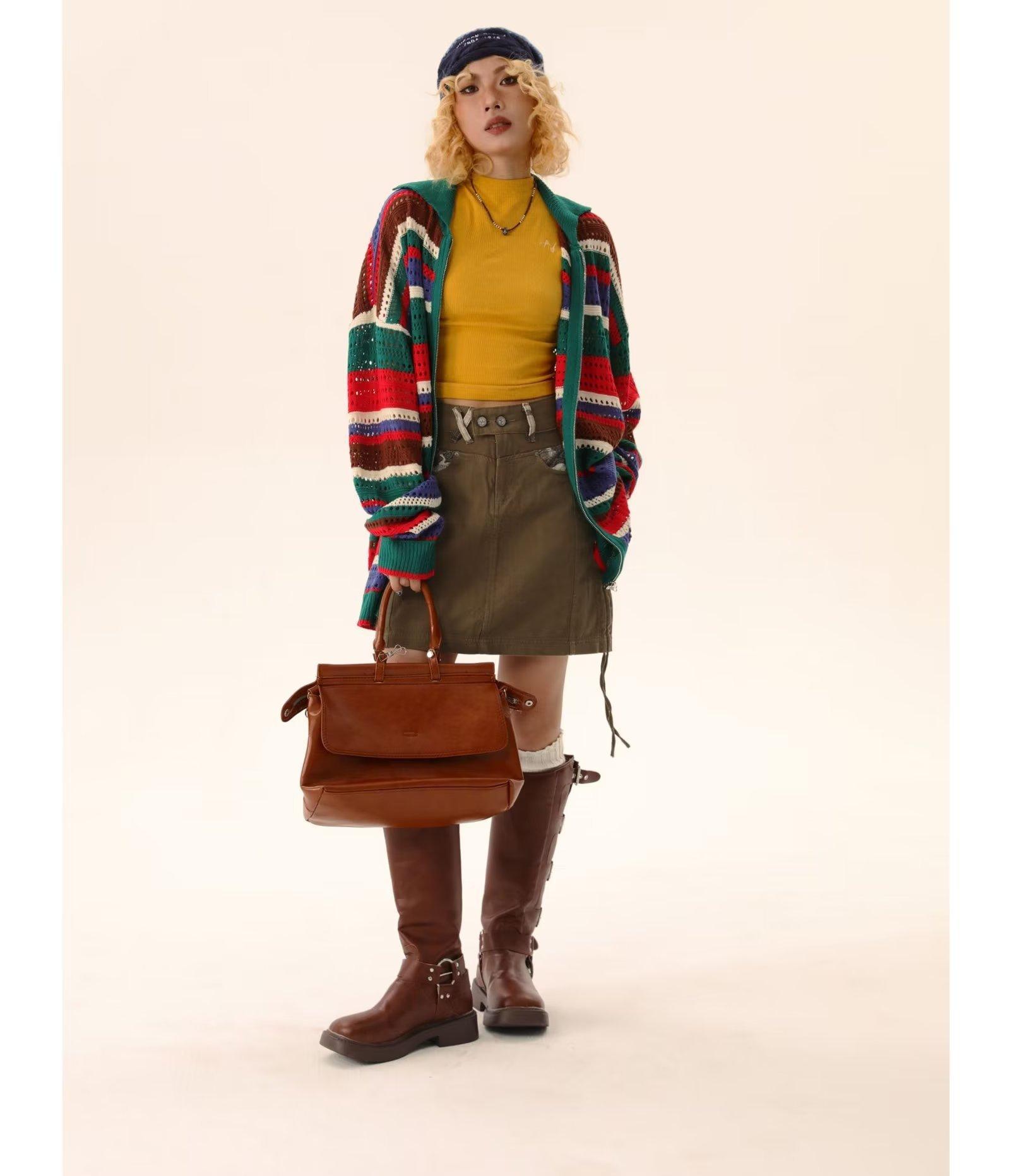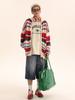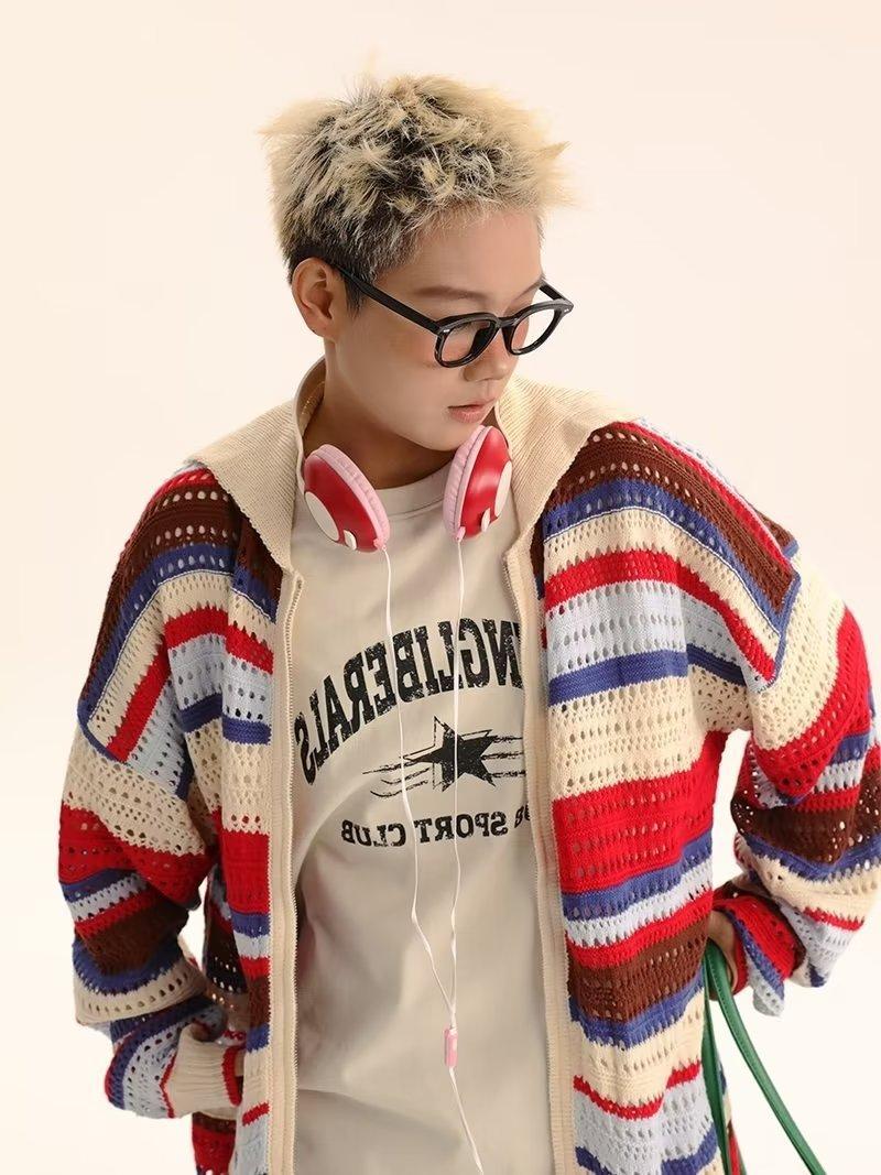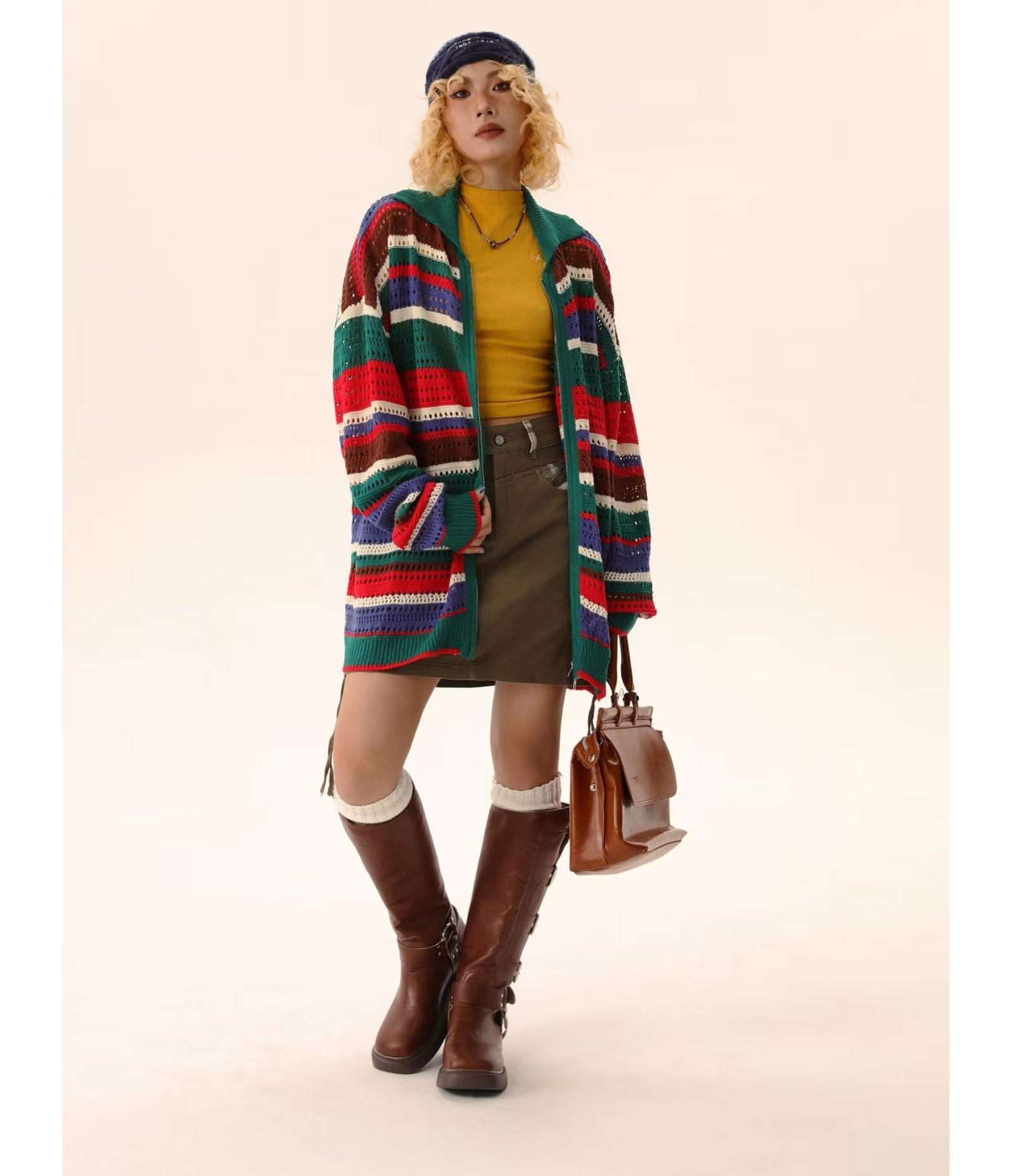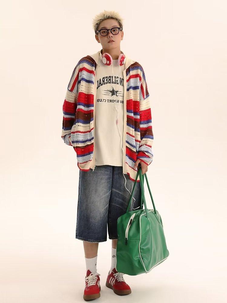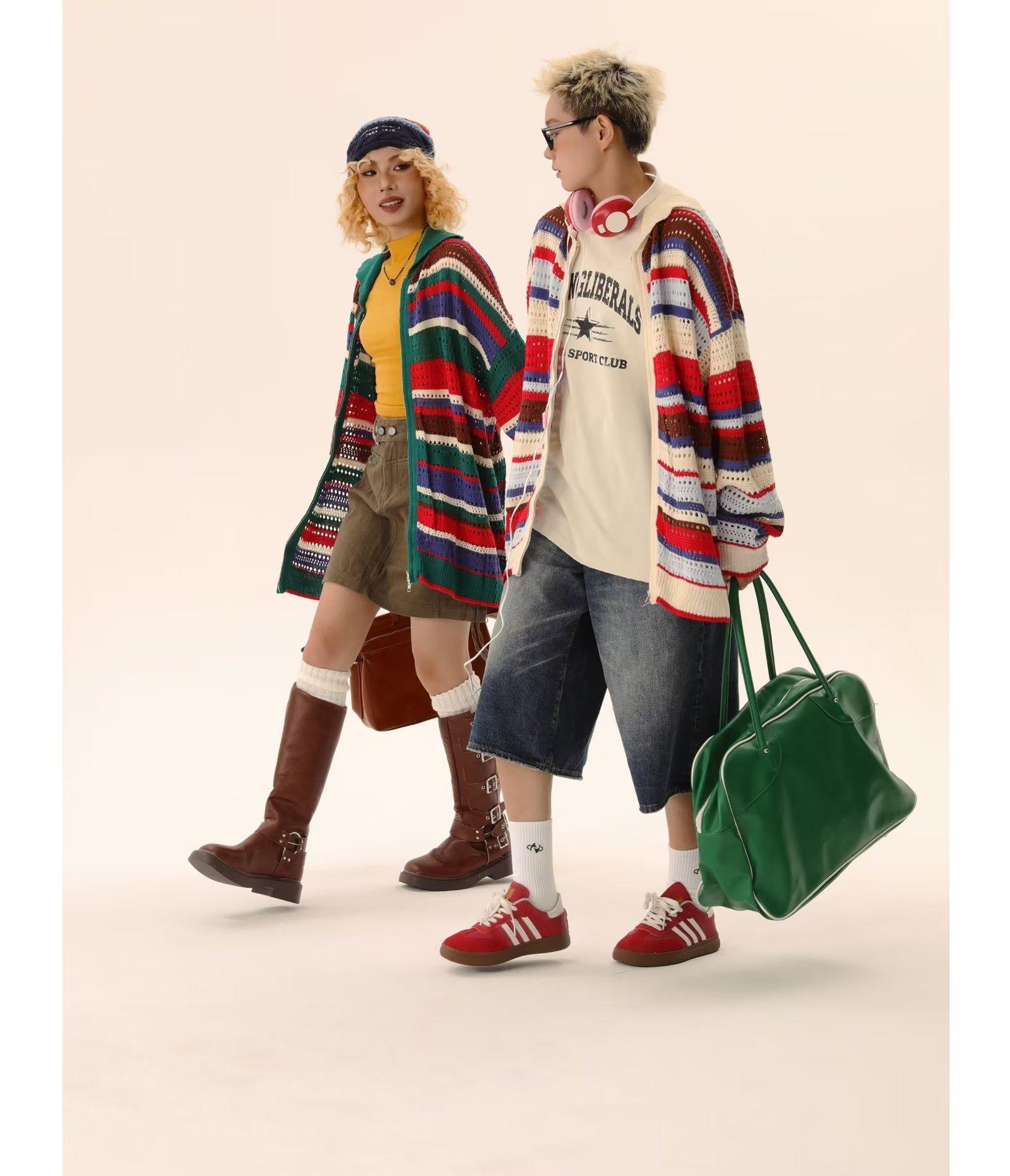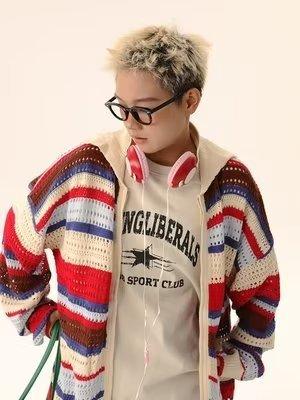Suéter cárdigan con cremallera a rayas de color en contraste ahuecado de color retro americano suelto casual marca de moda suéter para pareja exterior