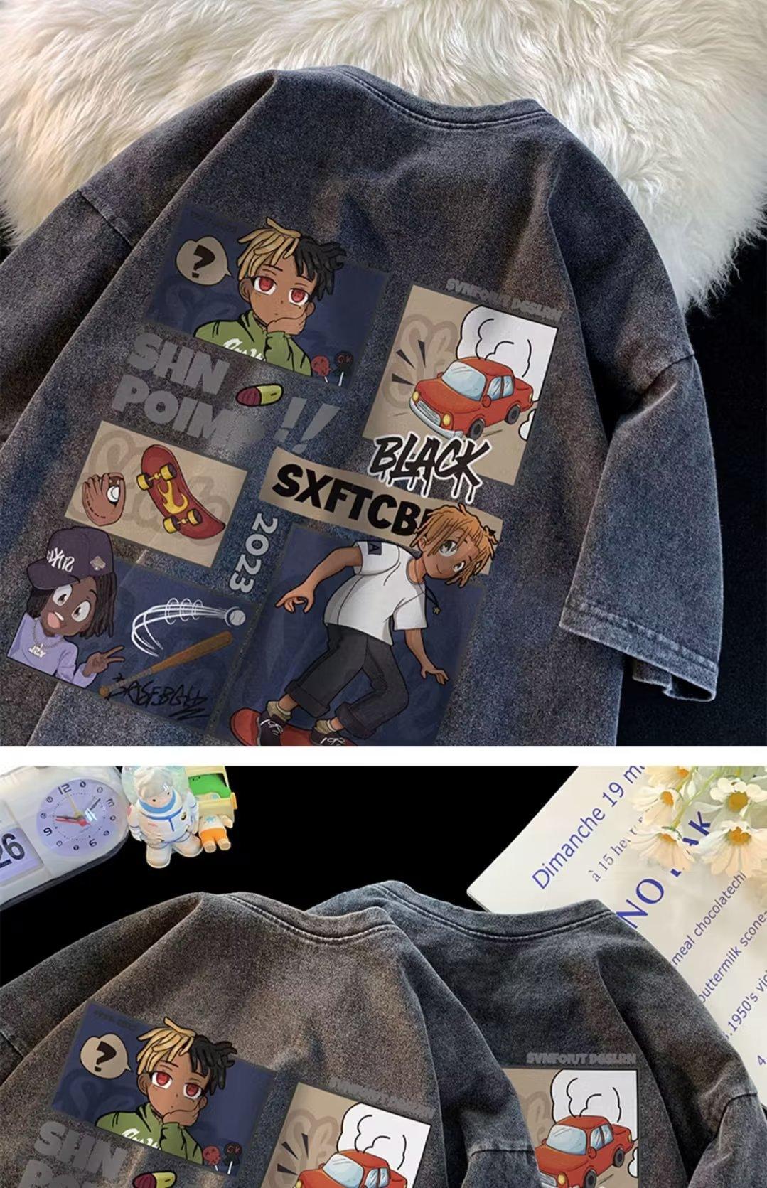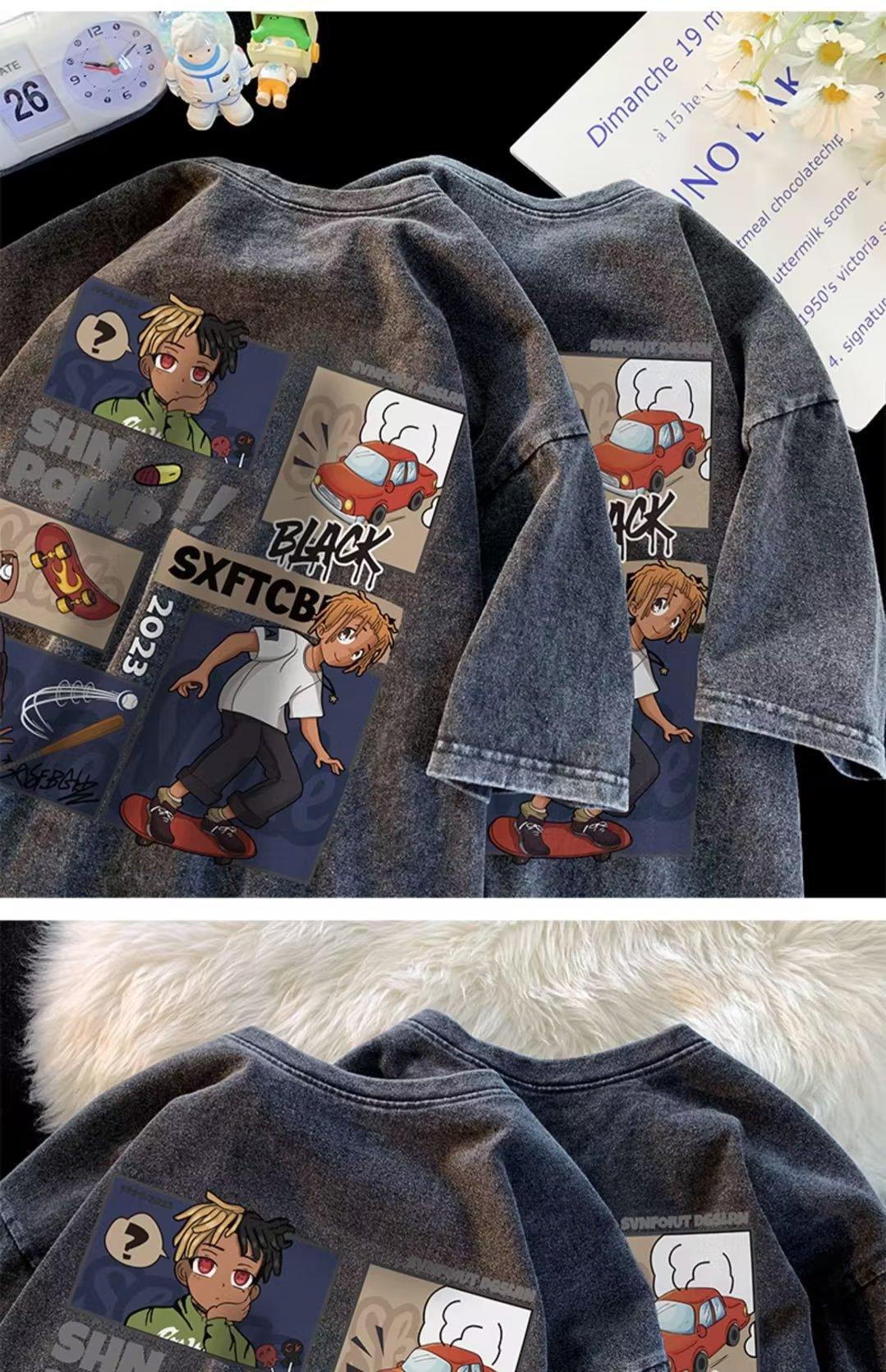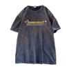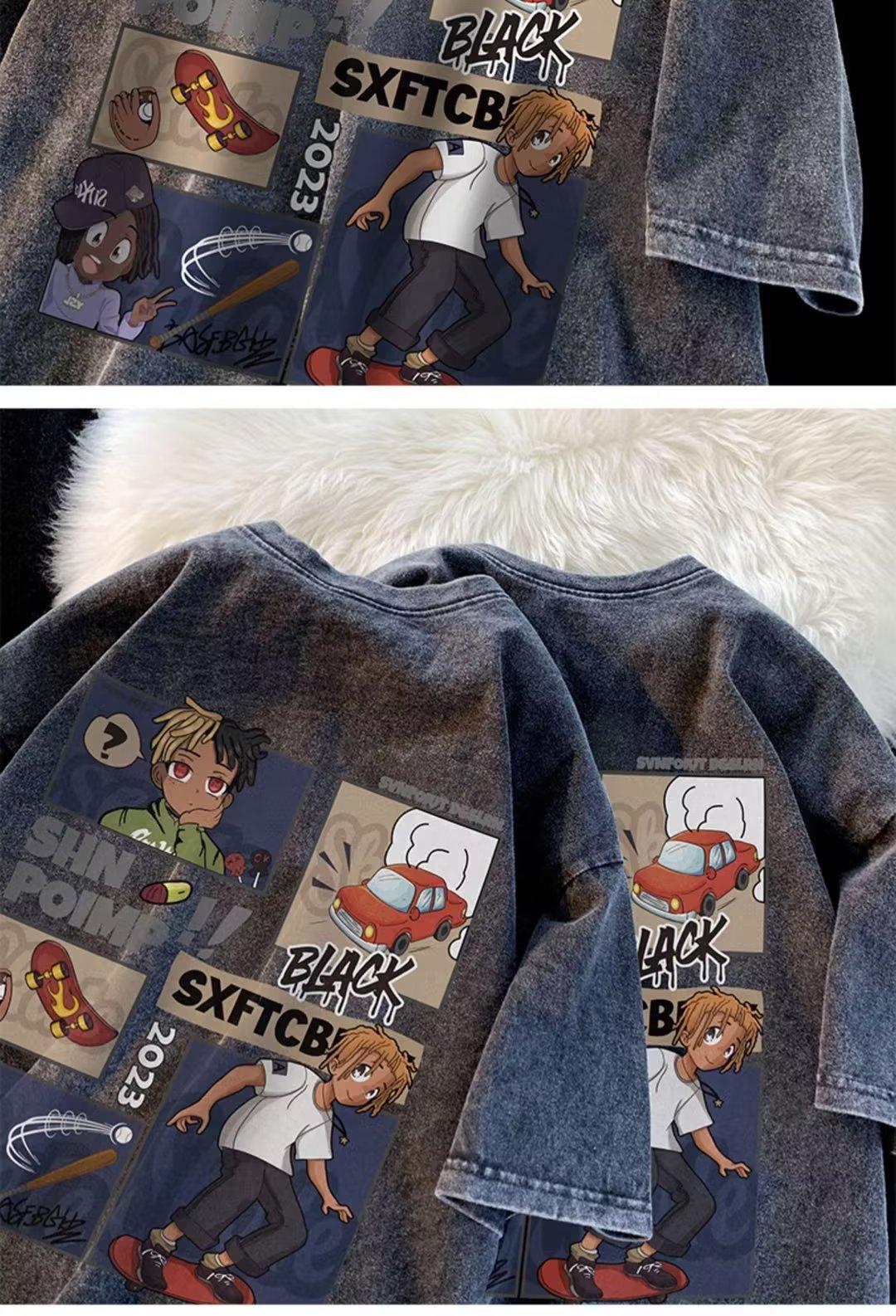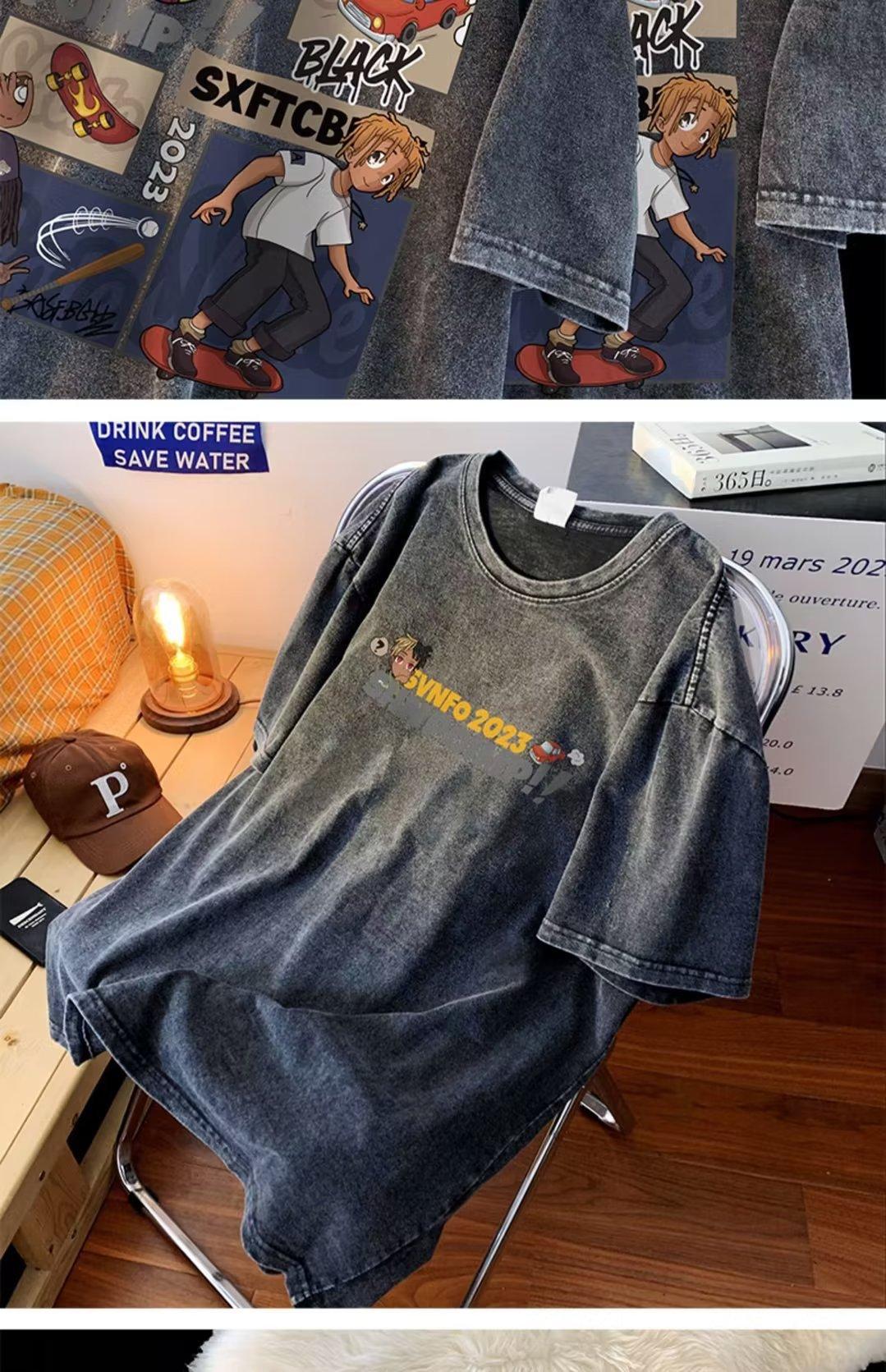 Camiseta de manga corta para hombre, con estampado de dibujos animados, cuello redondo, de verano, de marca de moda retro americana, lavada, desgastada, holgada, de talla grande, de media manga