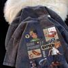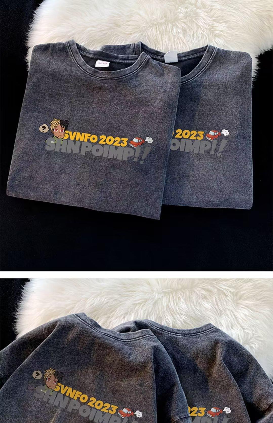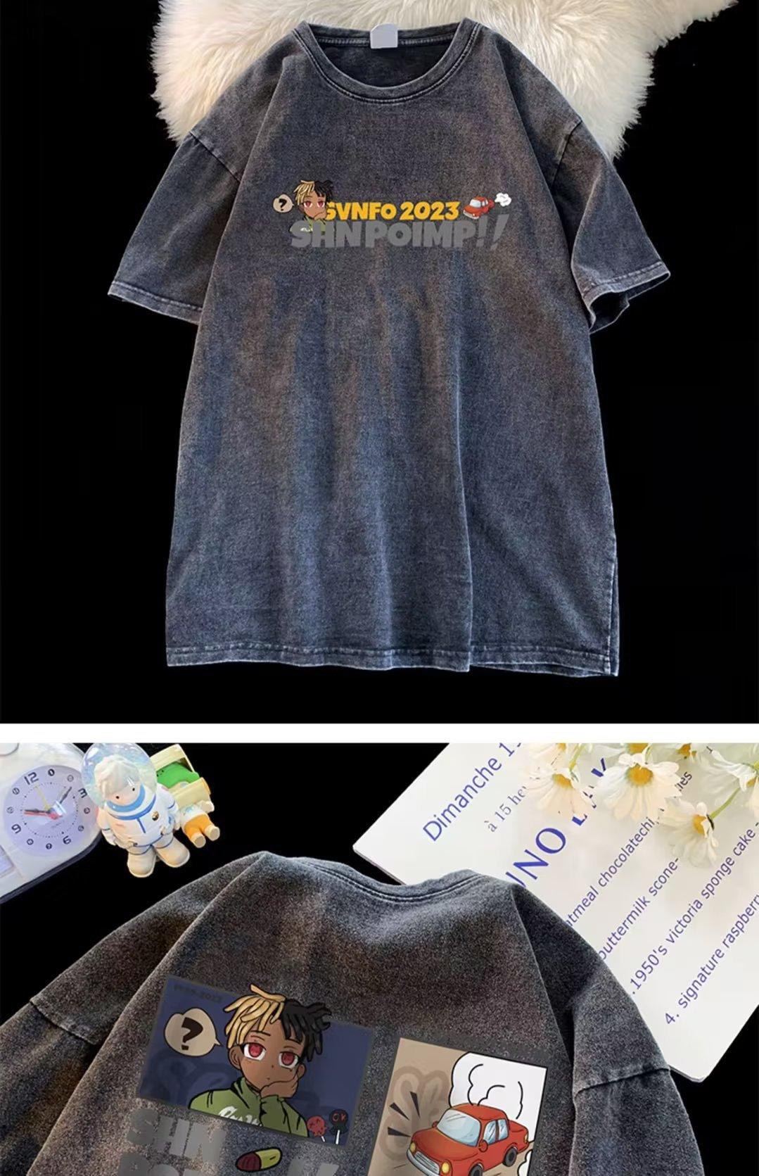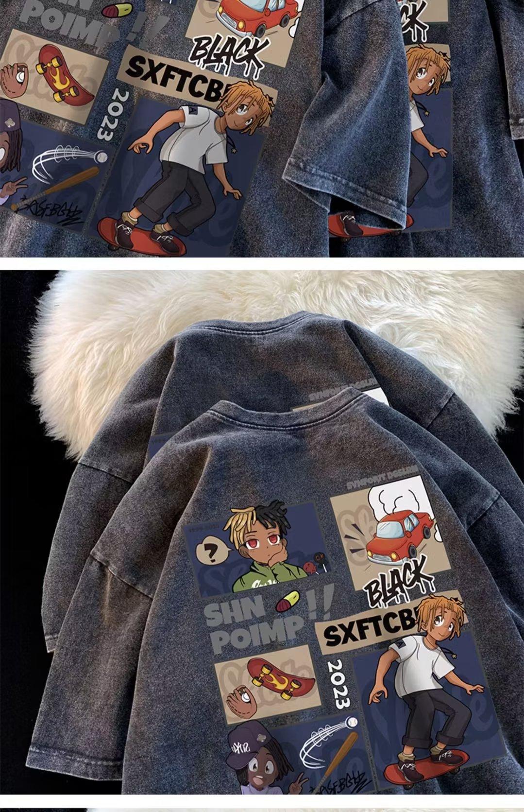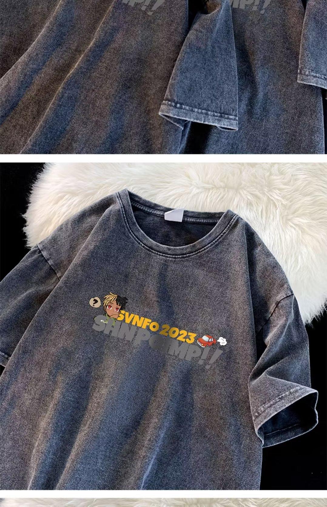 Camiseta de manga corta para hombre, con estampado de dibujos animados, cuello redondo, de verano, de marca de moda retro americana, lavada, desgastada, holgada, de talla grande, de media manga