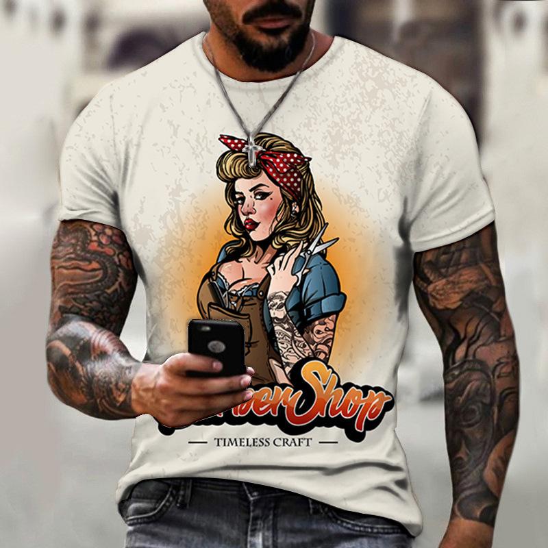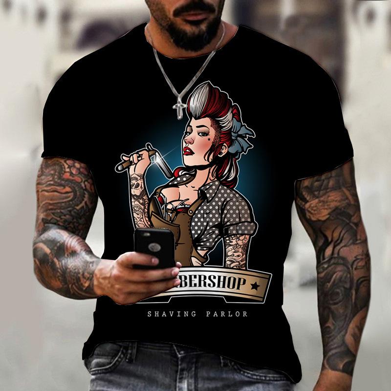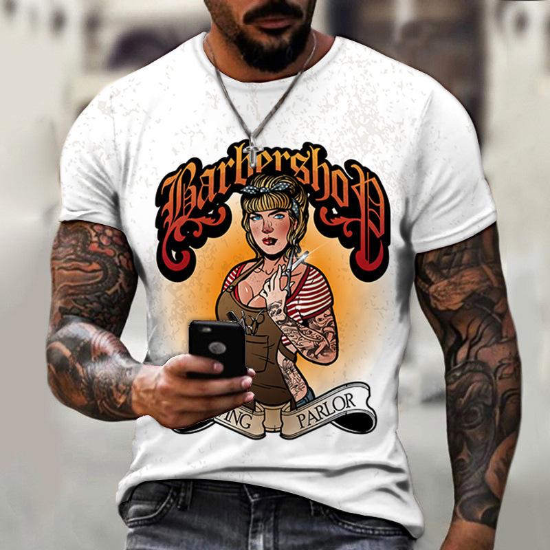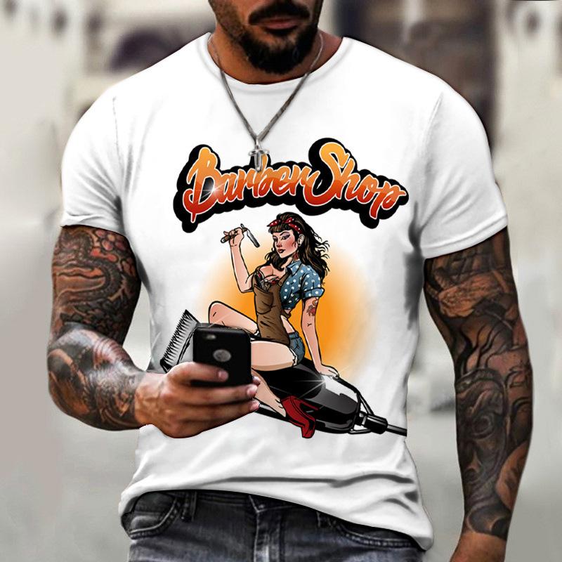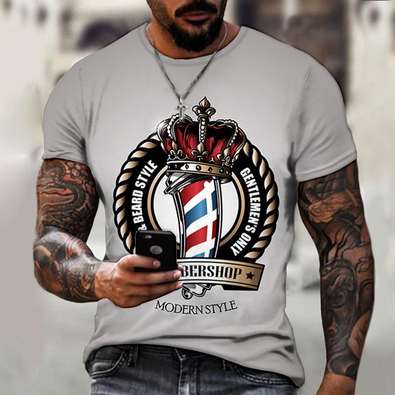 Moda 2022 Caliente Retro Pintado a Mano Logotipo Barbería Impresión 3D Camiseta Casual Suelta Transfronterizo Ropa de Hombre