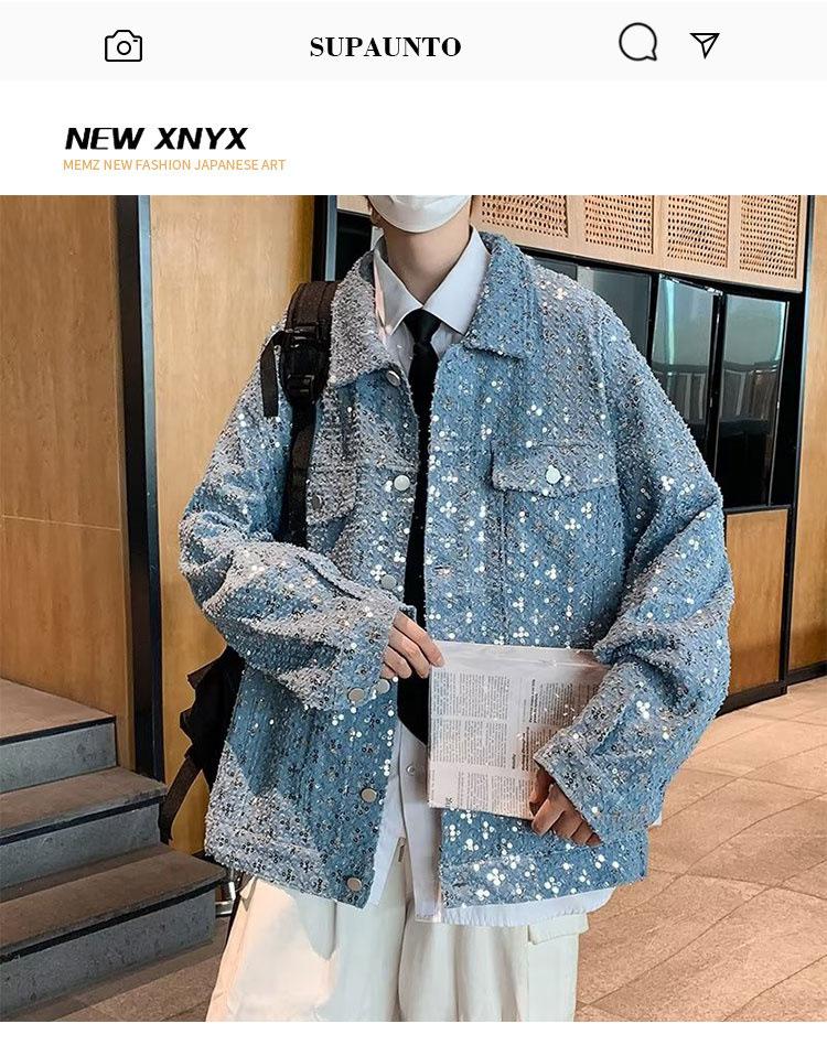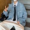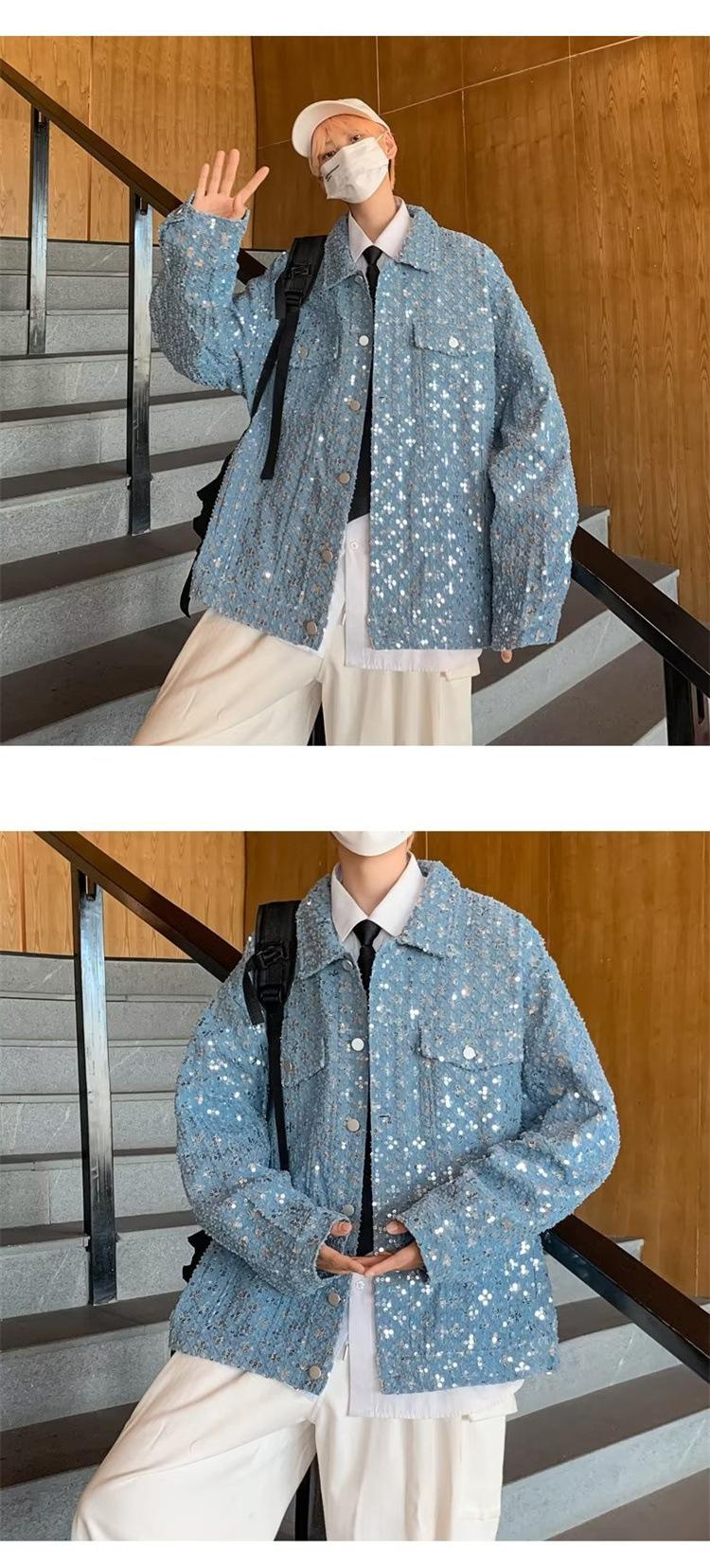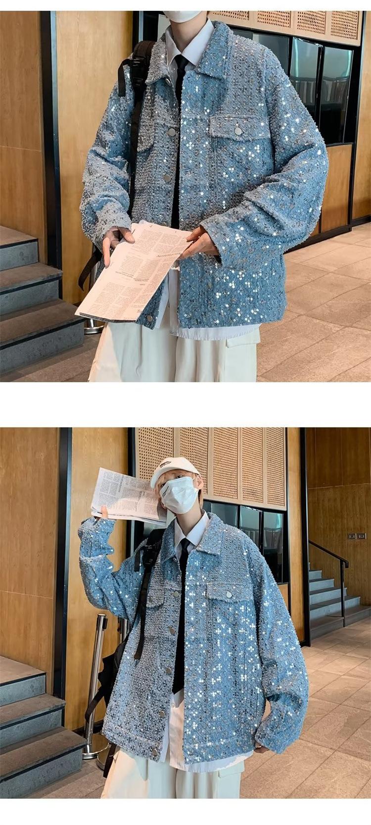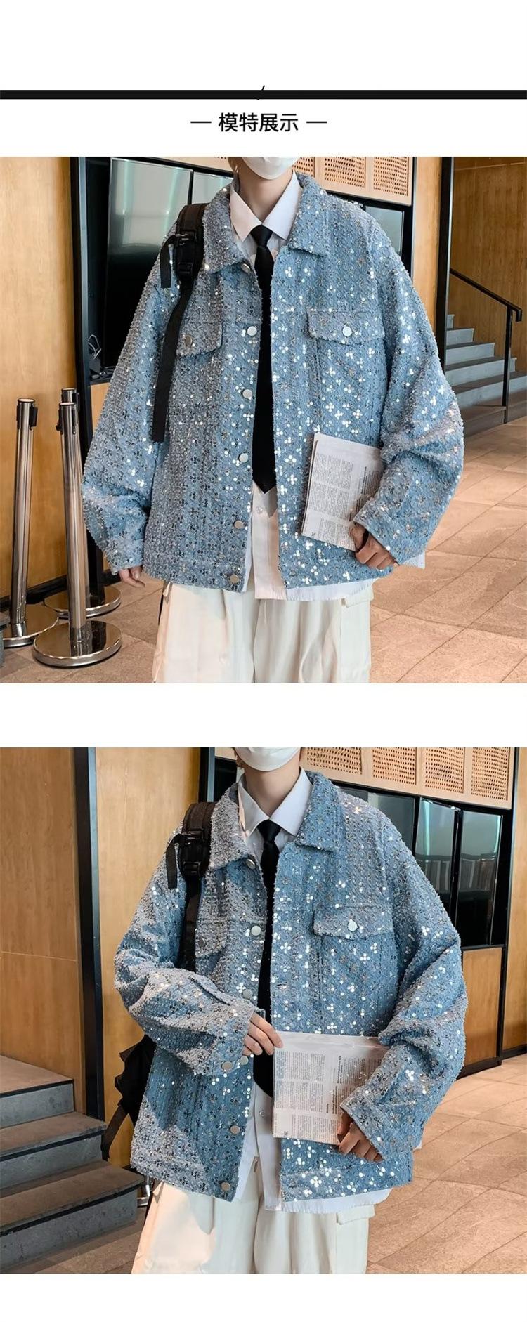 Chaqueta vaquera con lentejuelas estilo Hong Kong para hombre, estilo coreano, de primavera, moderna, holgada, combinable, elegante, estilo urbano, tipo cárdigan.