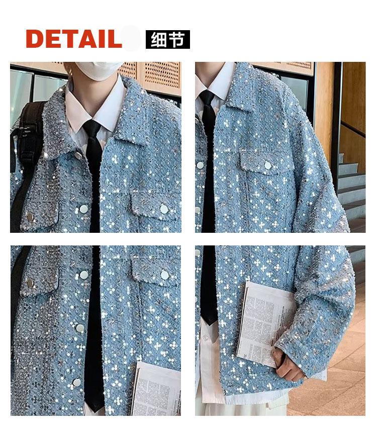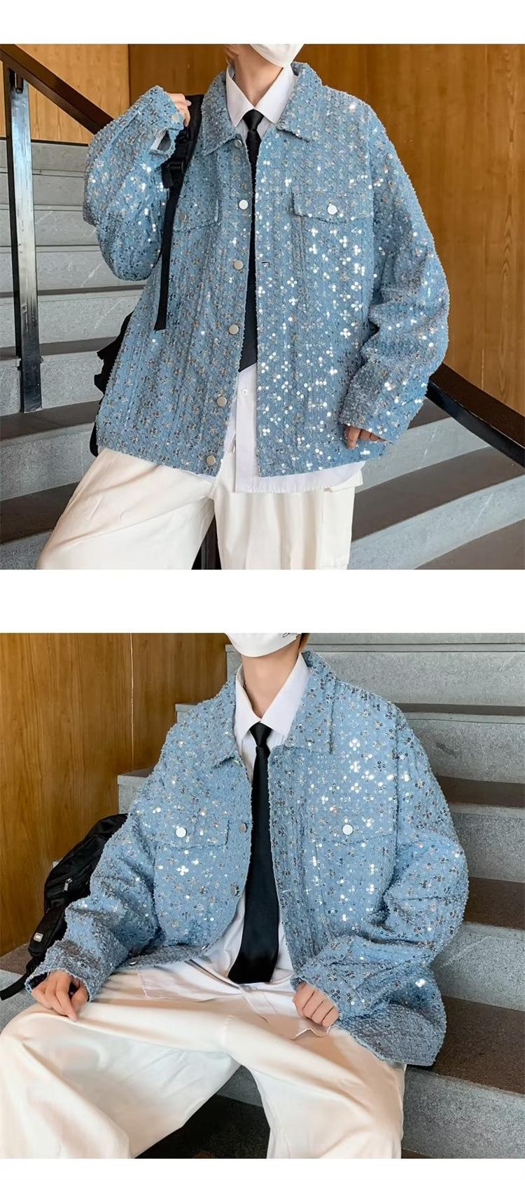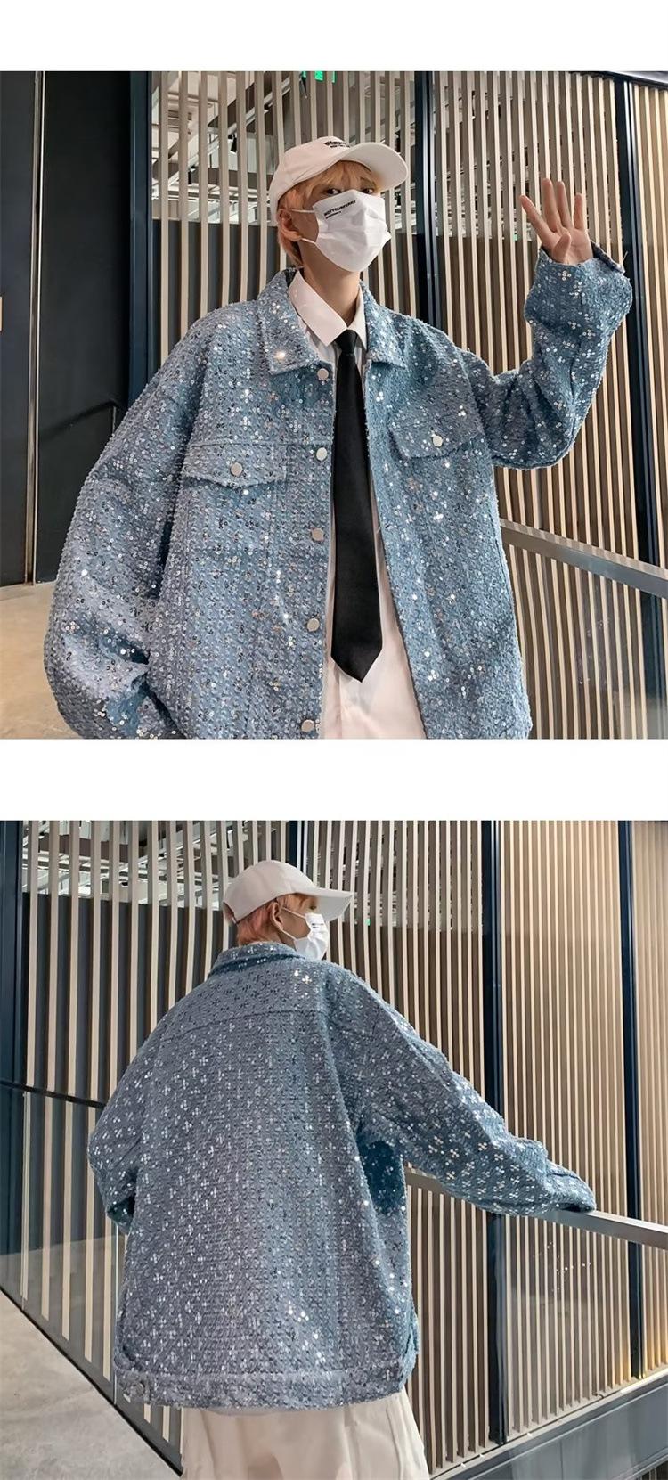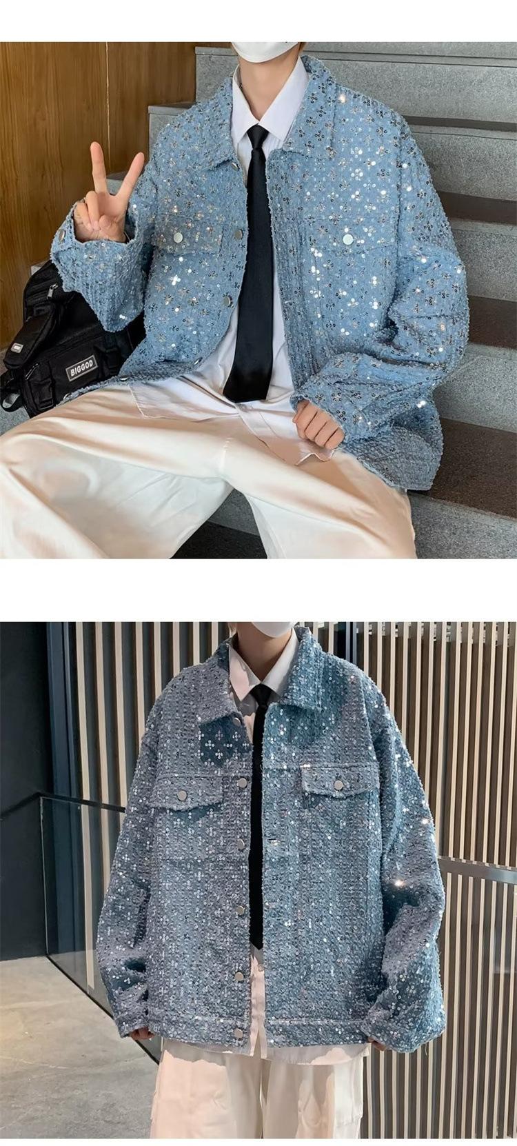 Chaqueta vaquera con lentejuelas estilo Hong Kong para hombre, estilo coreano, de primavera, moderna, holgada, combinable, elegante, estilo urbano, tipo cárdigan.