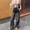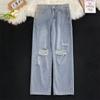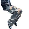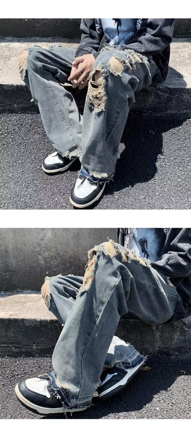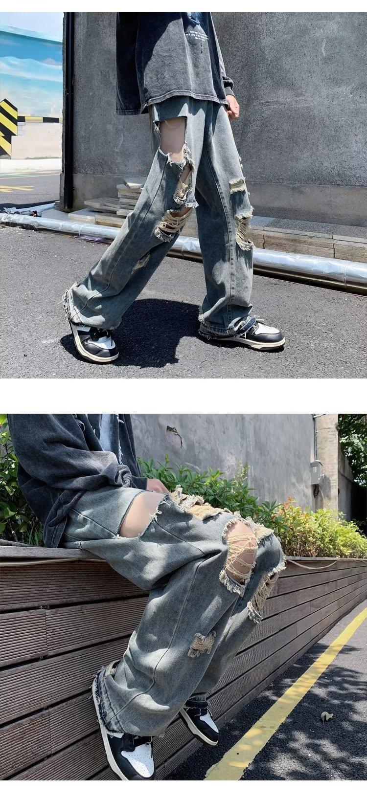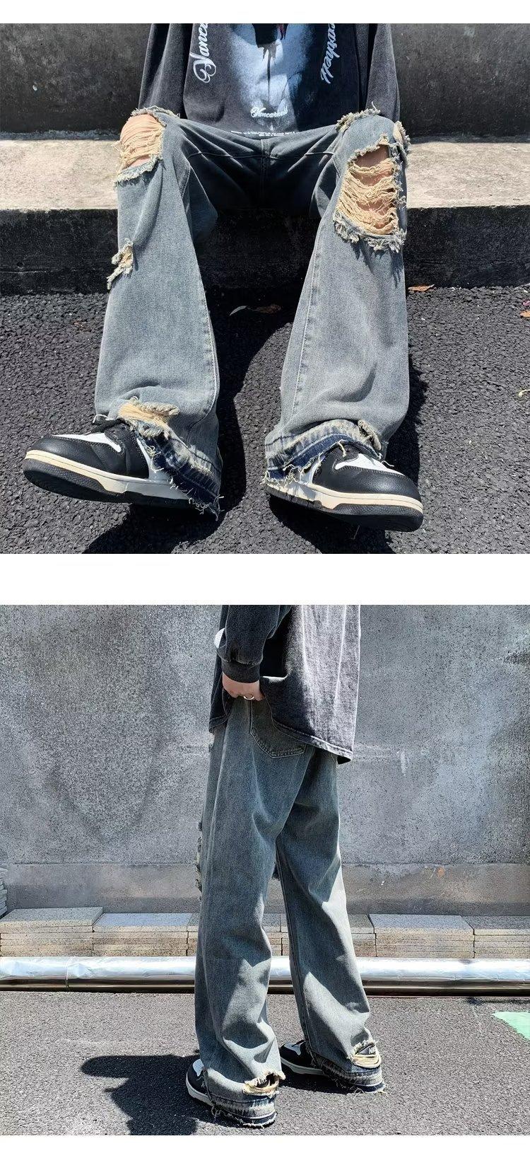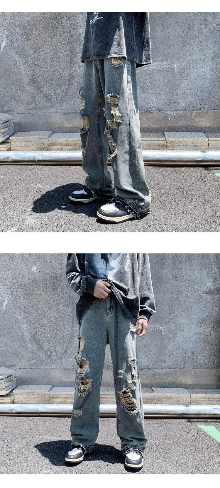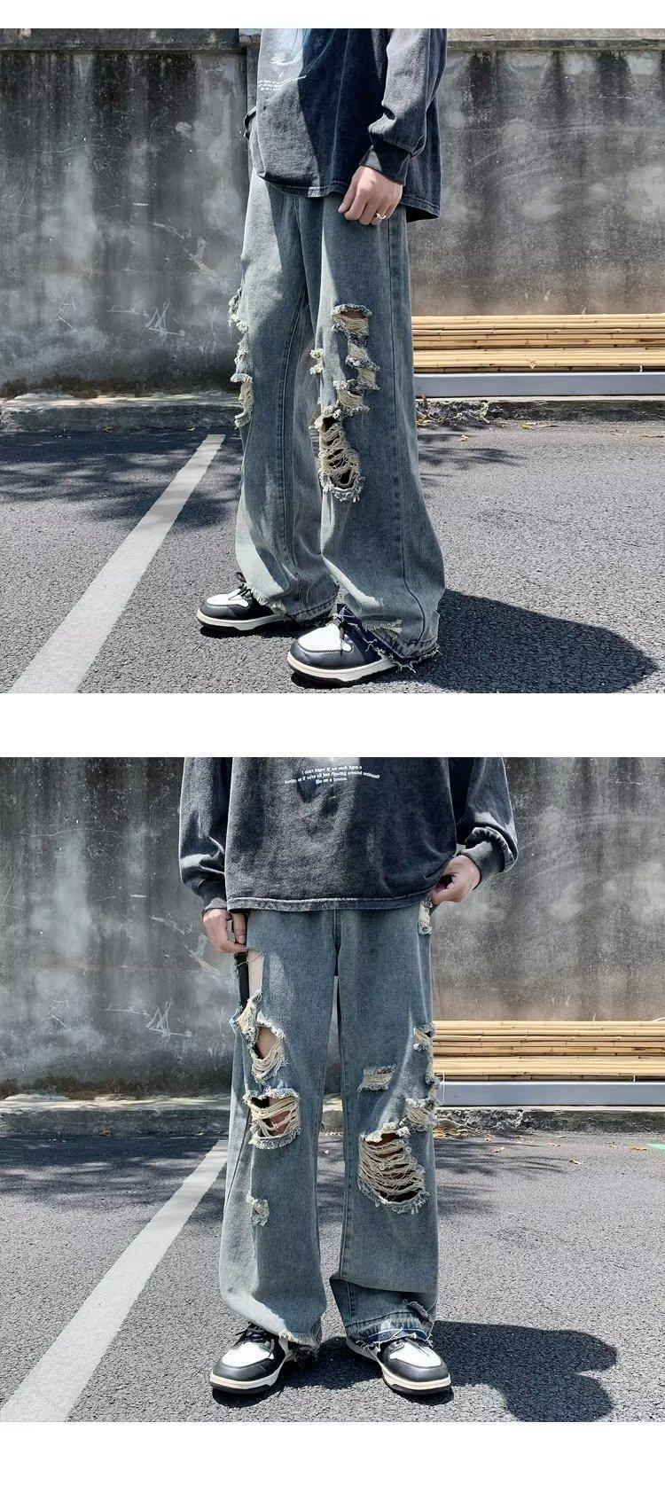 Jeans rectos holgados para combinar con todo para hombre y mujer, modernos 939, otoño, estilo americano urbano, desgastados, irregulares, rotos, de pierna ancha