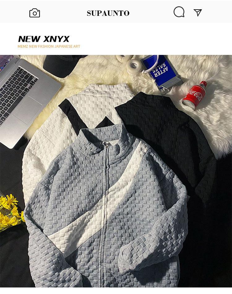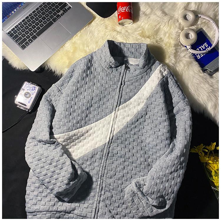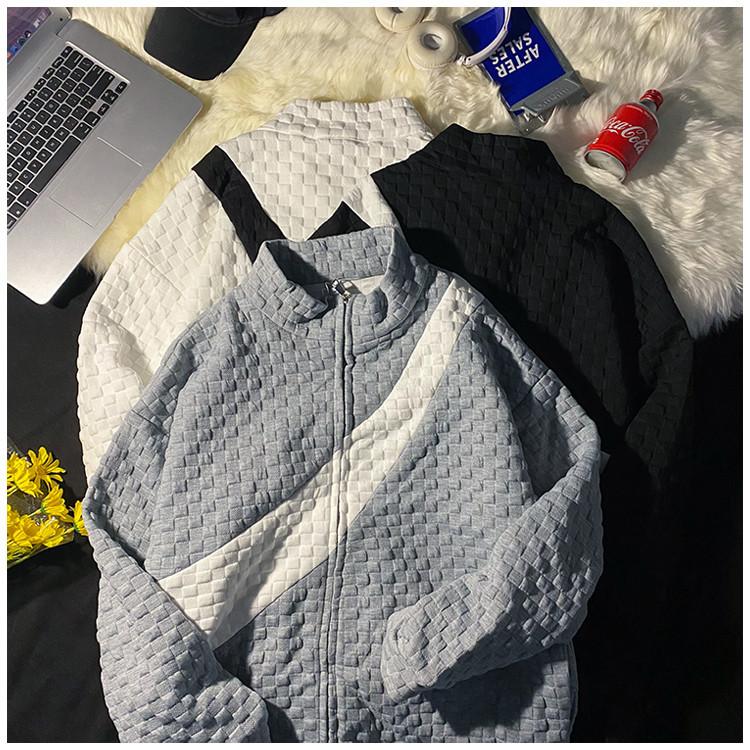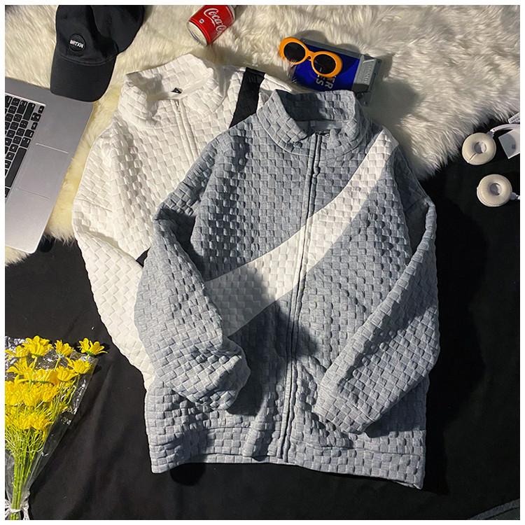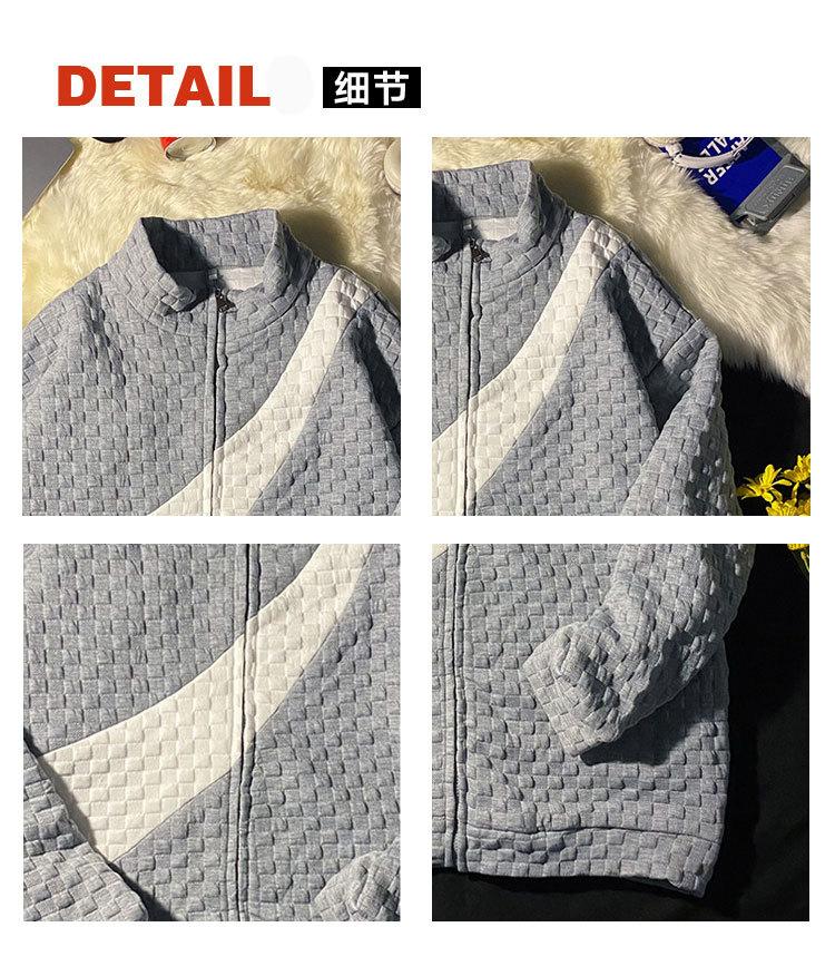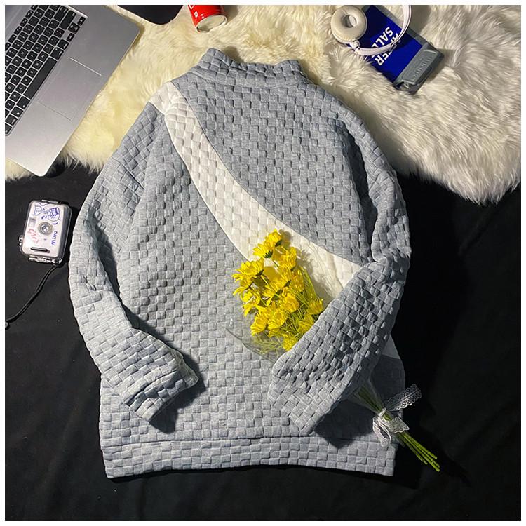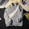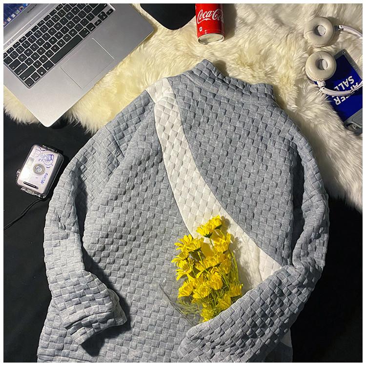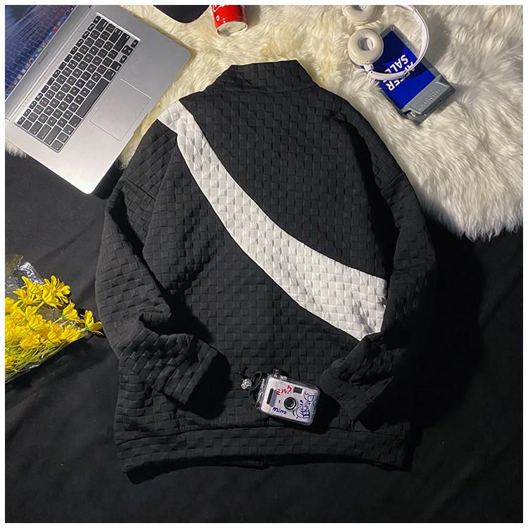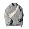 Suéter con cremallera y costuras a cuadros en contraste de color para hombre, marca de moda de primavera, estilo urbano de Hong Kong, cuello holgado, manga larga, jersey exterior