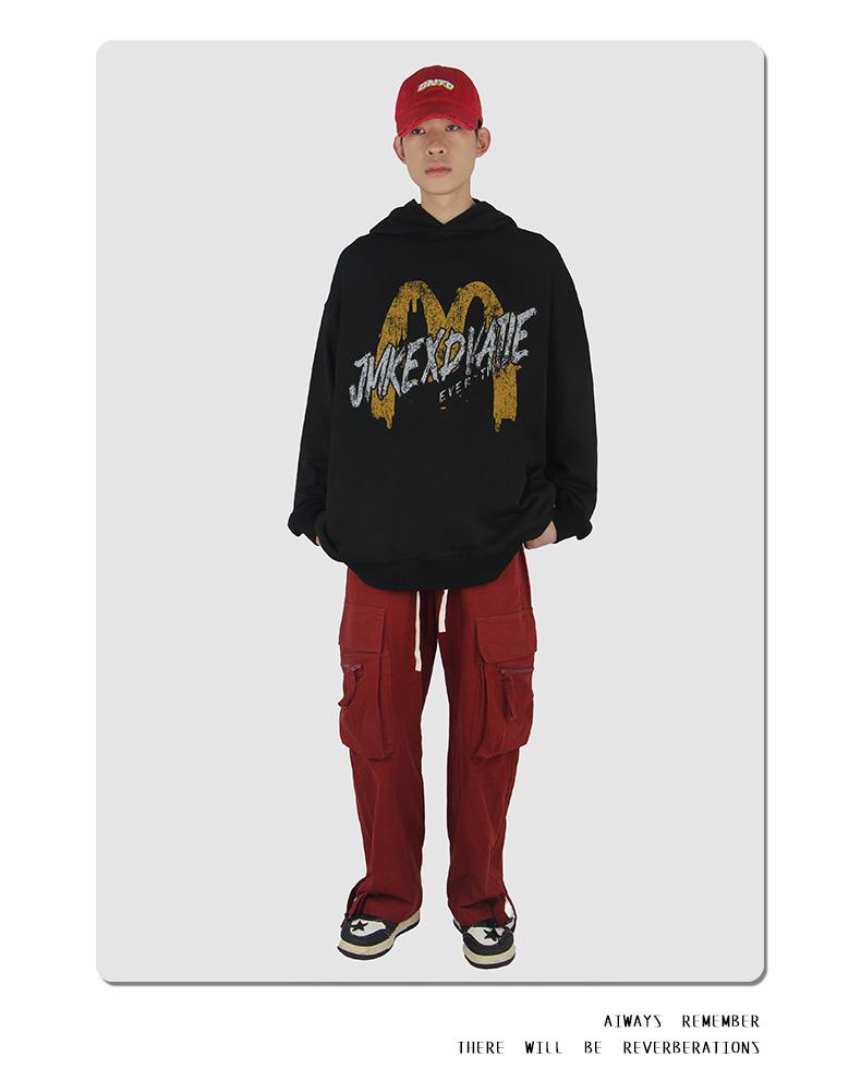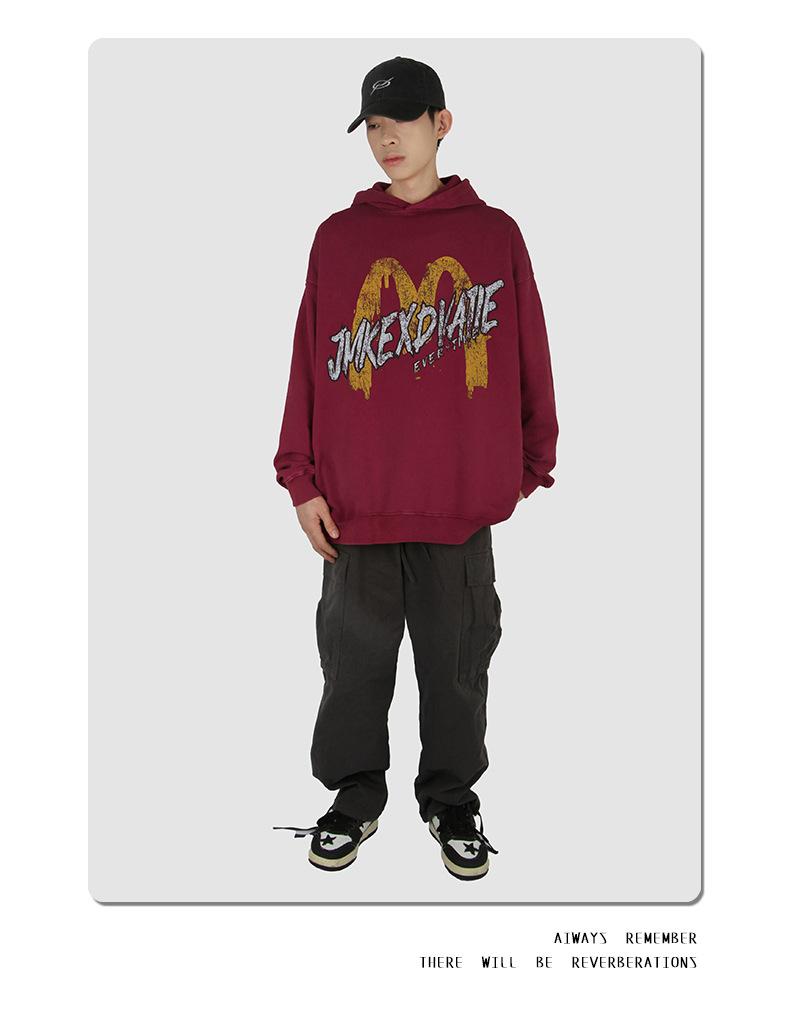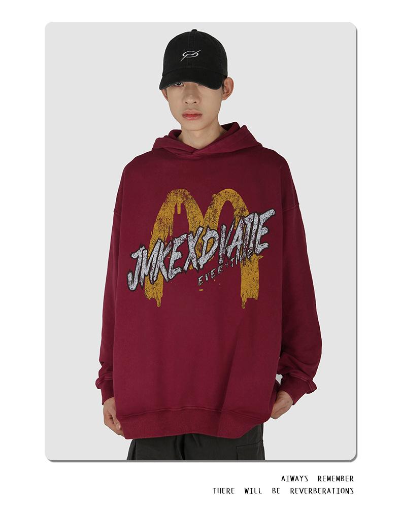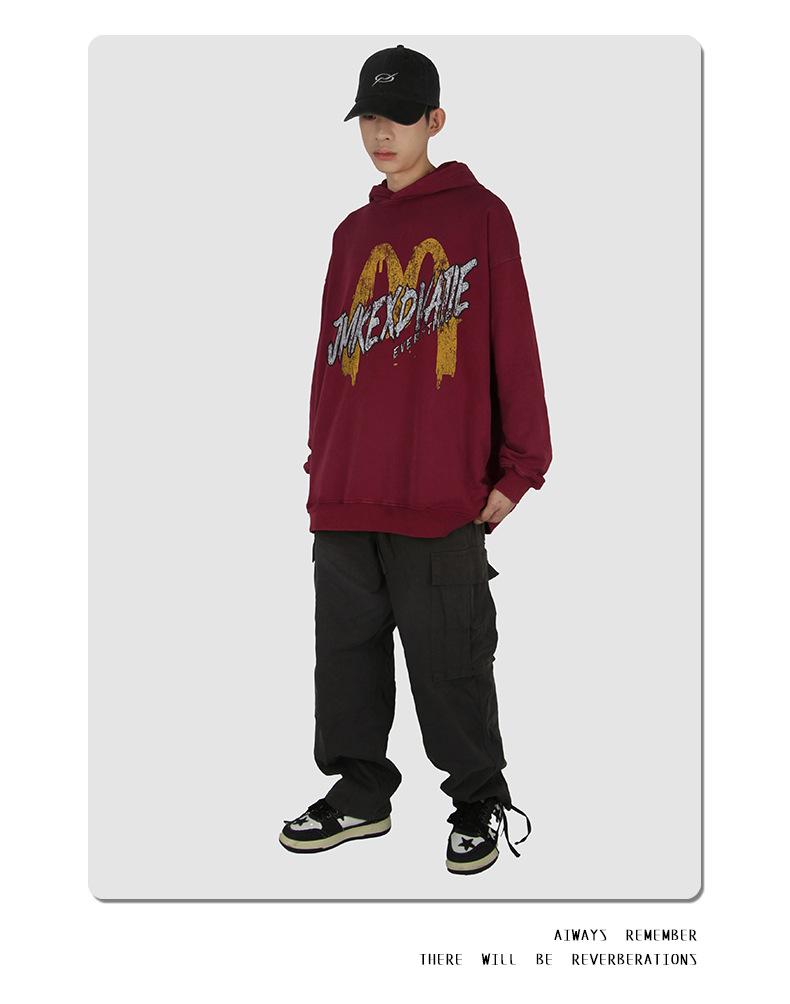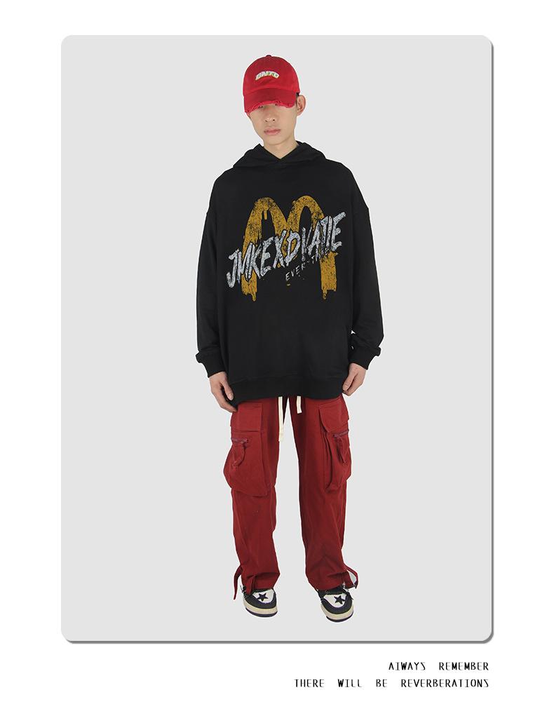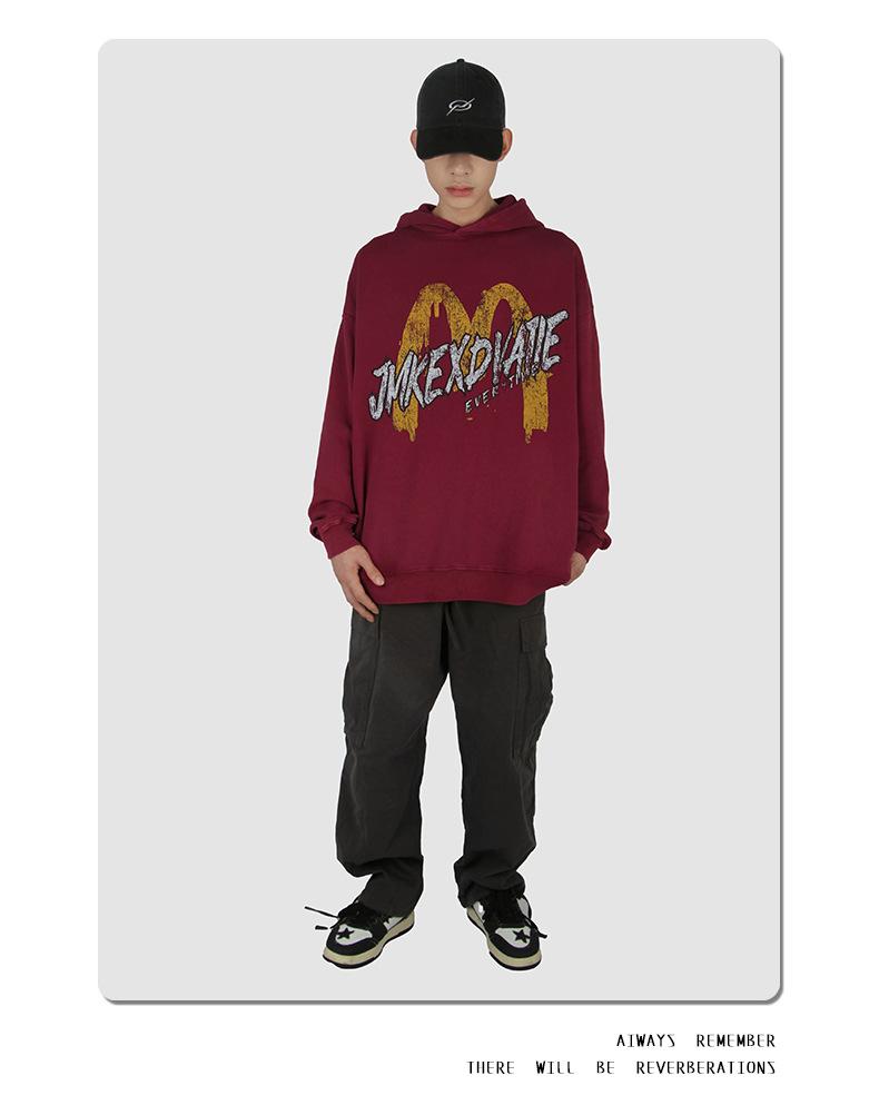 Suéter con capucha desgastado, holgado, estilo perezoso, estampado con la letra M de la marca de moda masculina estadounidense de 400 g