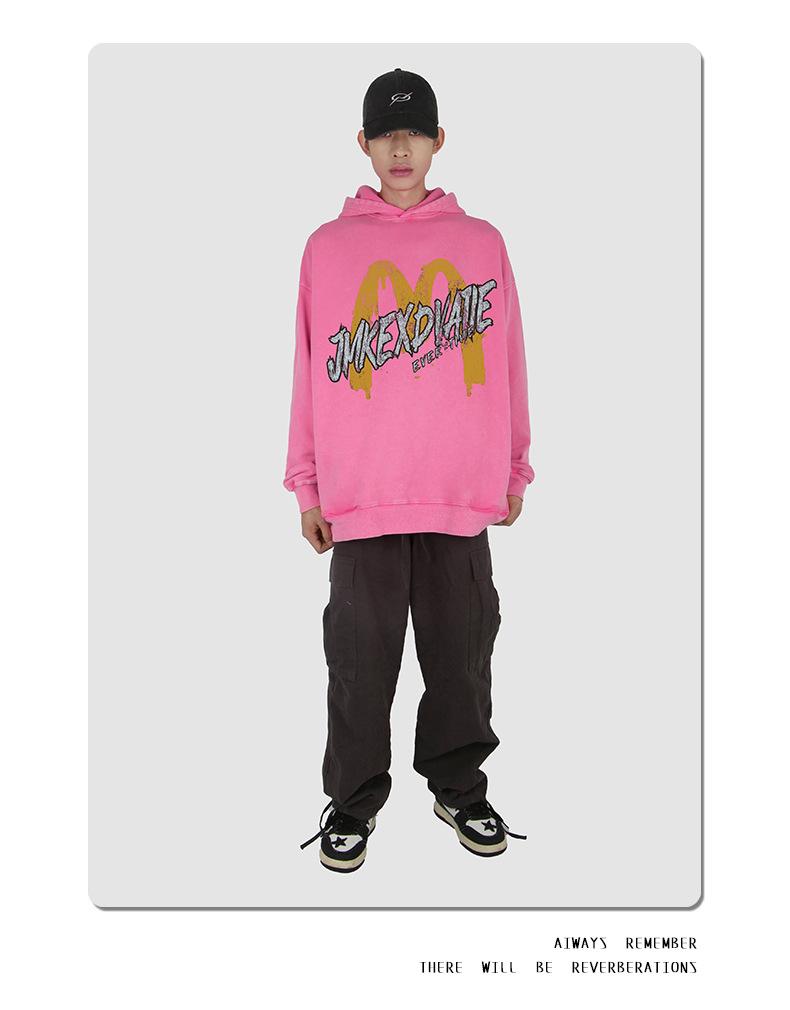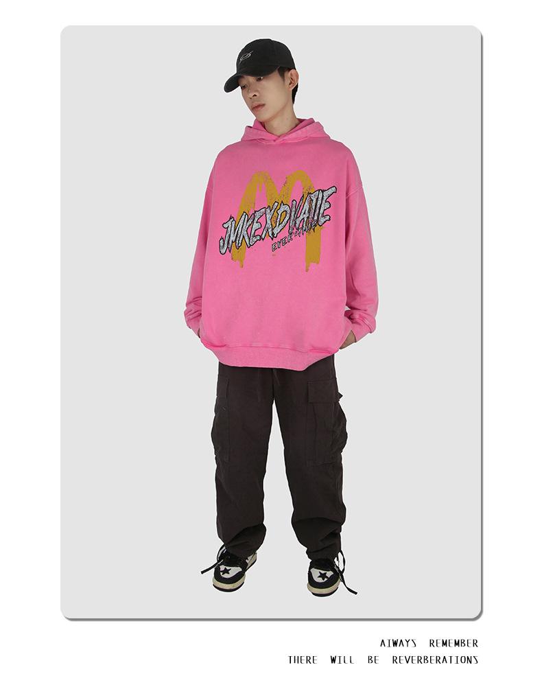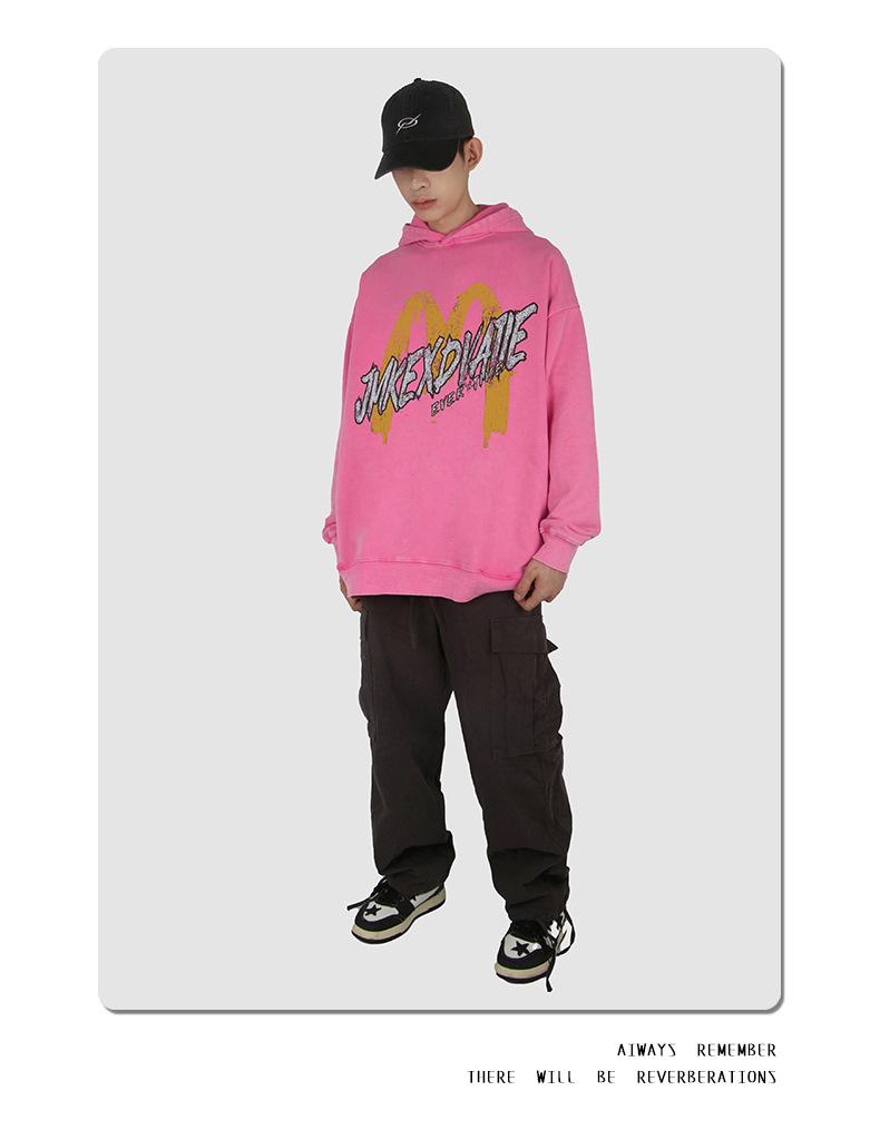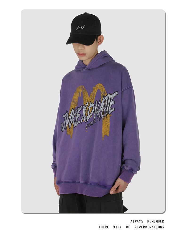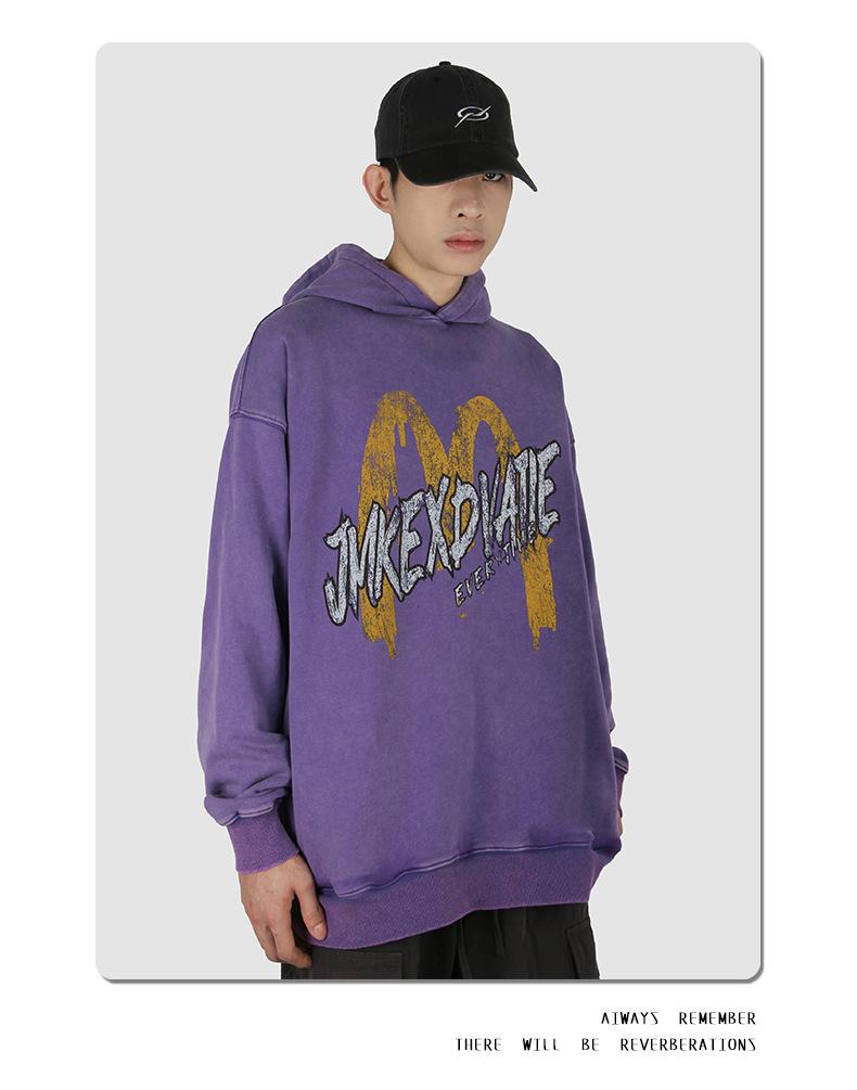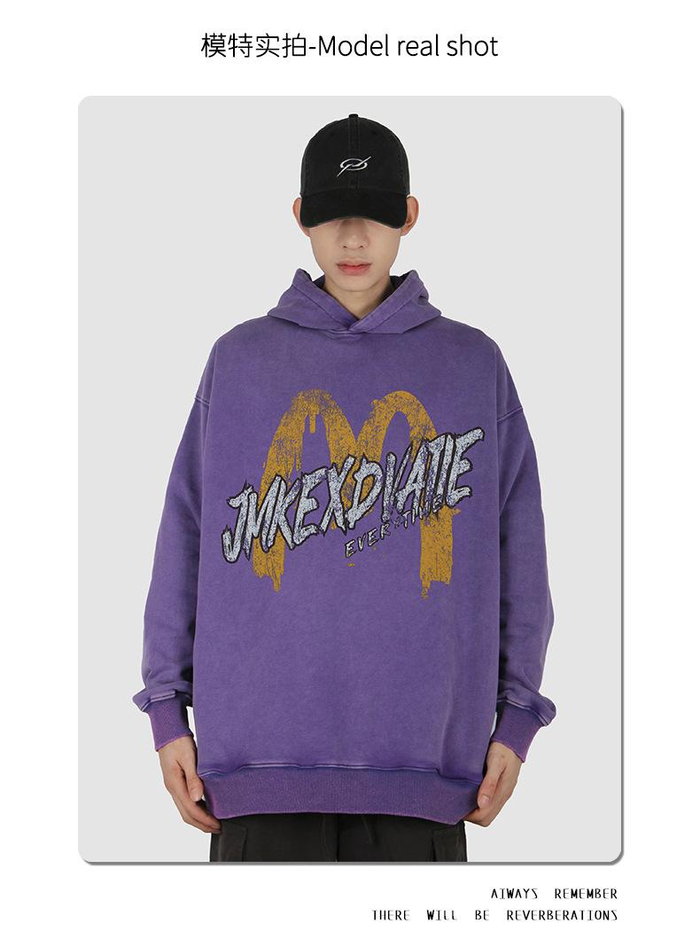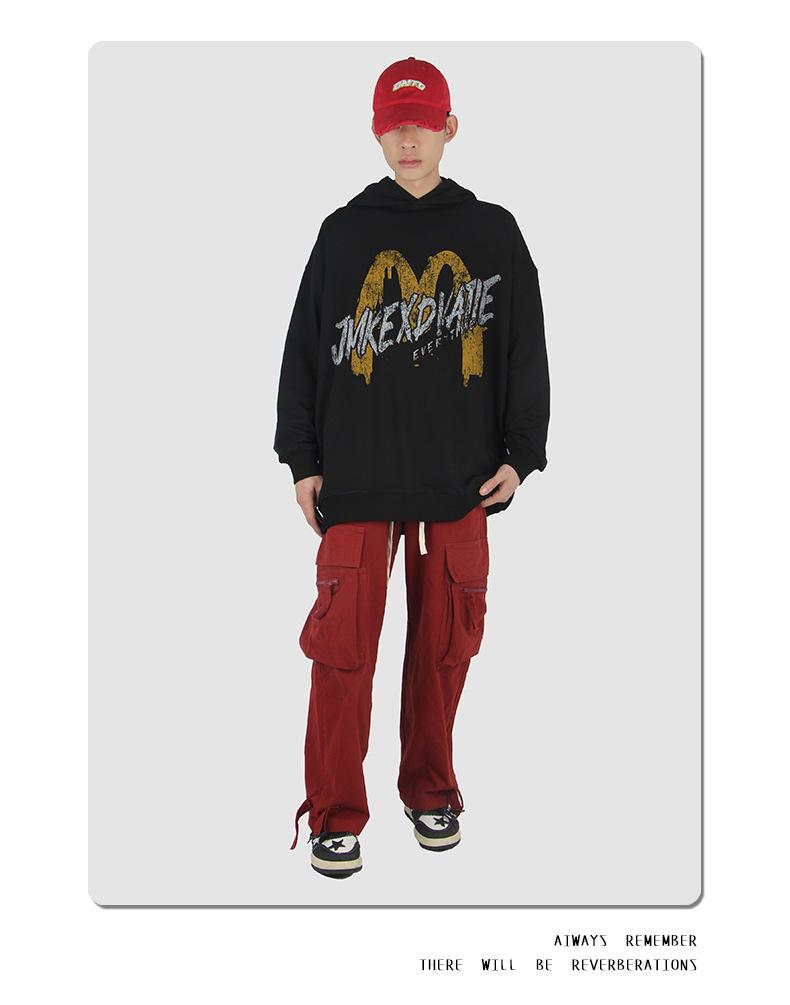 Suéter con capucha desgastado, holgado, estilo perezoso, estampado con la letra M de la marca de moda masculina estadounidense de 400 g