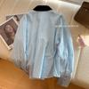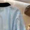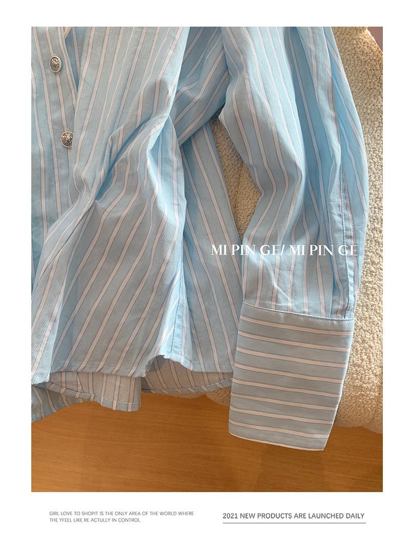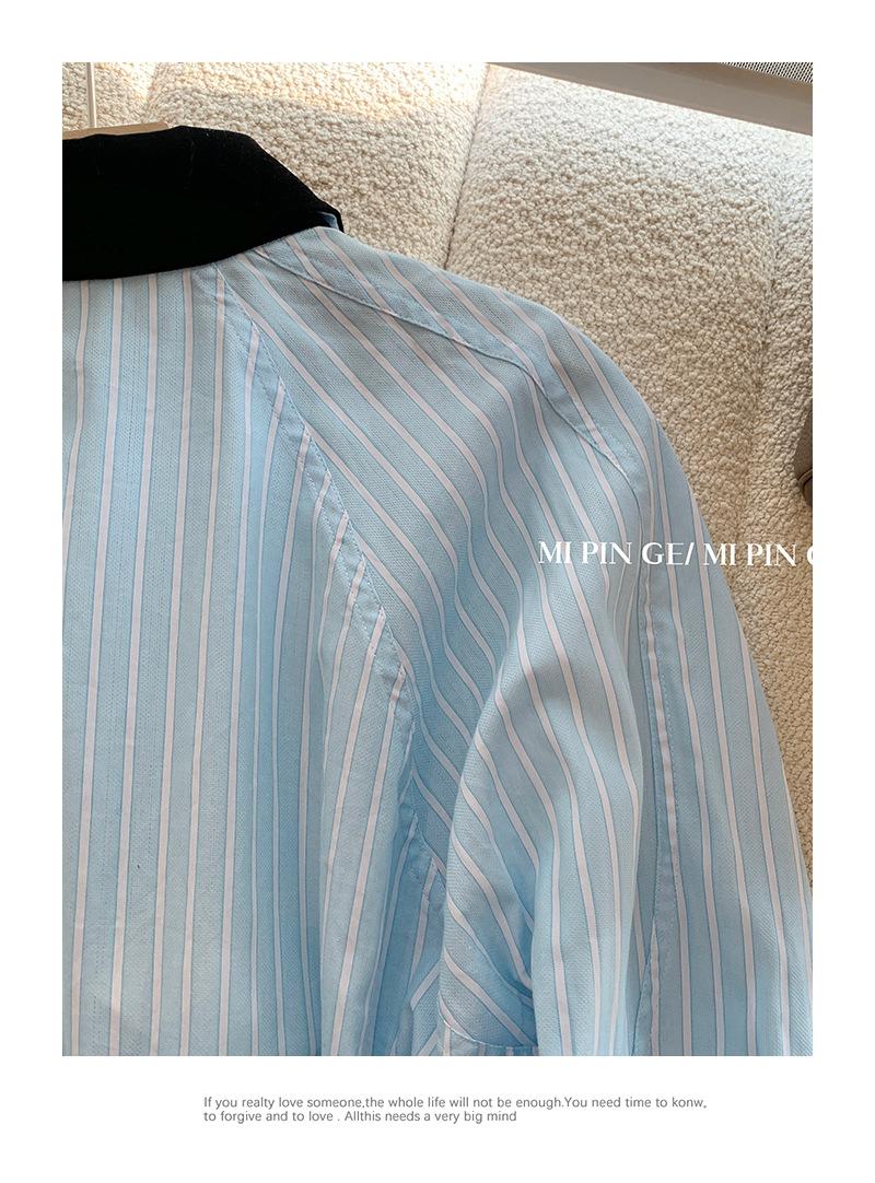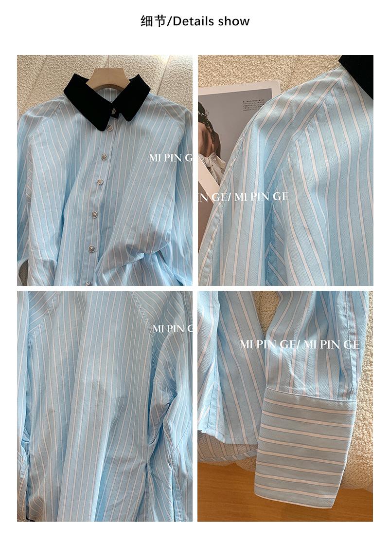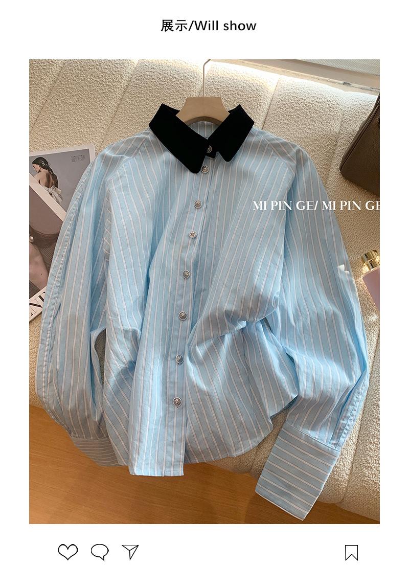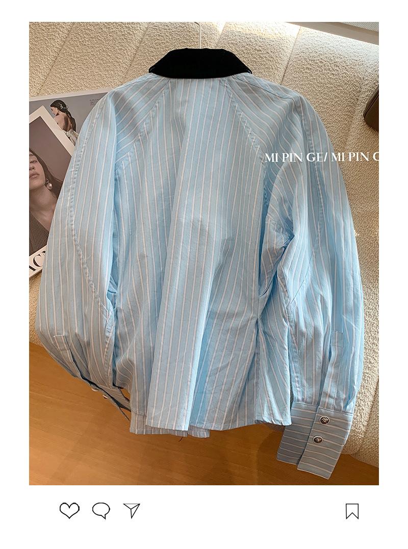 Camisa de Terciopelo con Empalme de Rayas Azules para Mujer Primavera 2025 Nueva Moda Diseño Casual Elegante Camisa Nicho