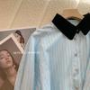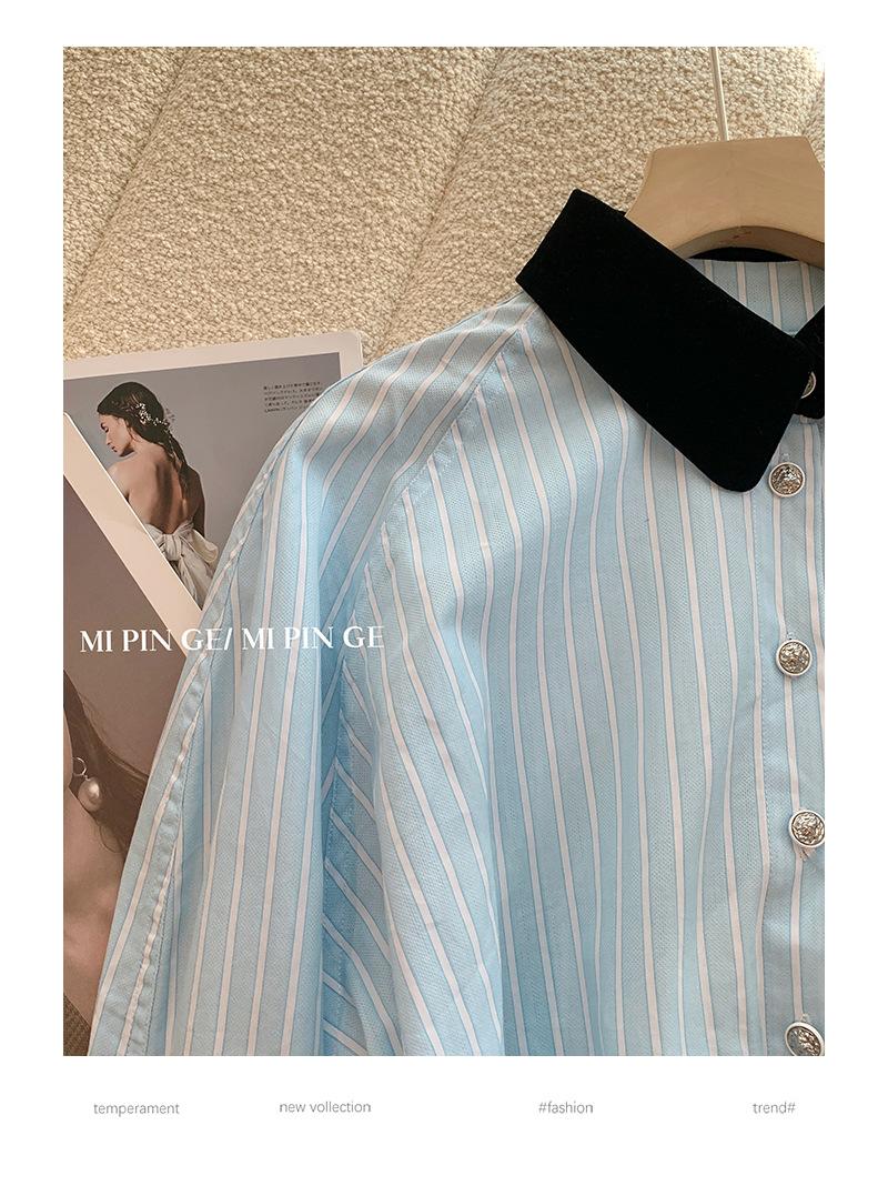 Camisa de terciopelo con cuello a rayas azules para mujer, primavera 2023, nueva moda, diseño de temperamento informal, camisa de nicho