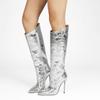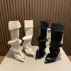Botas altas hasta la rodilla de doble uso con remaches de metal puntiagudos de tacón alto y costura vaquera de comercio exterior, zapatos de mujer de talla grande, novedad de 2024