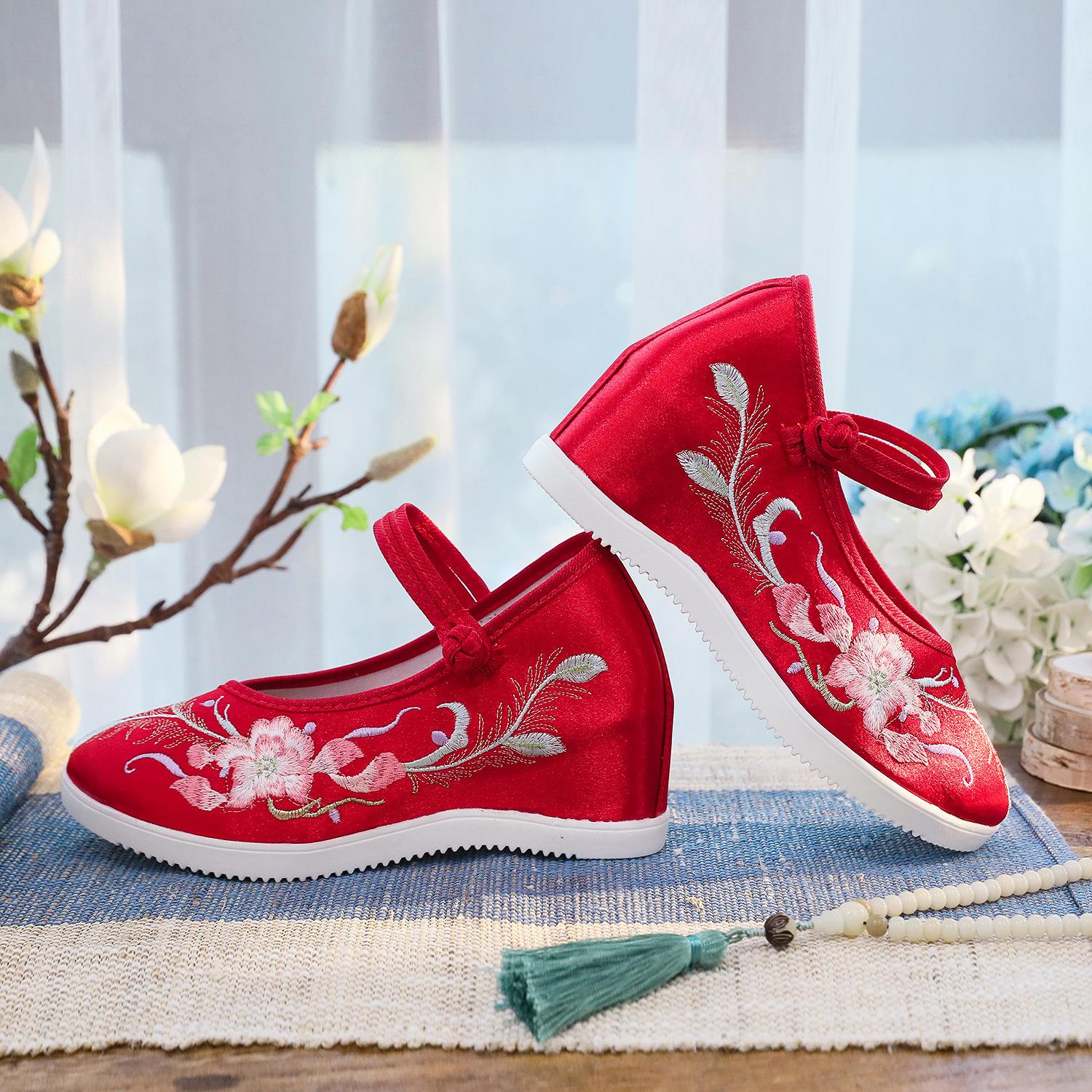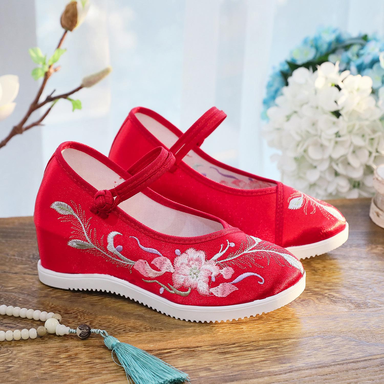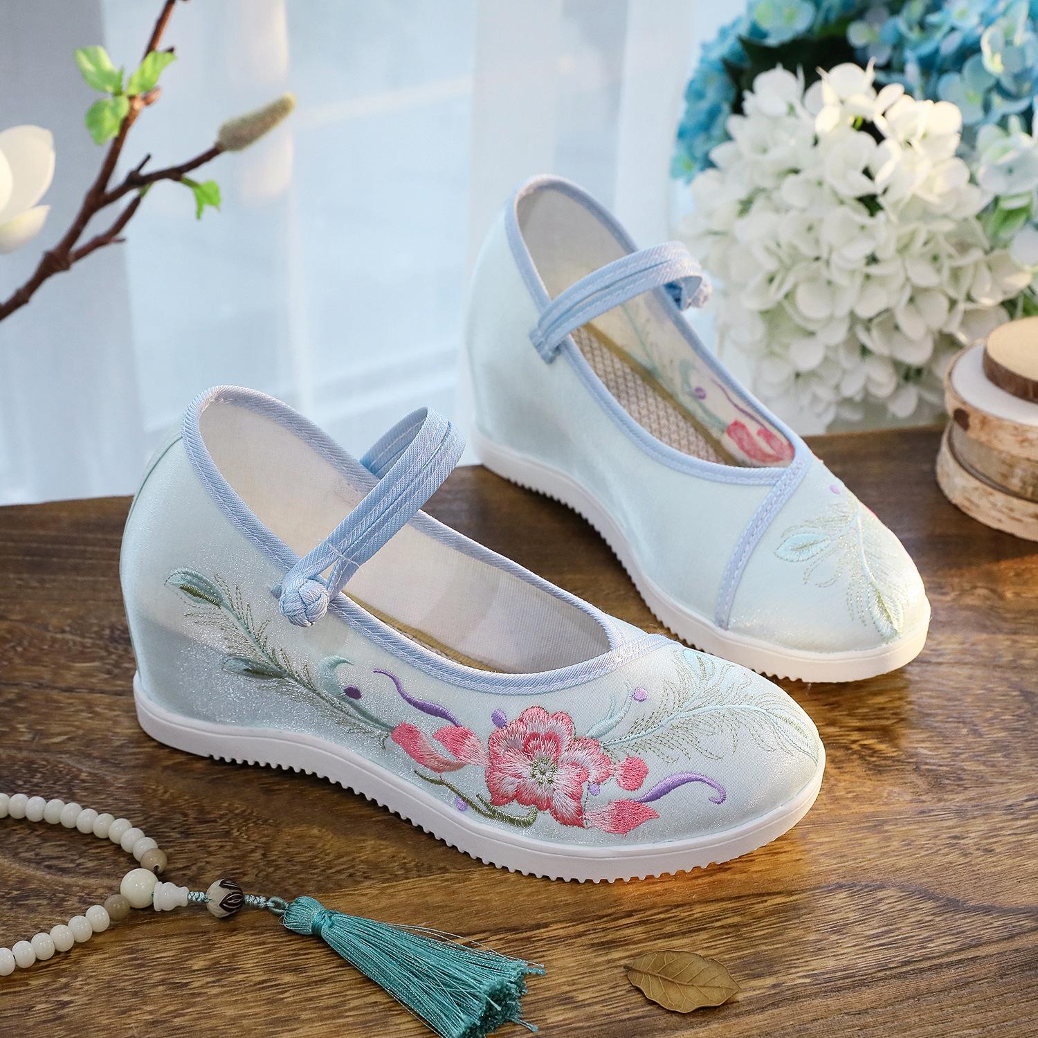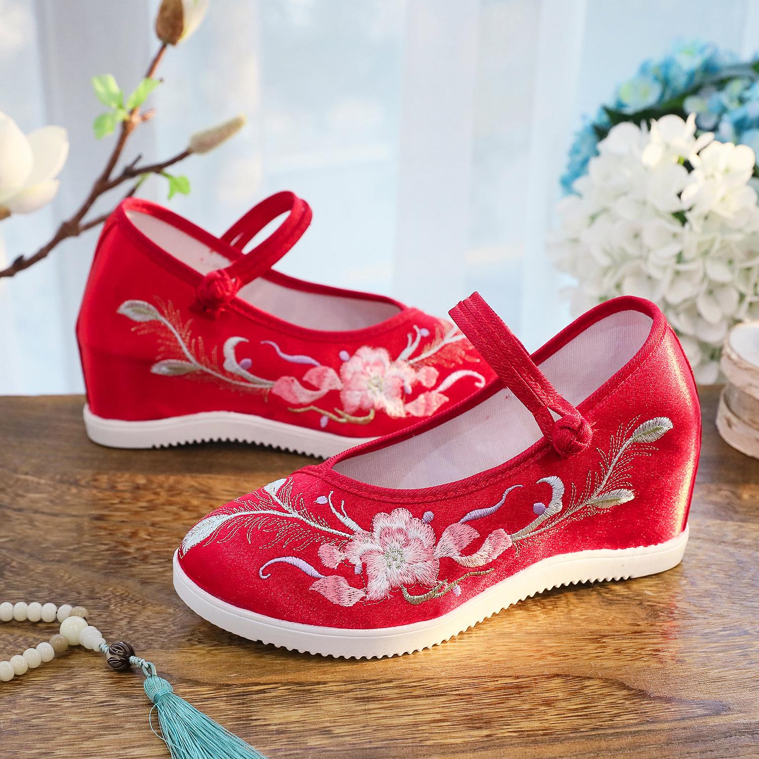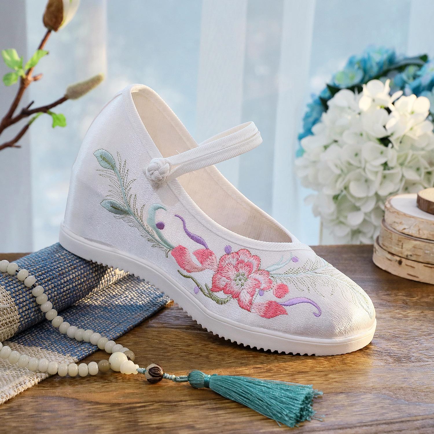 Fengyu 2024 Nuevo Estilo Altura Interior Aumentada Punta Redonda Zapatos de Tela de Pekín Antiguos para Mujer con Tacones Altos de la Dinastía Han y Suelas Gruesas Zapatos Bordados