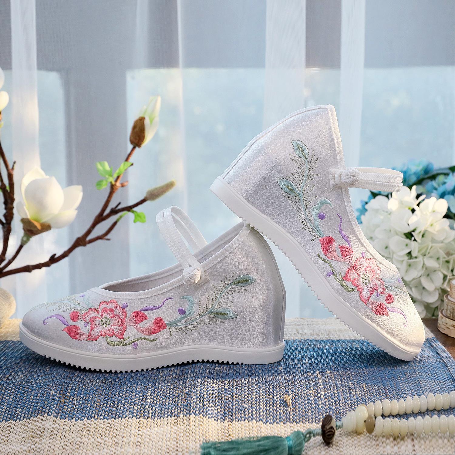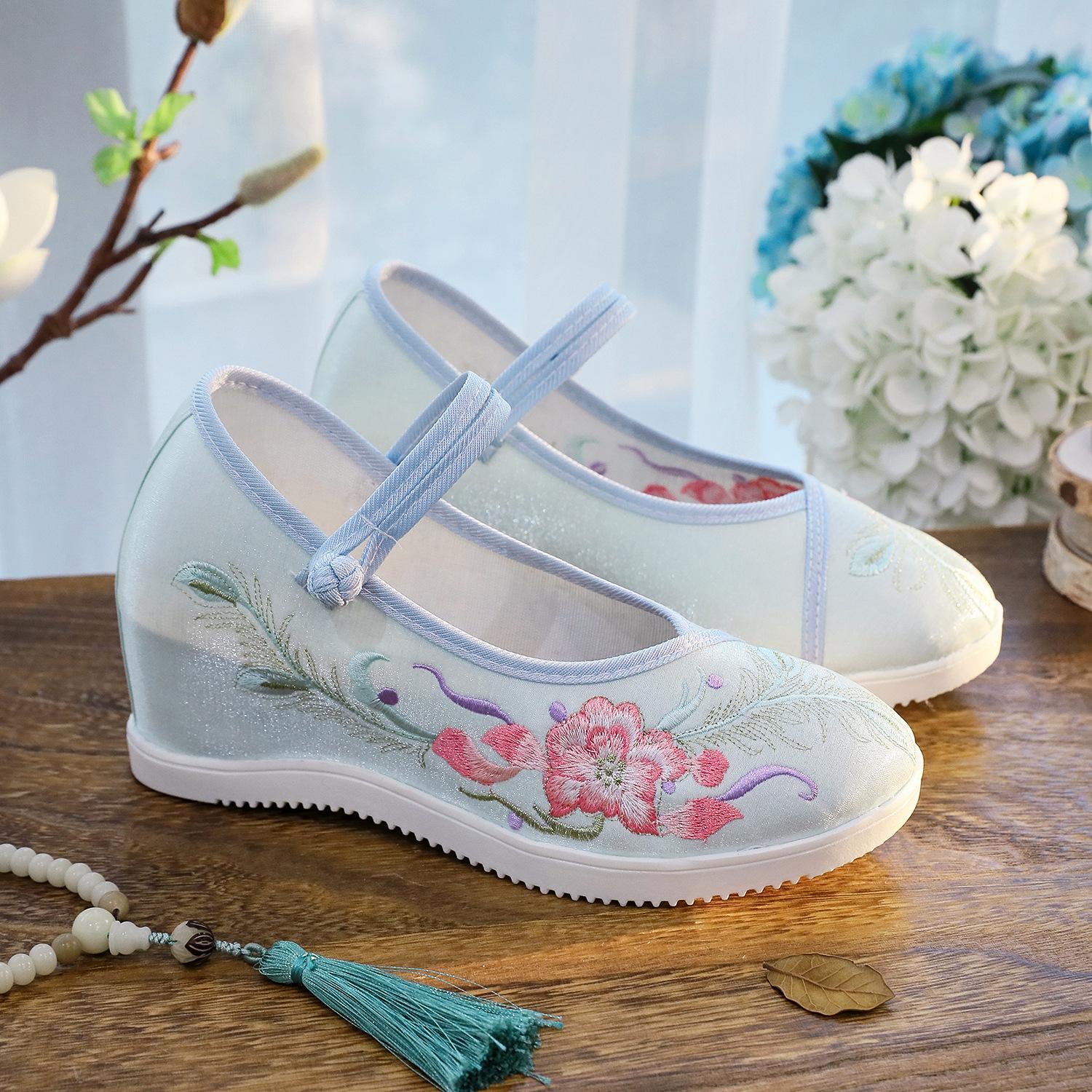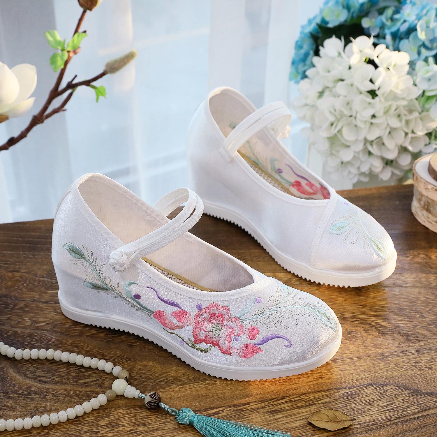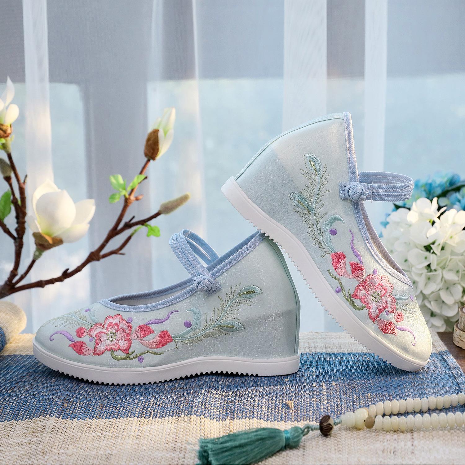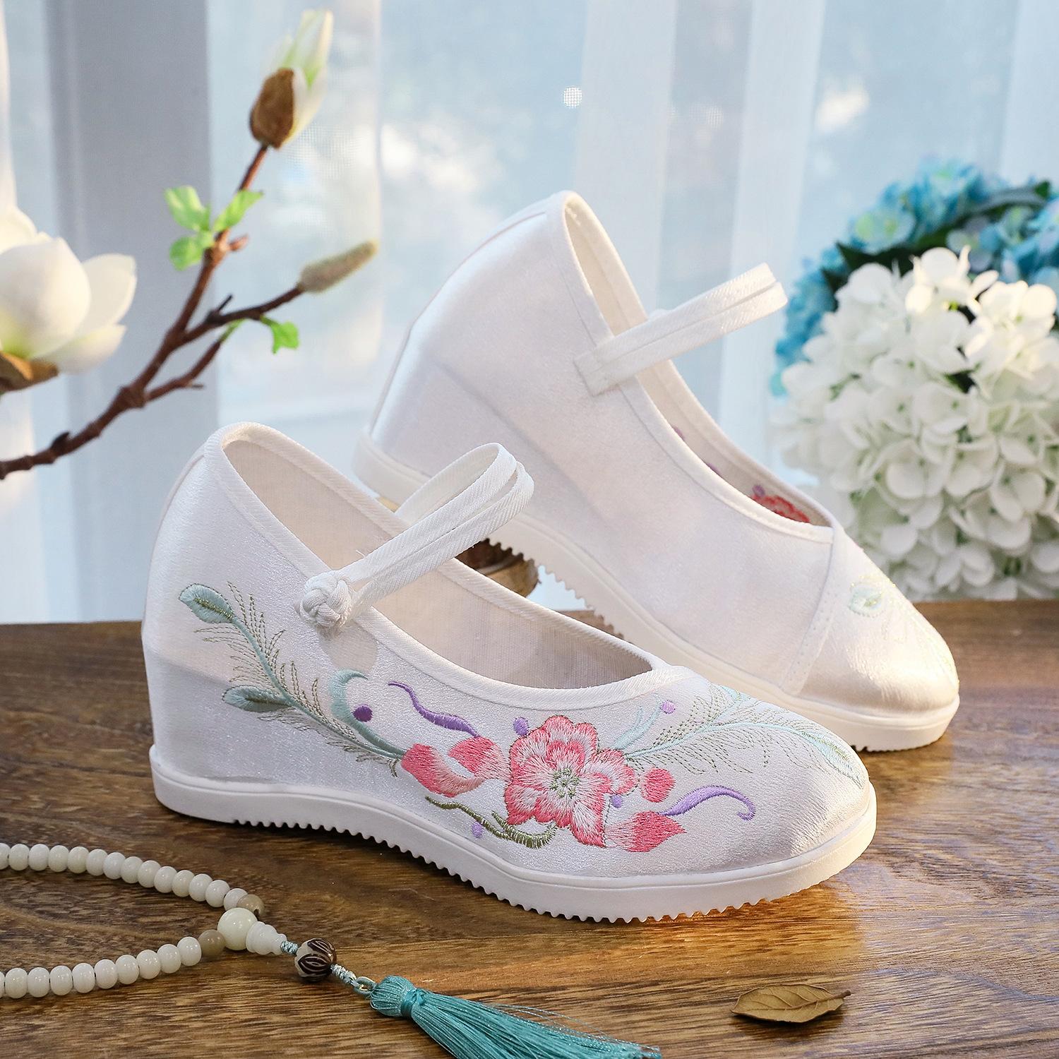 Fengyu 2024 Nuevo Estilo Altura Interior Aumentada Punta Redonda Zapatos de Tela de Pekín Antiguos para Mujer con Tacones Altos de la Dinastía Han y Suelas Gruesas Zapatos Bordados