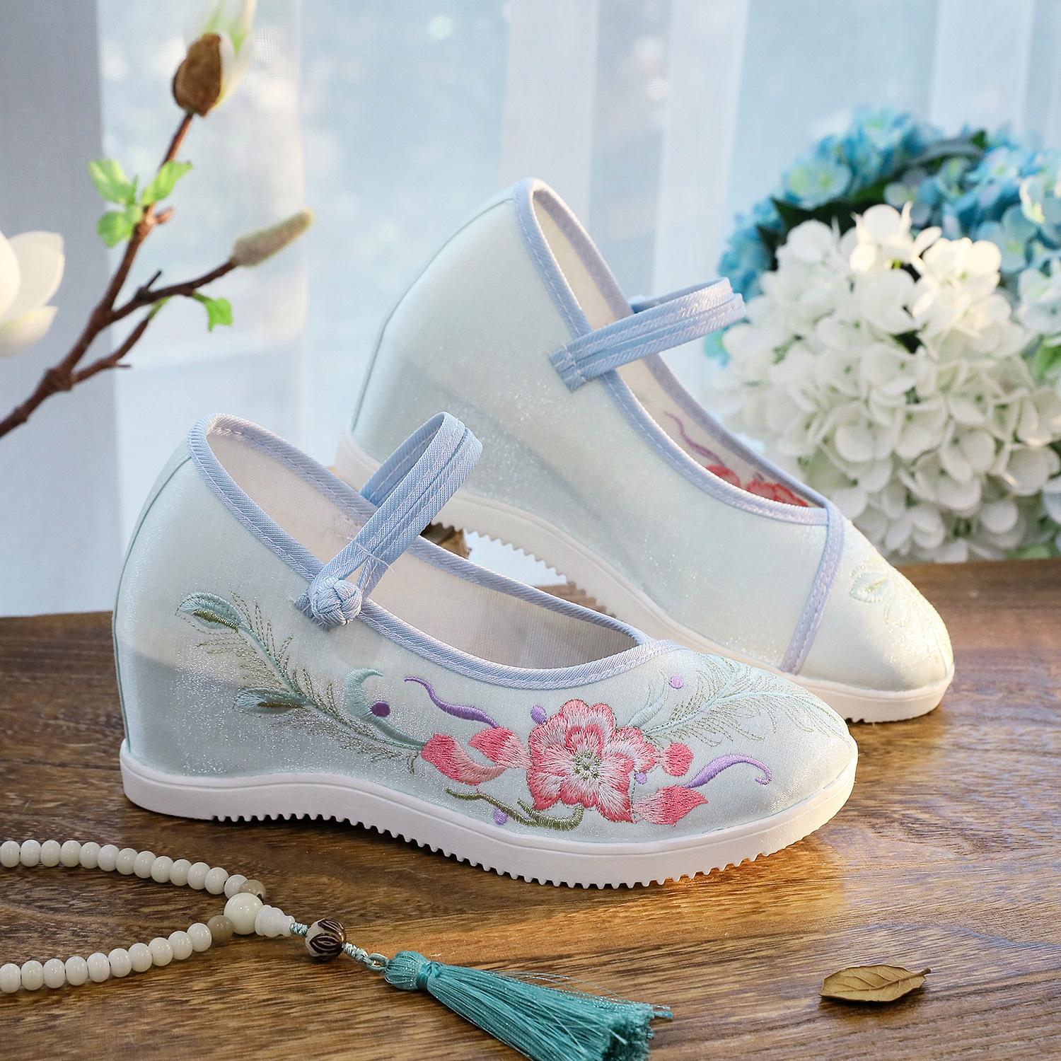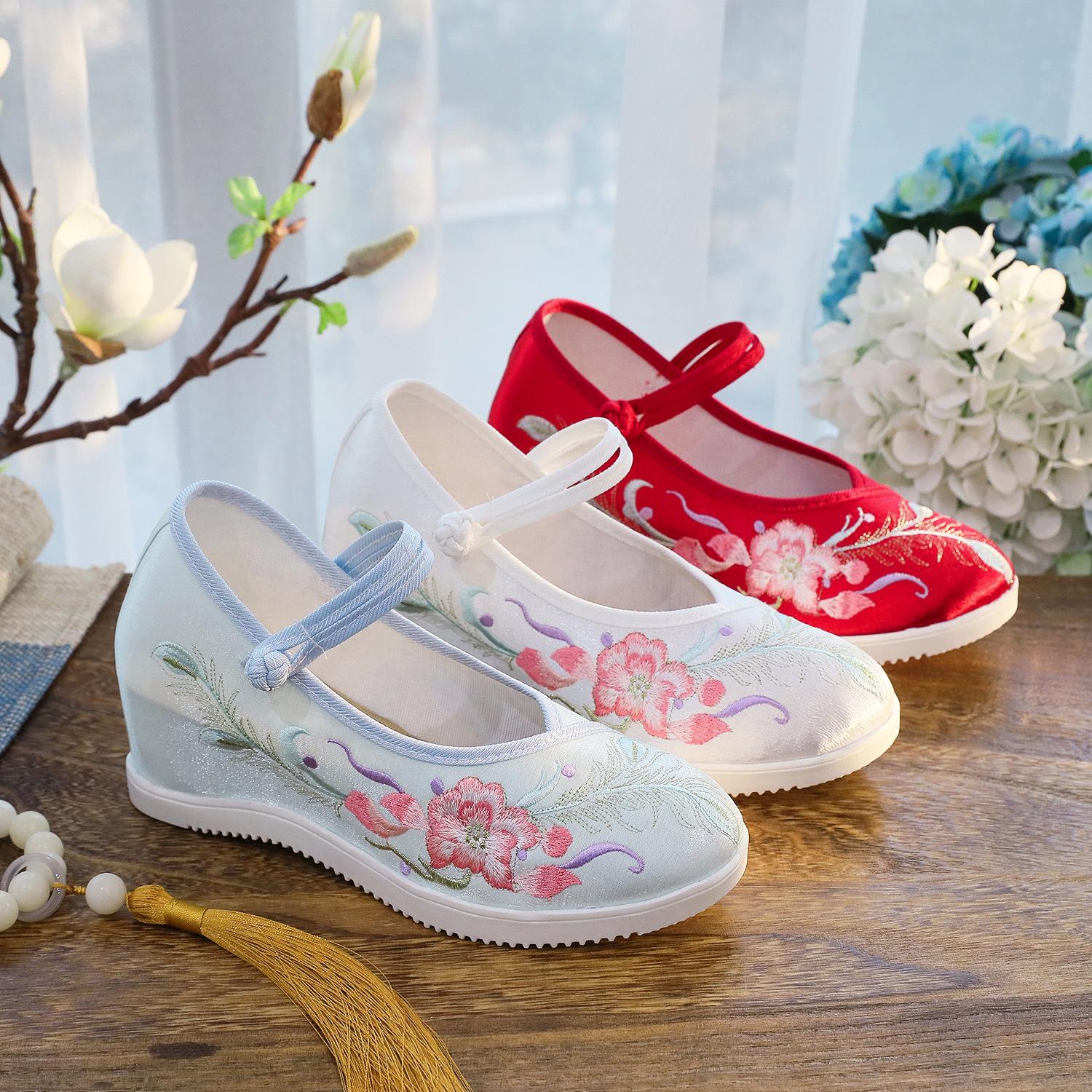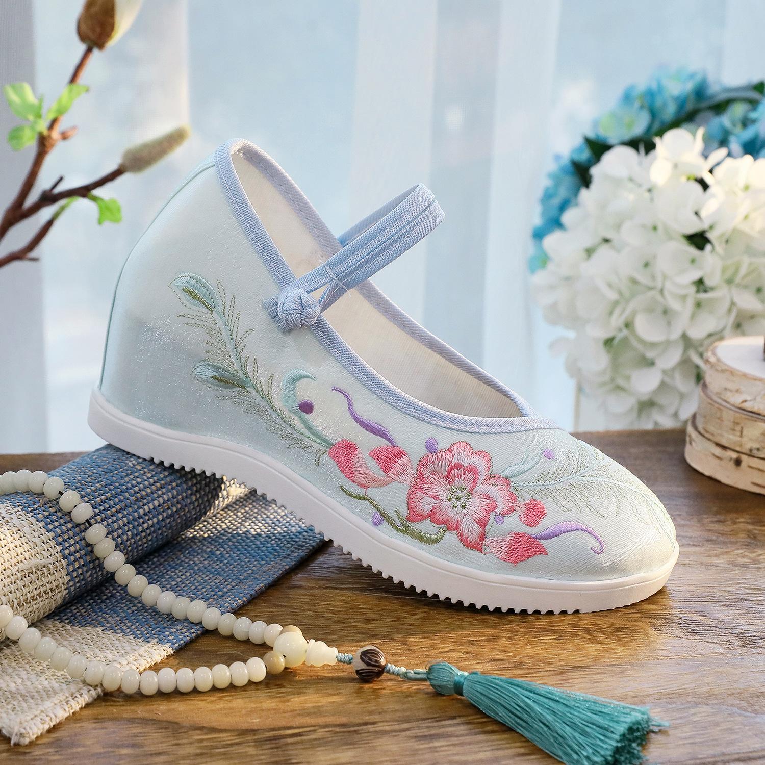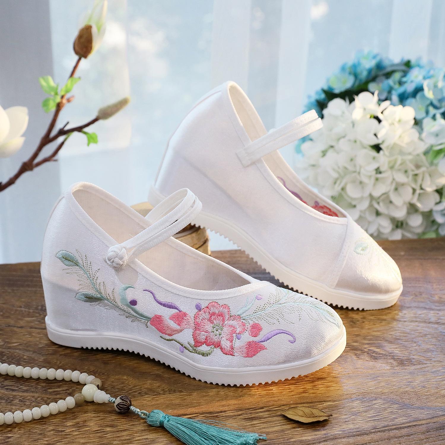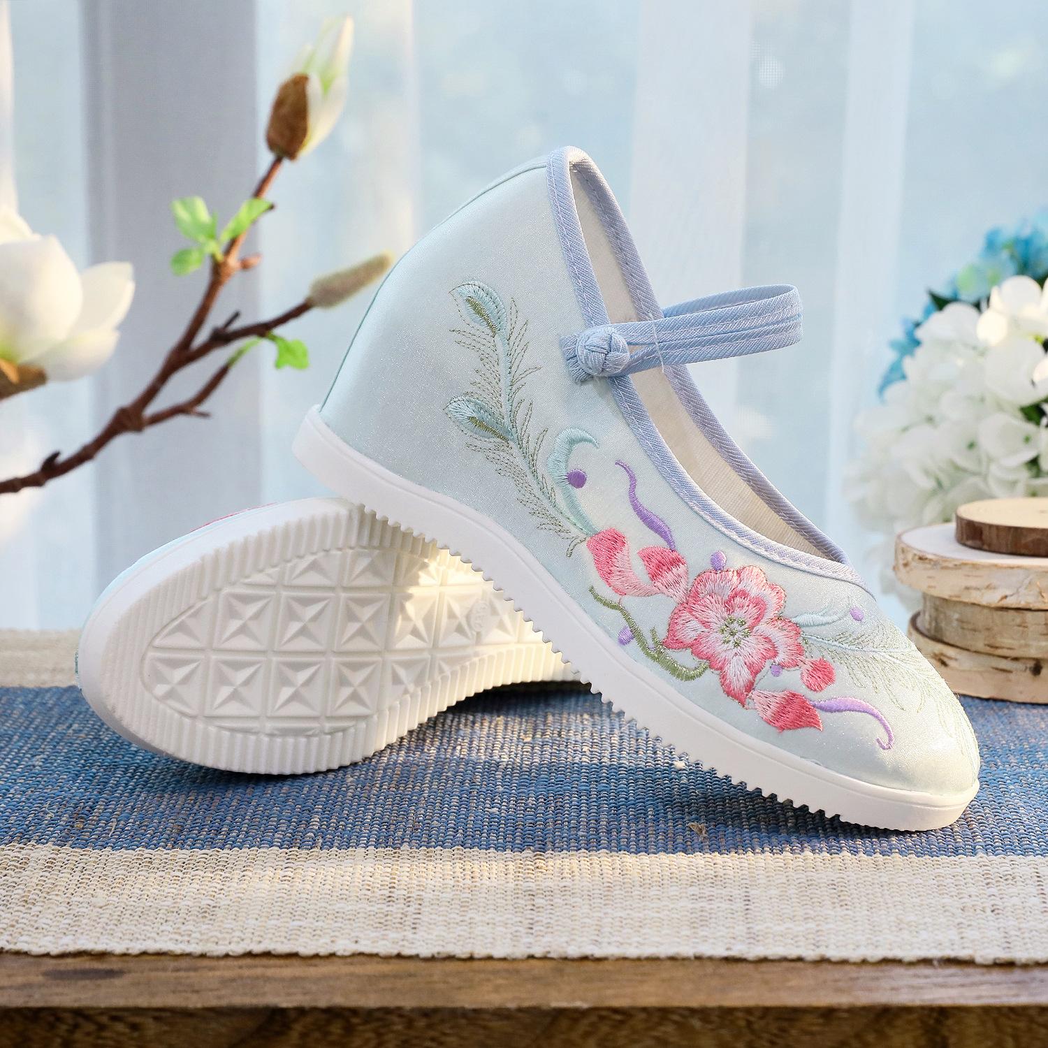 Fengyu 2024 Nuevo Estilo Altura Interior Aumentada Punta Redonda Zapatos de Tela de Pekín Antiguos para Mujer con Tacones Altos de la Dinastía Han y Suelas Gruesas Zapatos Bordados