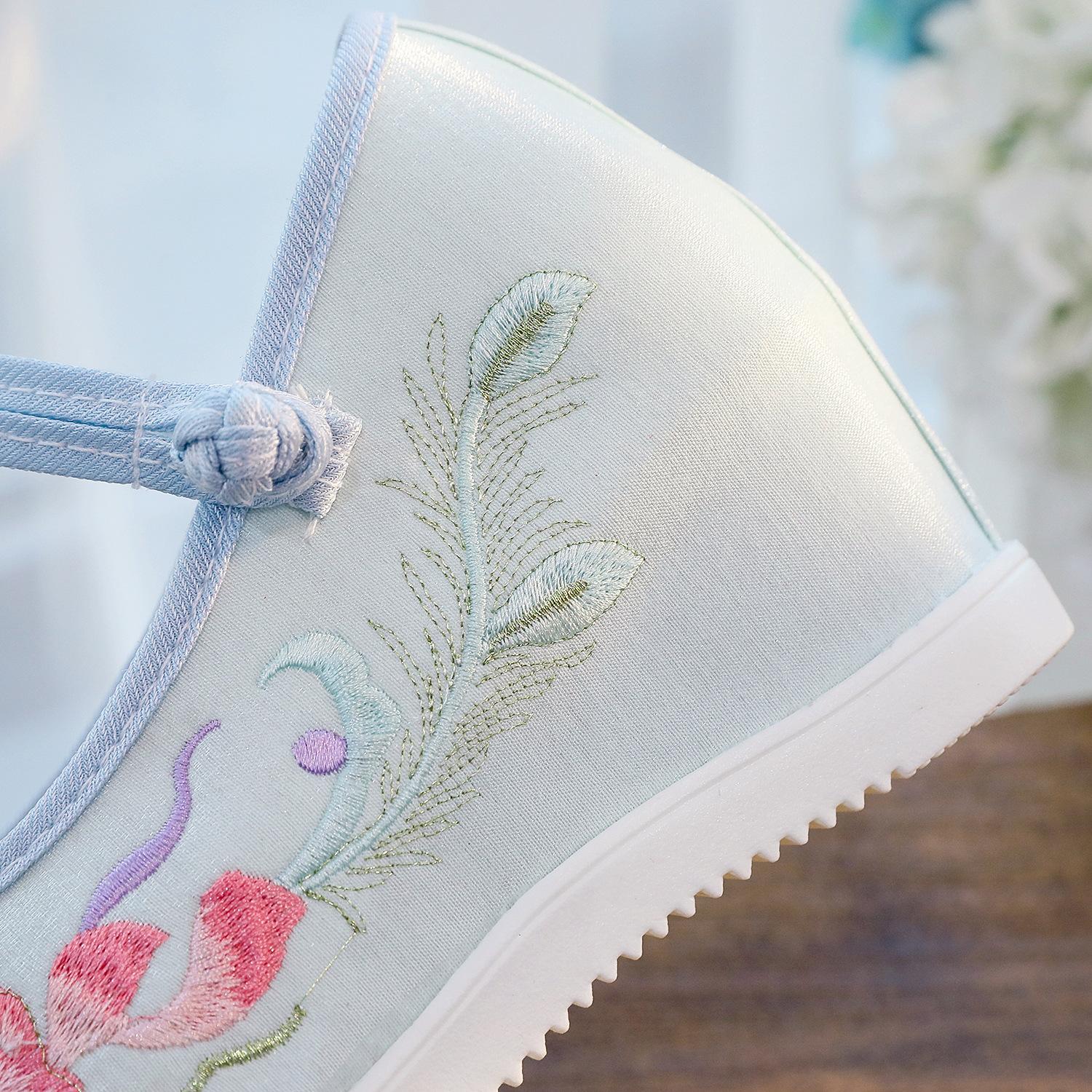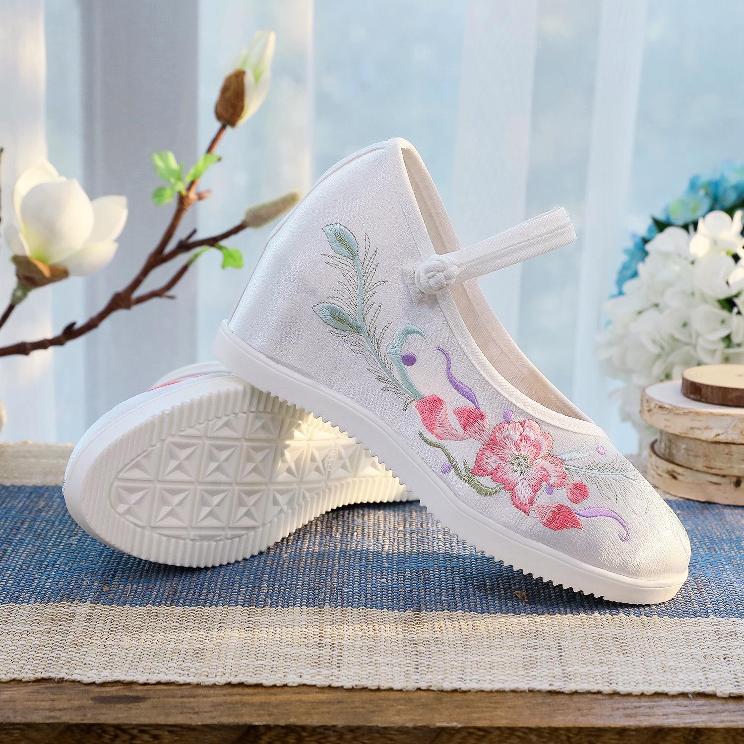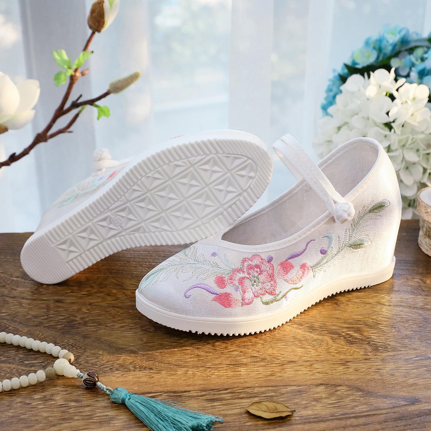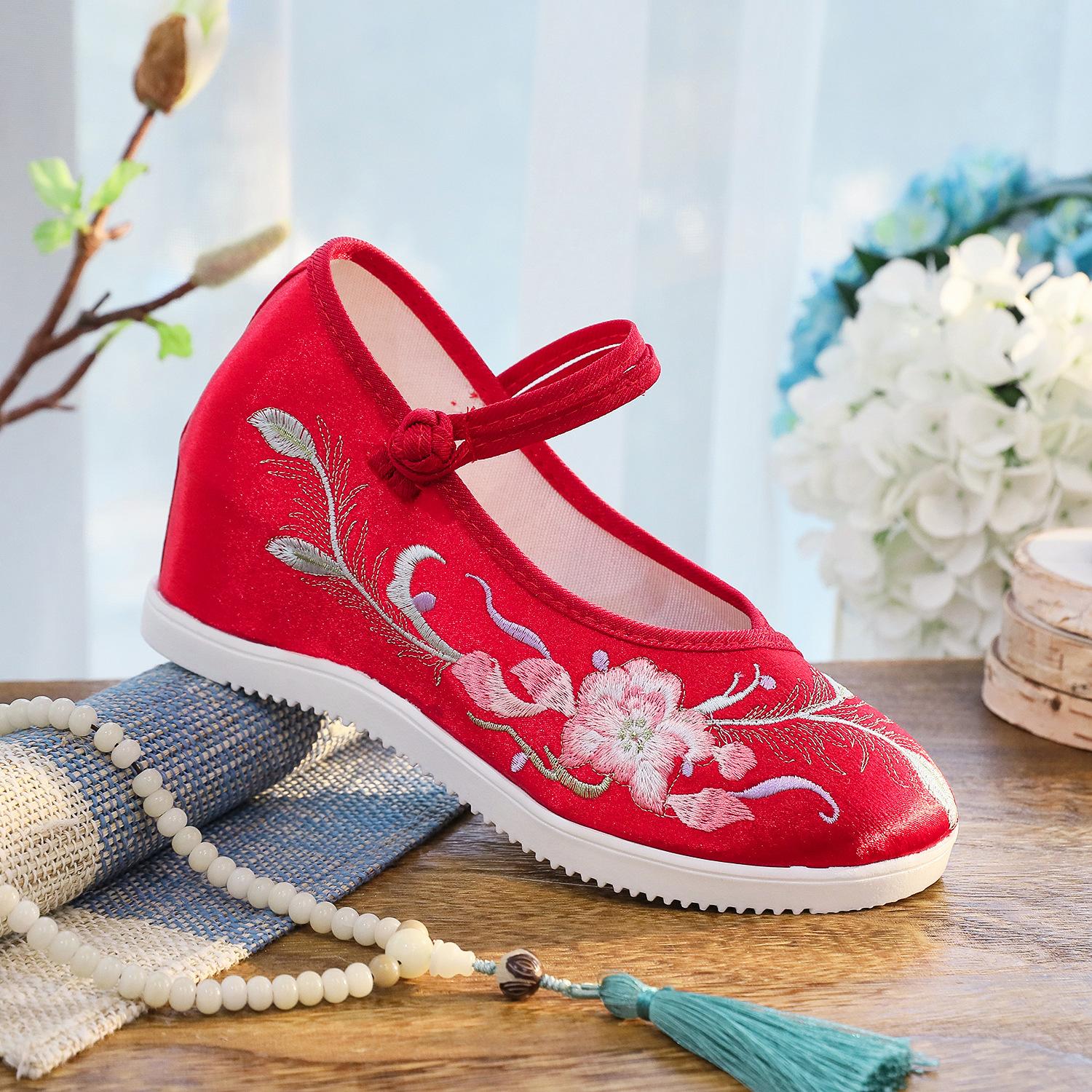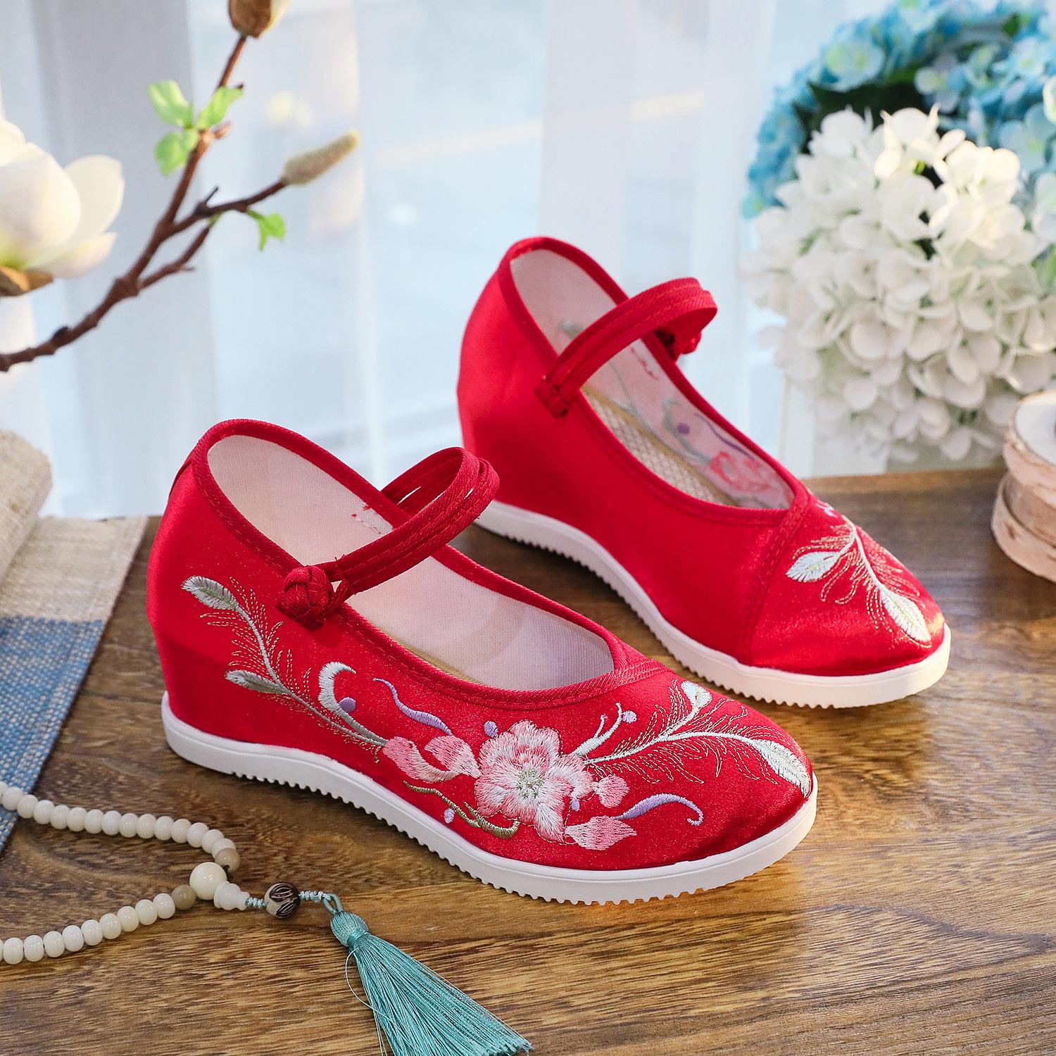 Fengyu 2024 Nuevo Estilo Altura Interior Aumentada Punta Redonda Zapatos de Tela de Pekín Antiguos para Mujer con Tacones Altos de la Dinastía Han y Suelas Gruesas Zapatos Bordados