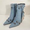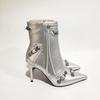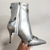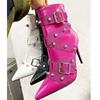 Botas cortas de pasarela para mujer, de talla grande, con tacón fino puntiagudo y cremallera lateral, con remaches y hebilla, color dorado, para comercio exterior, 2024