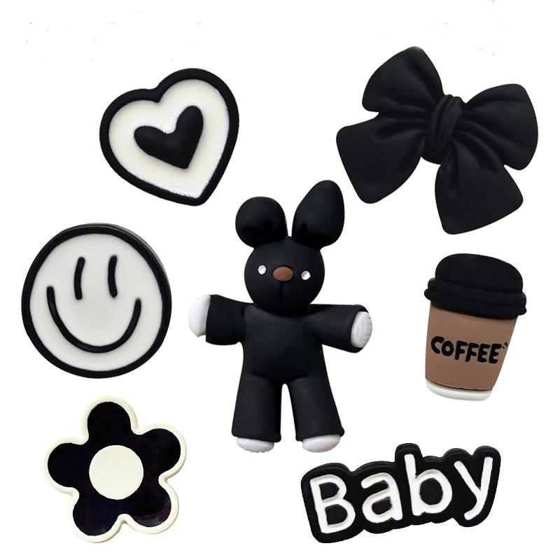 One little black bear [stick buckle delivery]], One black butterfly, One black coffee cup, One beige and black...