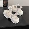 Sandalias de mujer con falda, novedad de verano 2023, sandalias de tacón grueso versátiles para exteriores, estilo hada, zapatos de playa de fondo suave con perlas