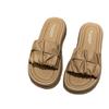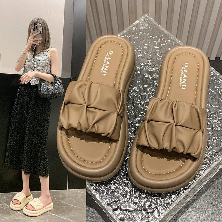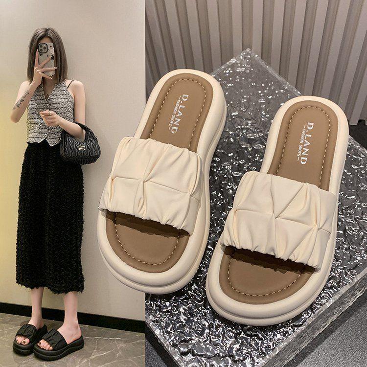 Pantuflas de Verano para Mujer para Uso Exterior 2025 Nuevo Estilo Coreano Plisadas de Suela Gruesa Slip-On Versátiles Zapatos Planos de Playa