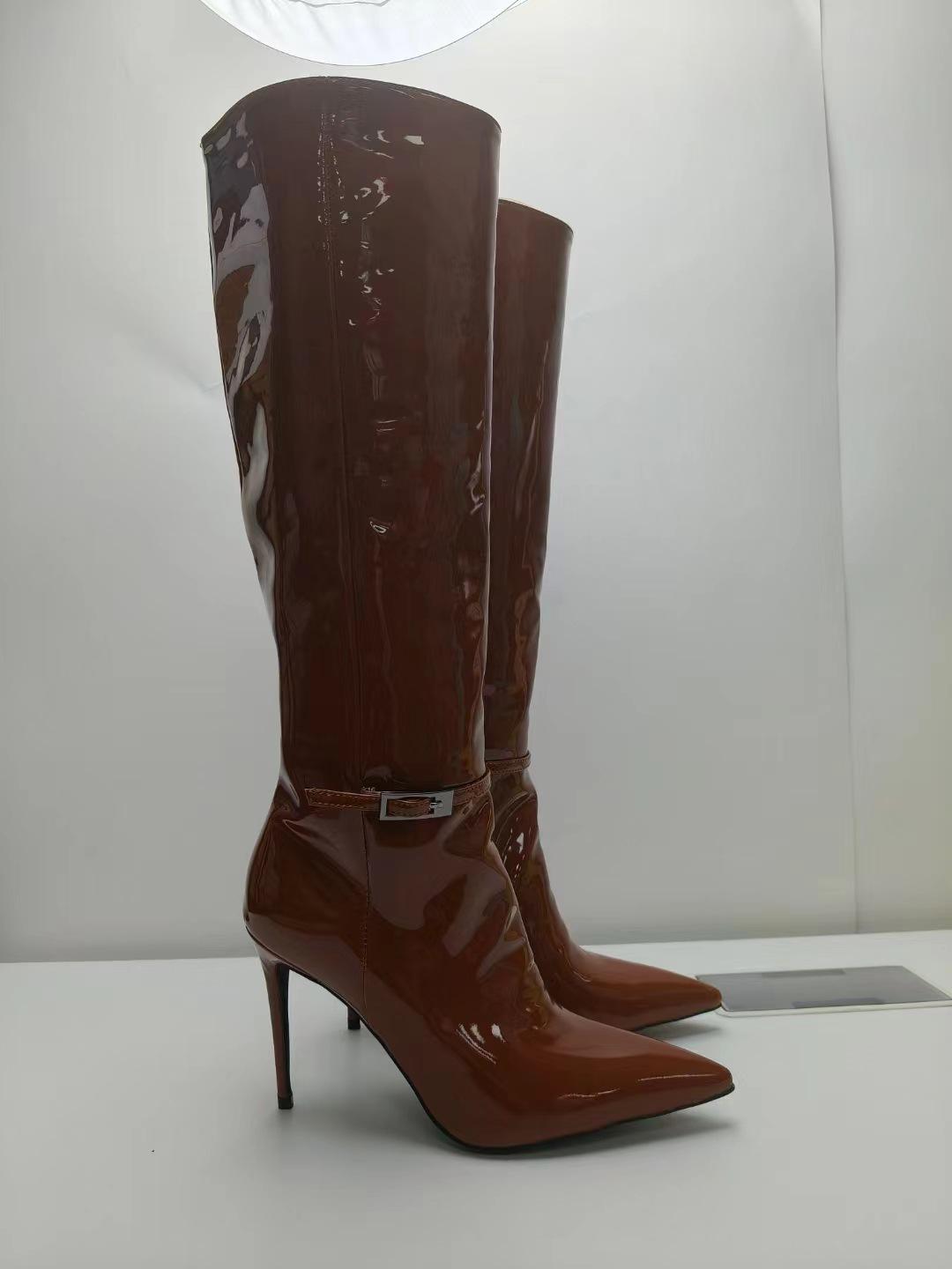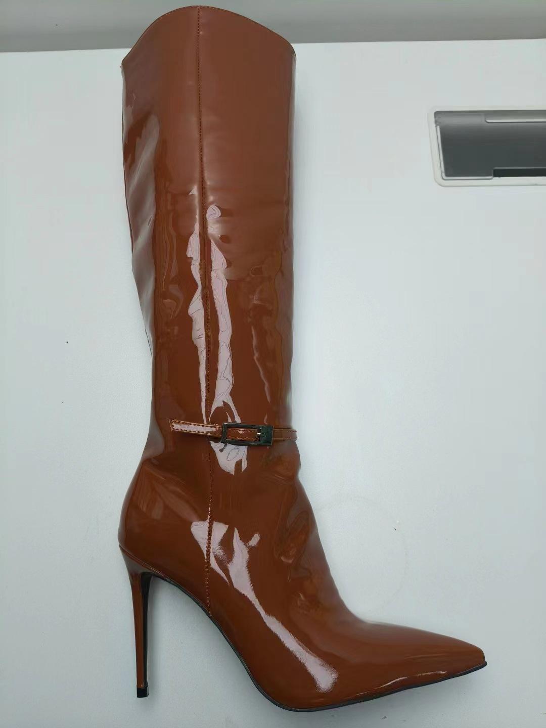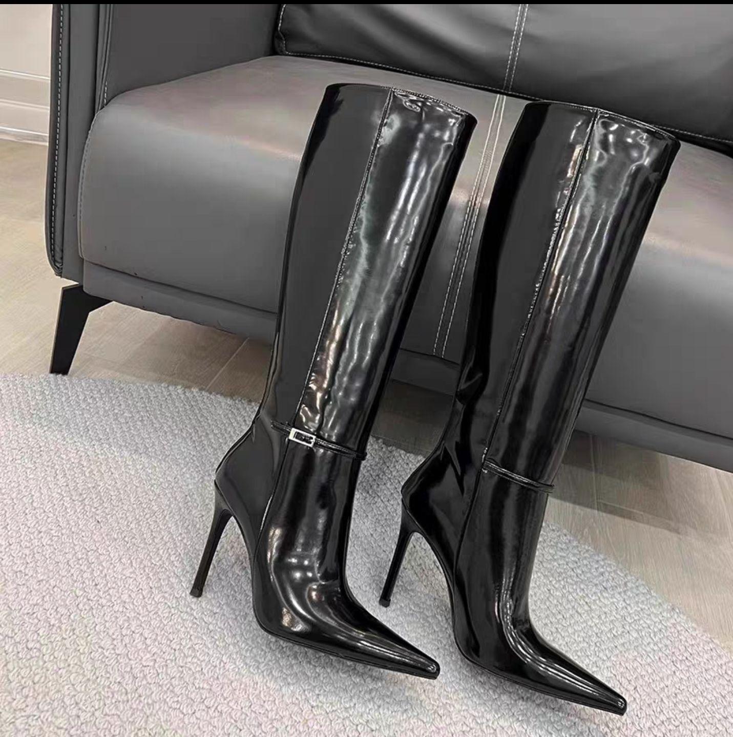 Botas de tacón alto de charol de comercio exterior 2024, nuevas, para mujer, puntiagudas, sexys, hasta la rodilla, botas largas de moda que combinan con todo.