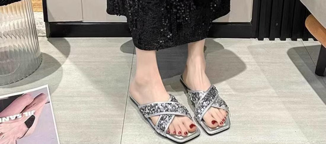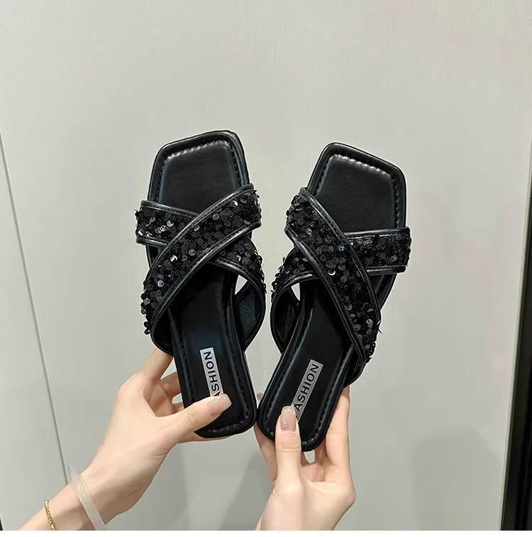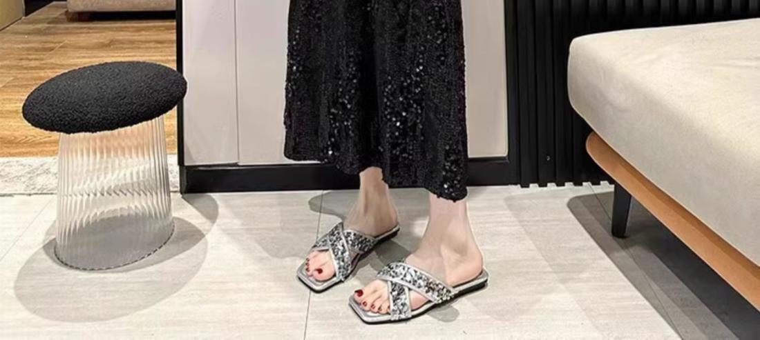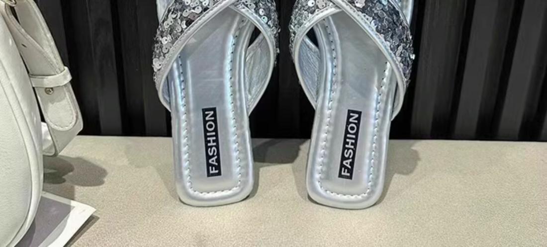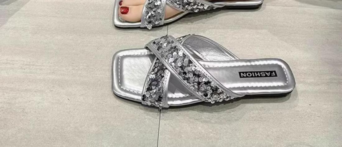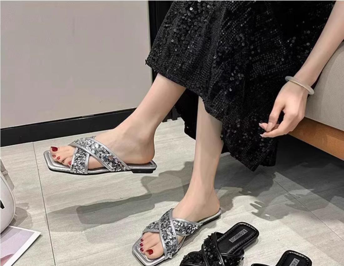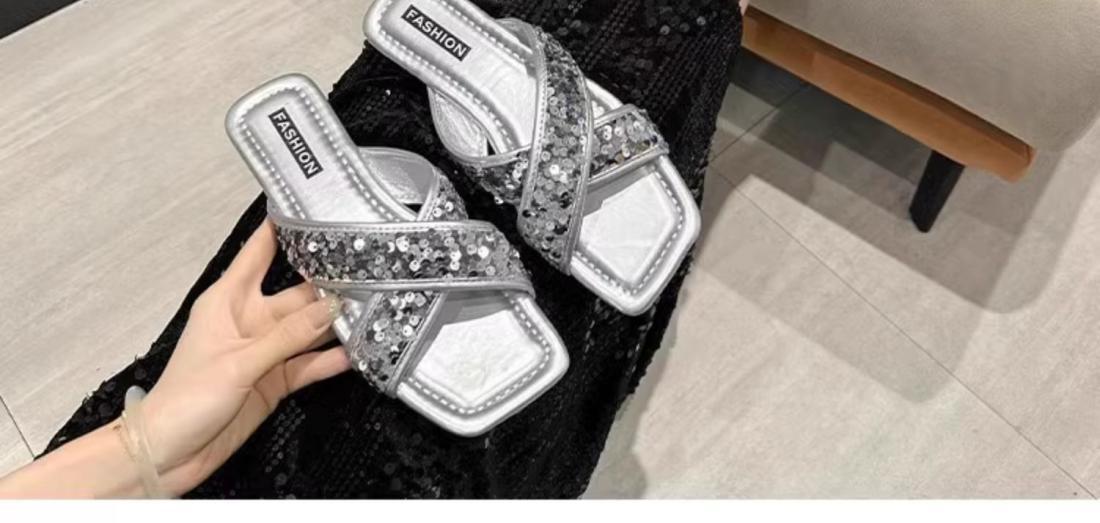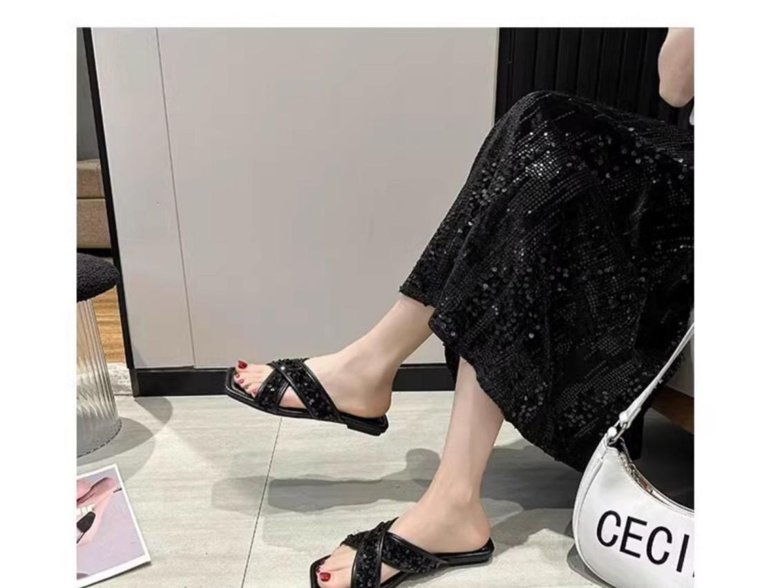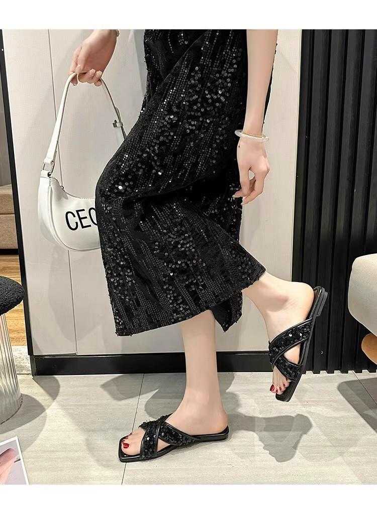 Pantuflas Cruzadas de Estilo Francés para Mujer 2025 Nuevas Verano Exterior Lentejuelas Slip-On Planas Sandalias de Playa