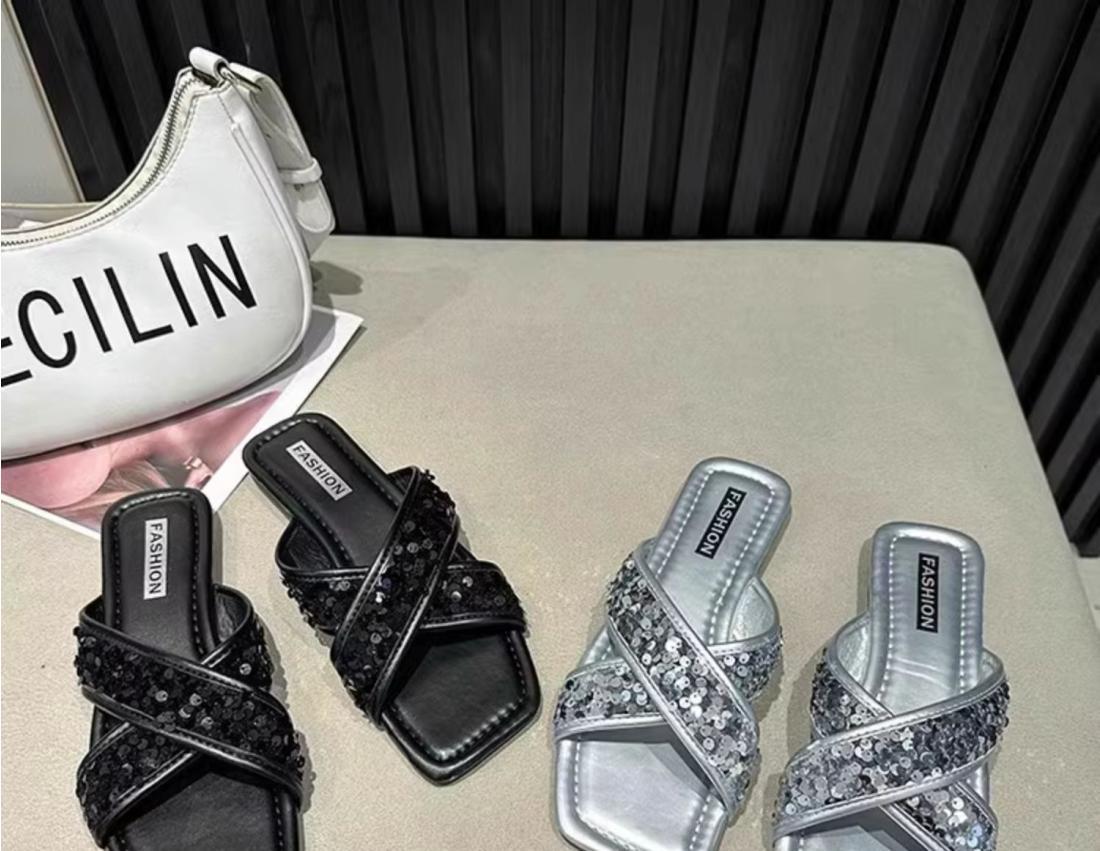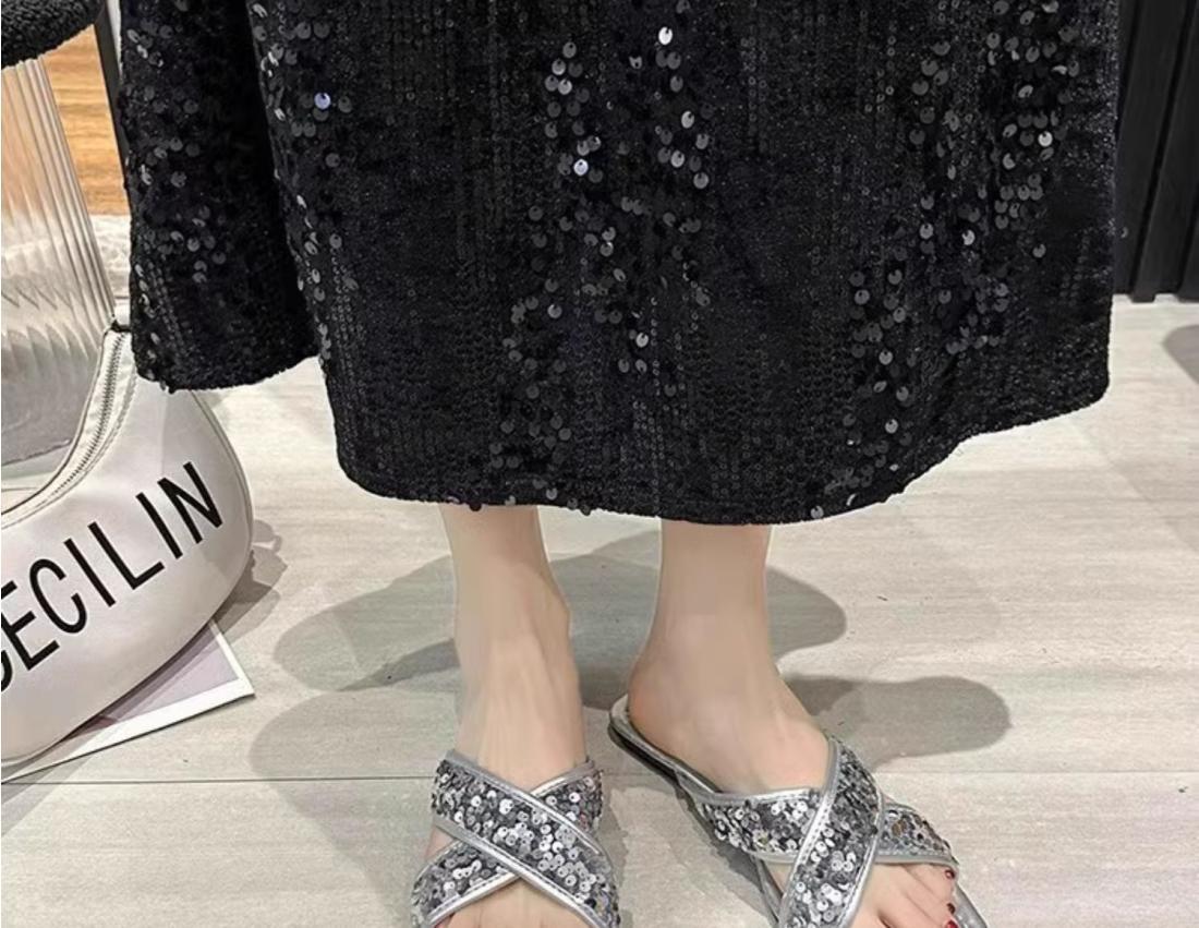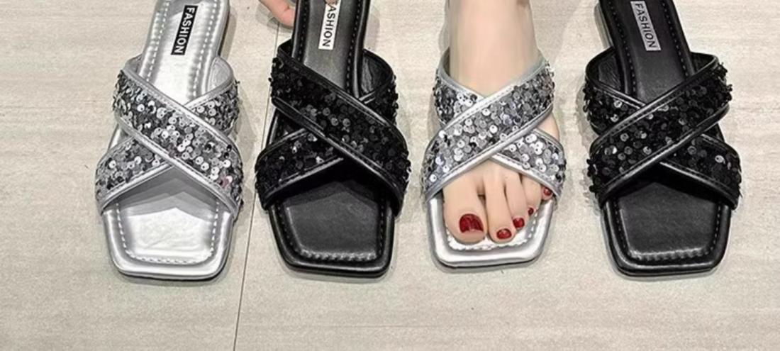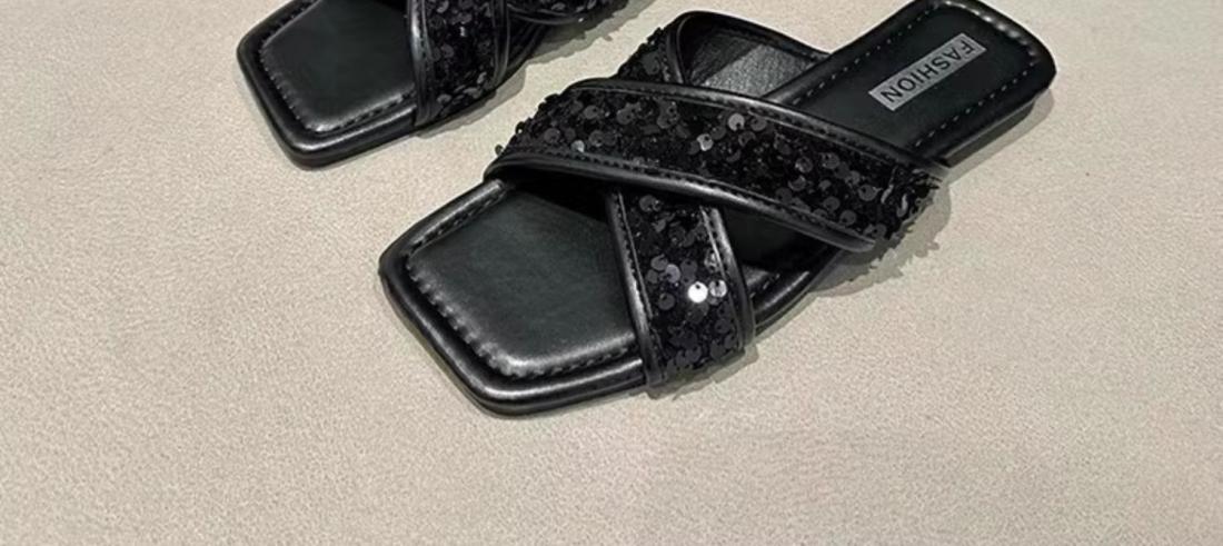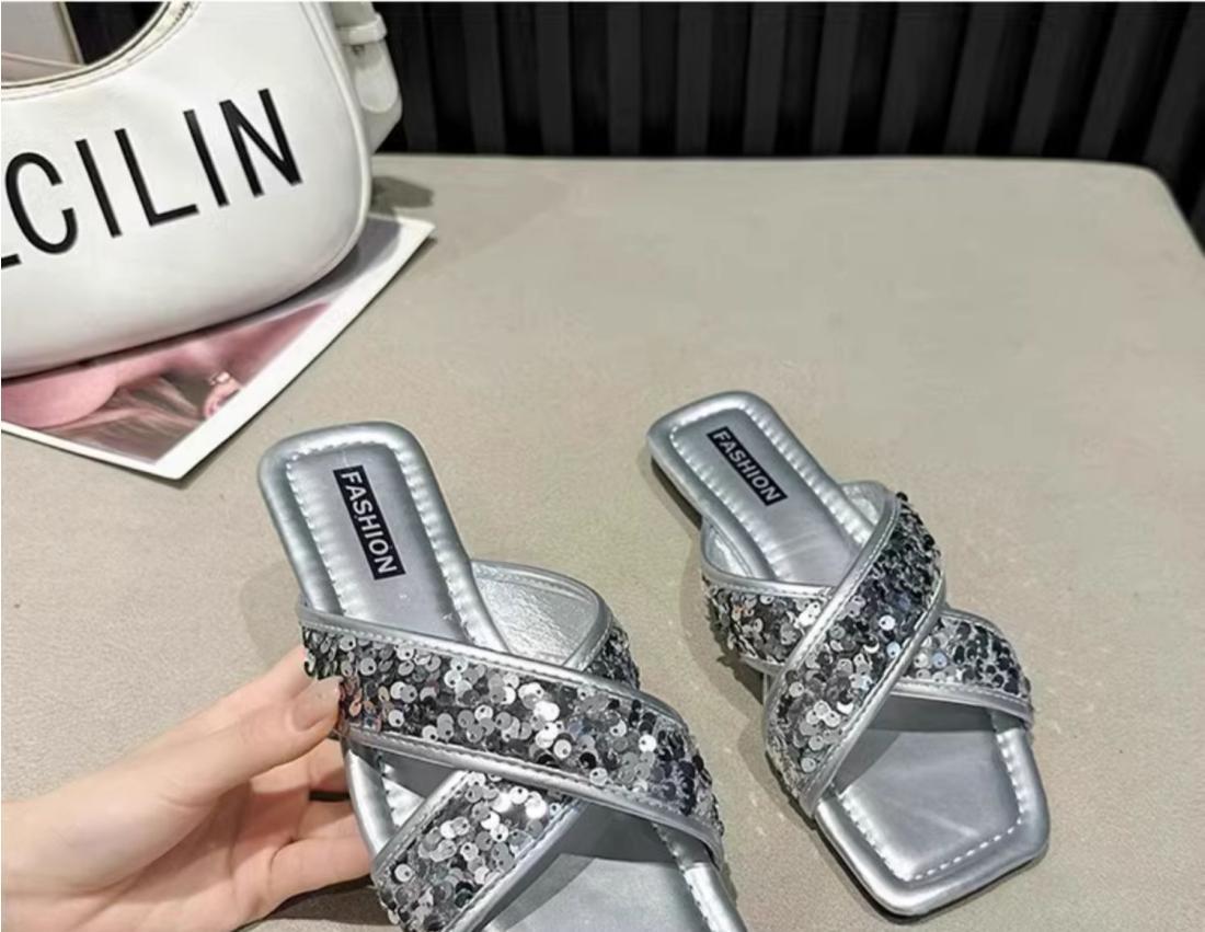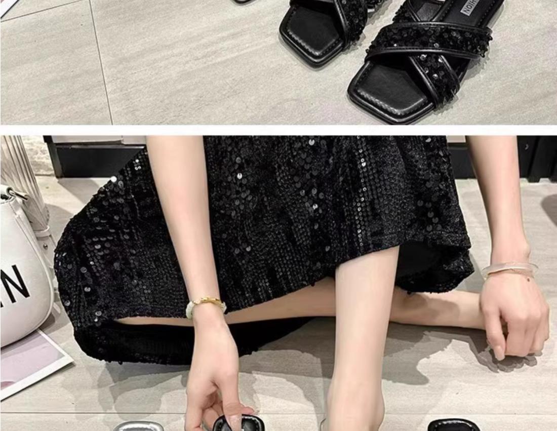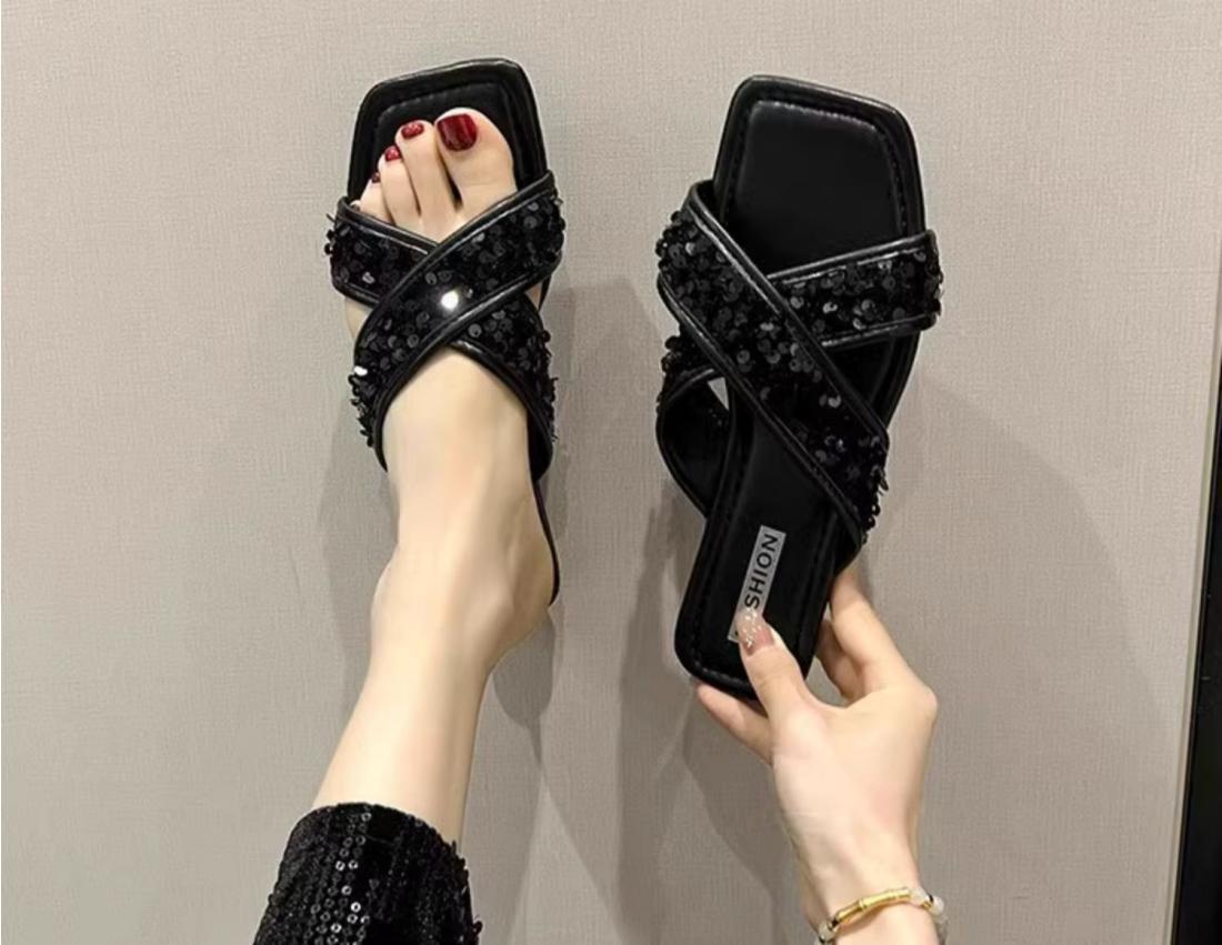 Pantuflas Cruzadas de Estilo Francés para Mujer 2025 Nuevas Verano Exterior Lentejuelas Slip-On Planas Sandalias de Playa