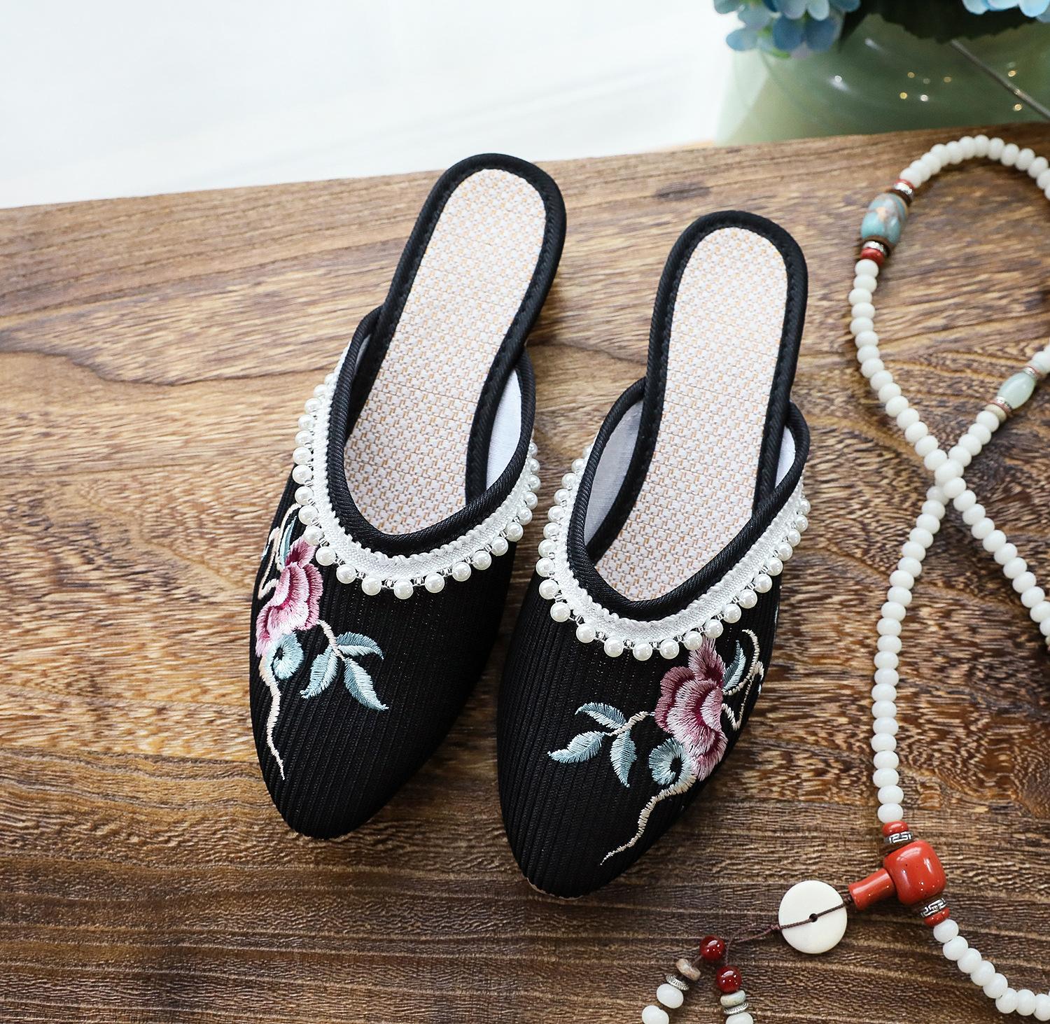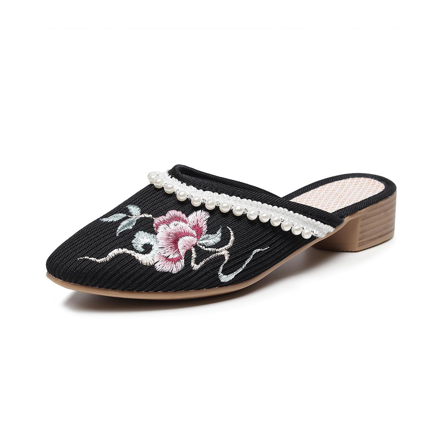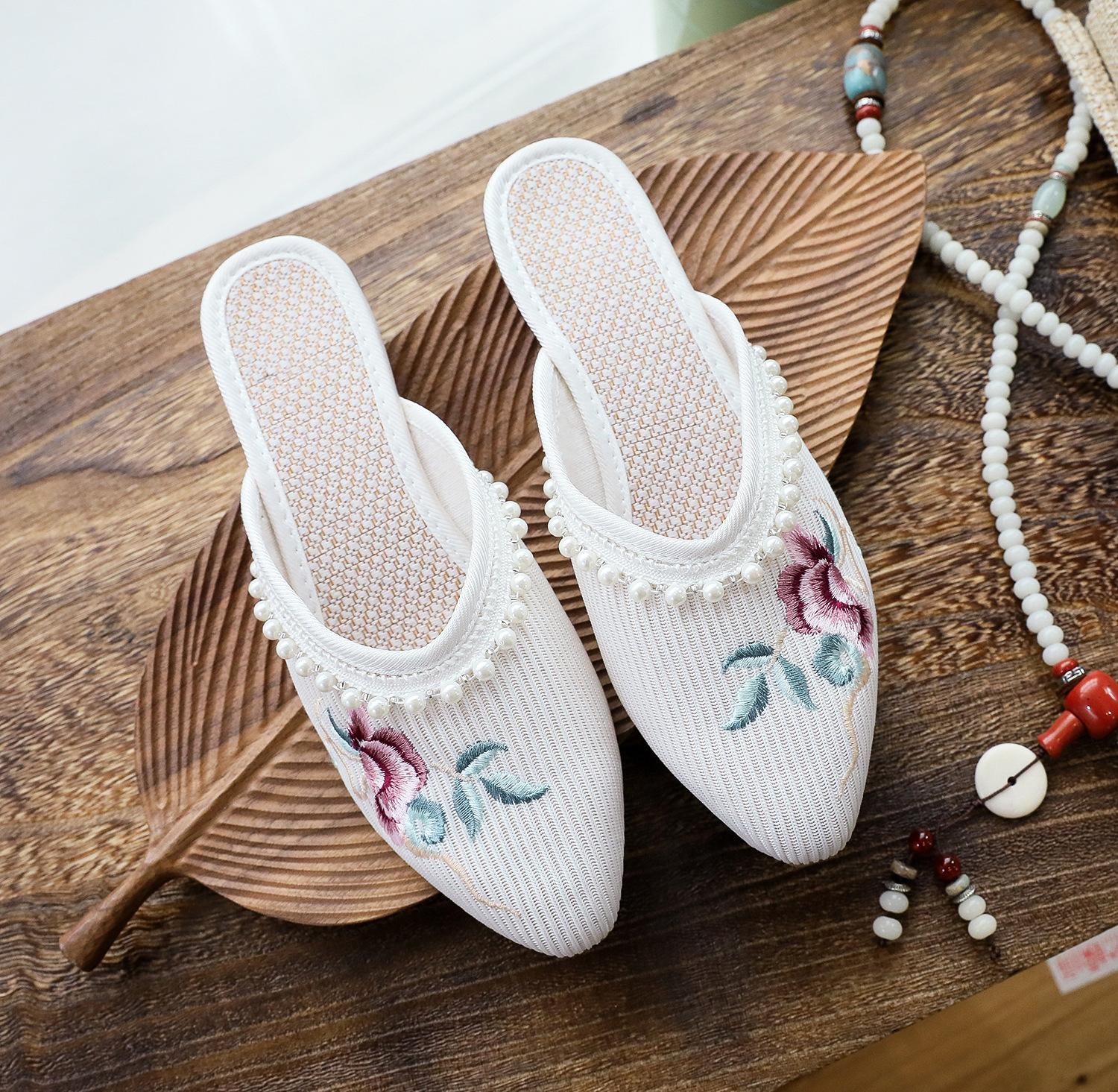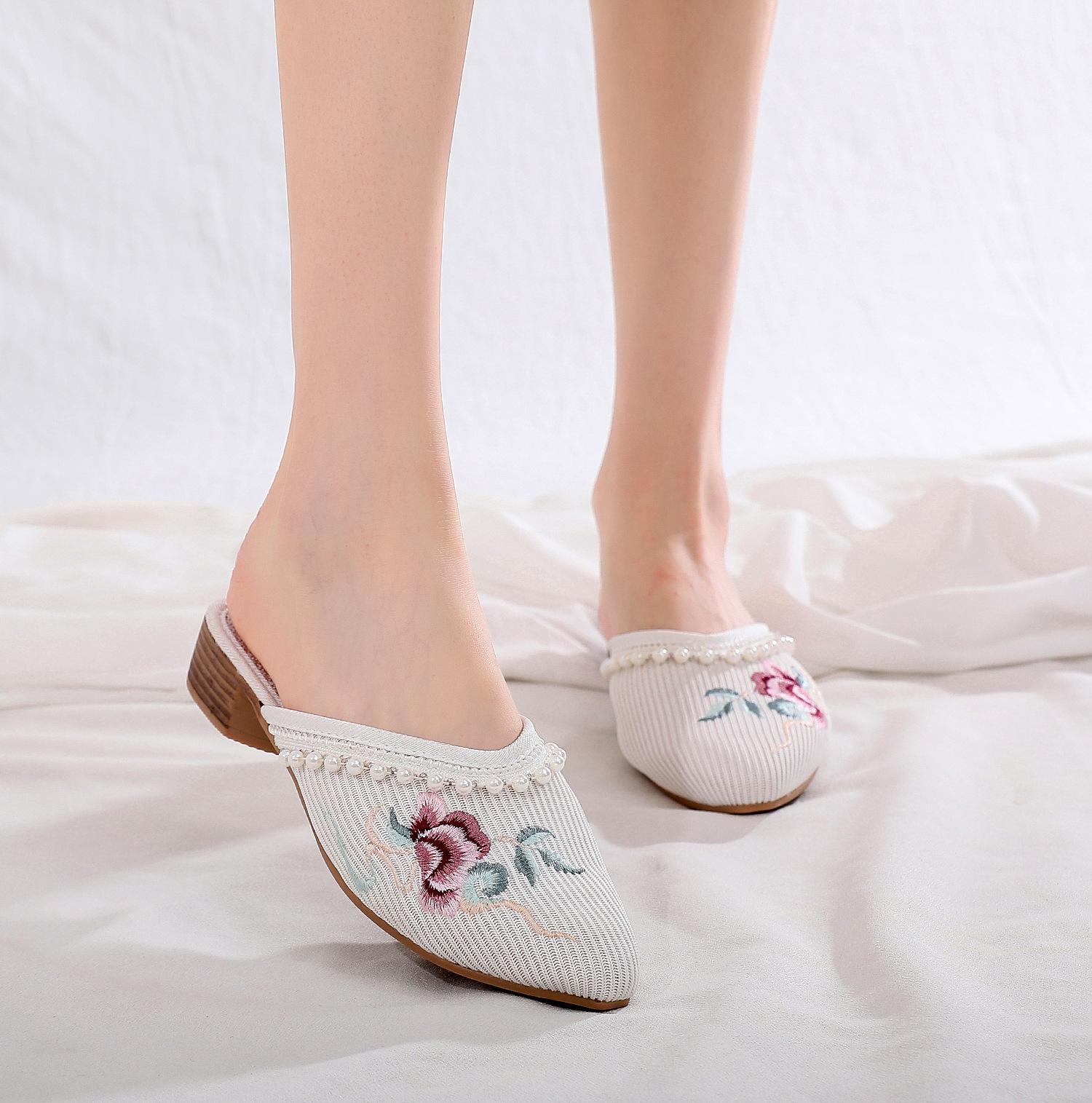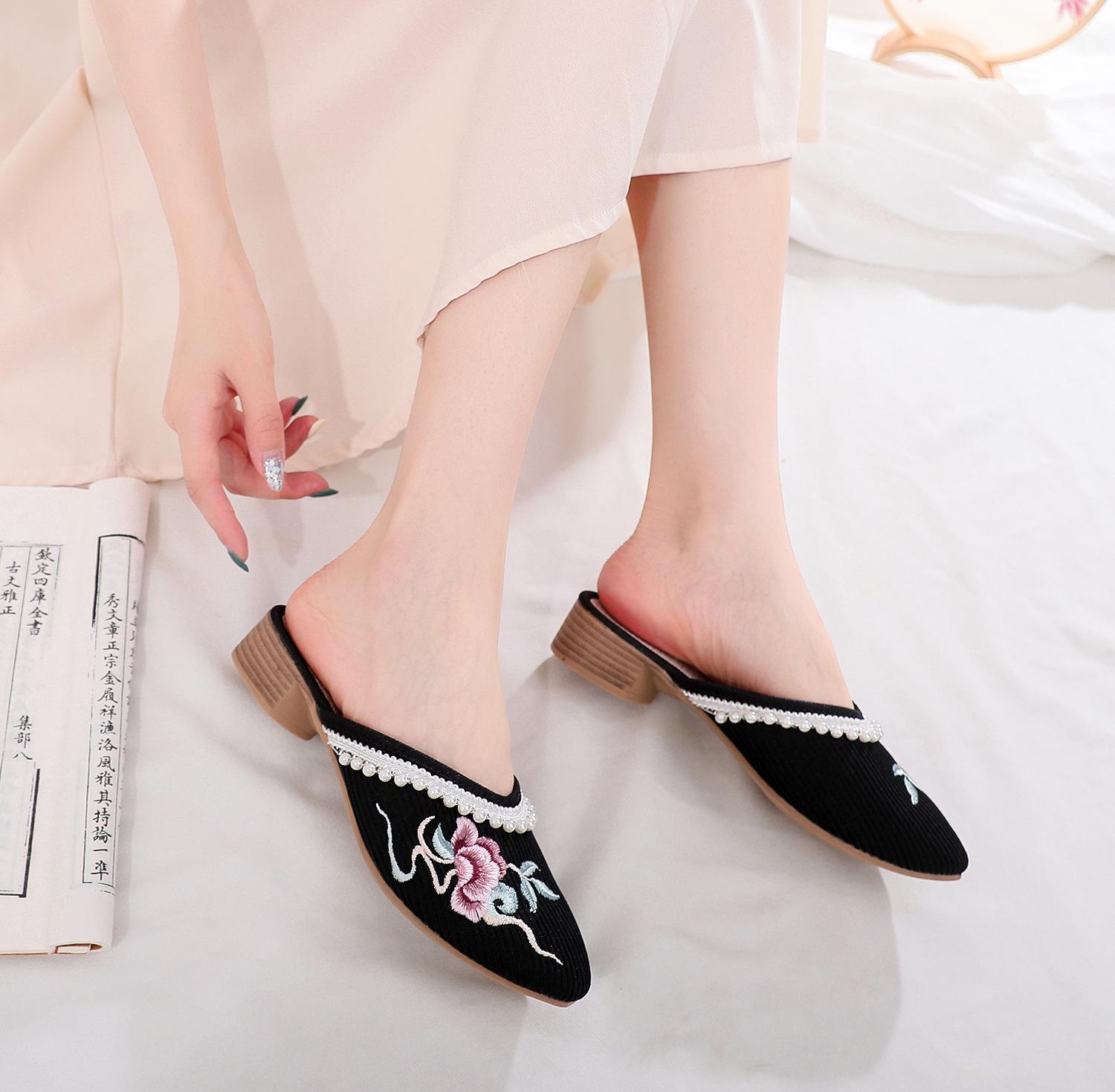 Zapatillas de tela bordadas para mujer, zapatos de moda, con puntera, para exteriores, de verano, nuevas