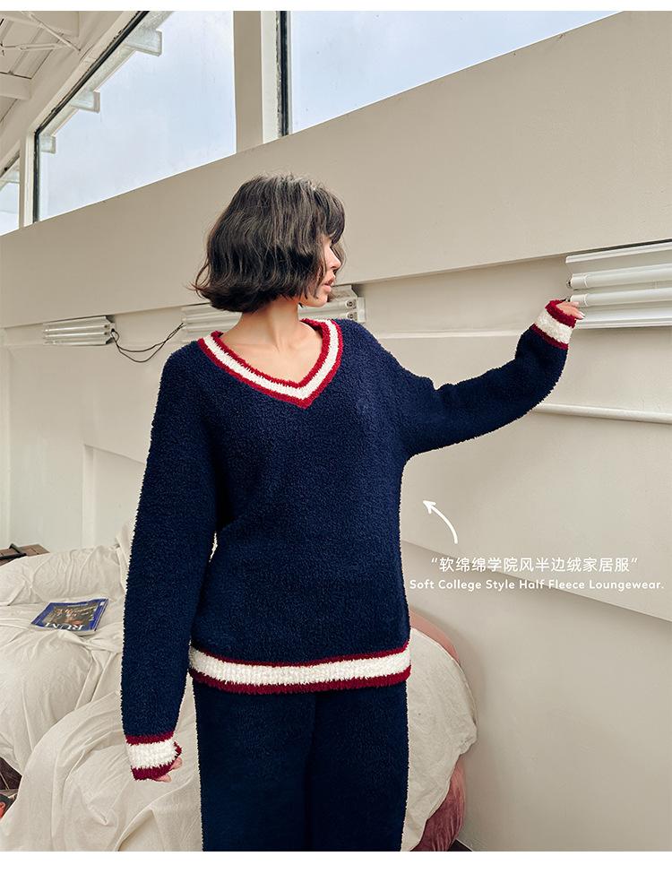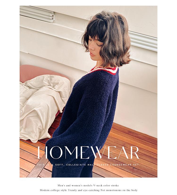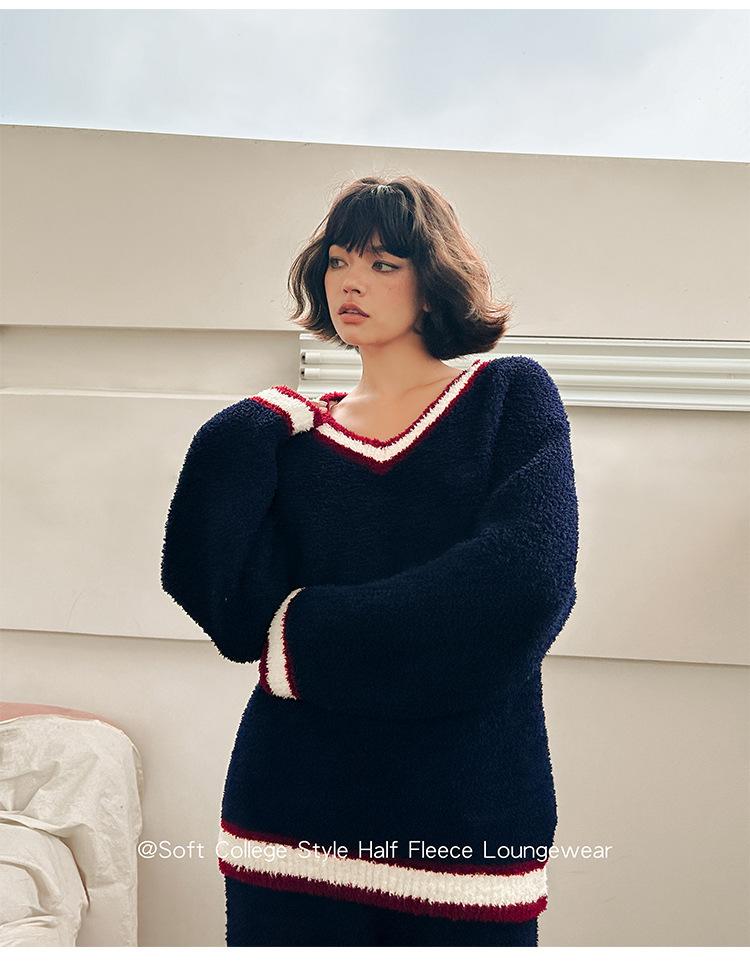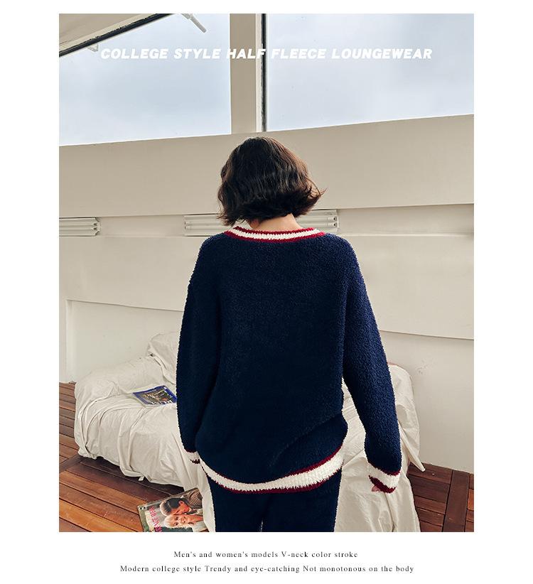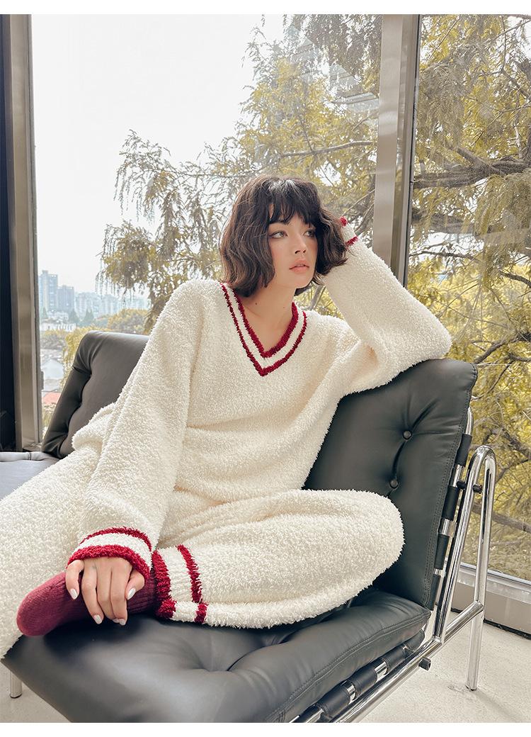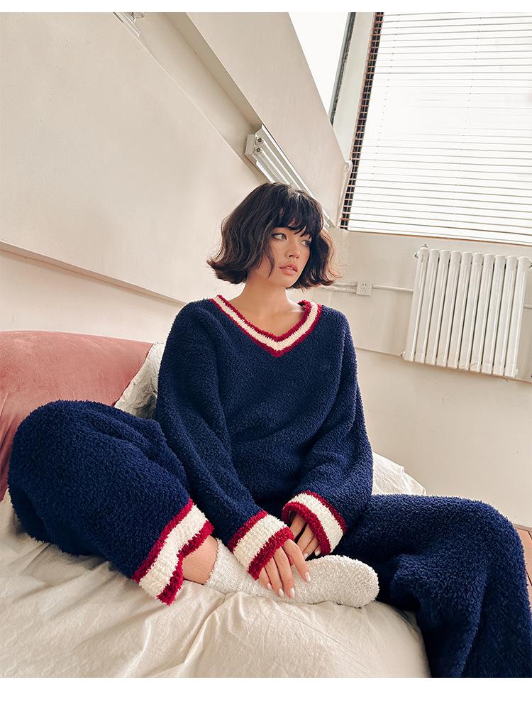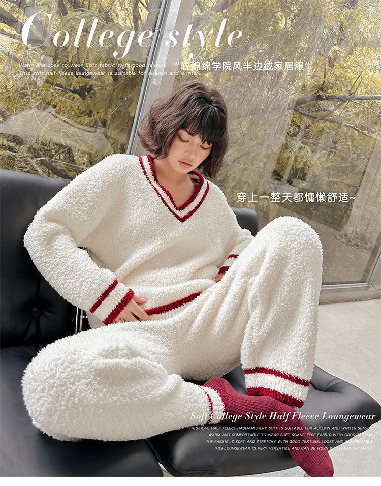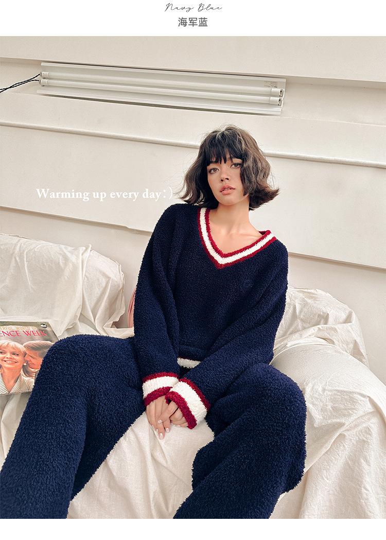 Otoño e Invierno suave cuello en V neutro estilo preppy pijama de mujer media felpa cálido grueso traje de uso en casa se puede usar afuera
