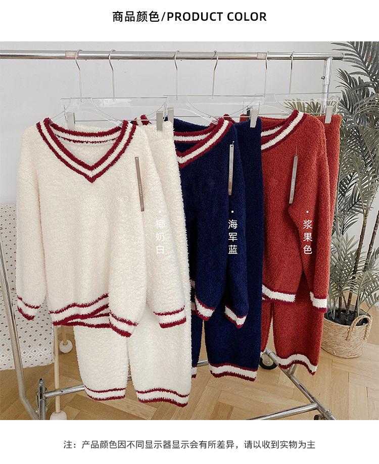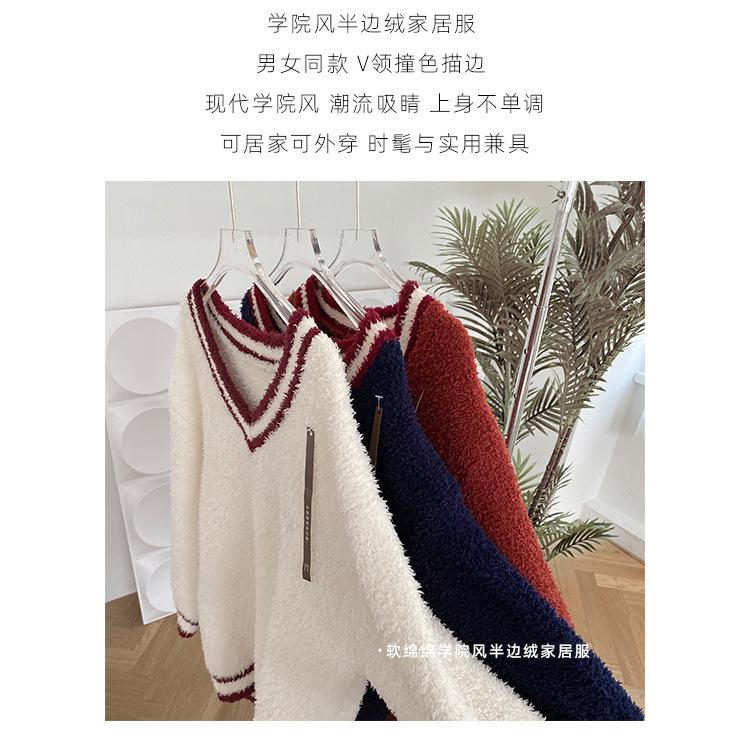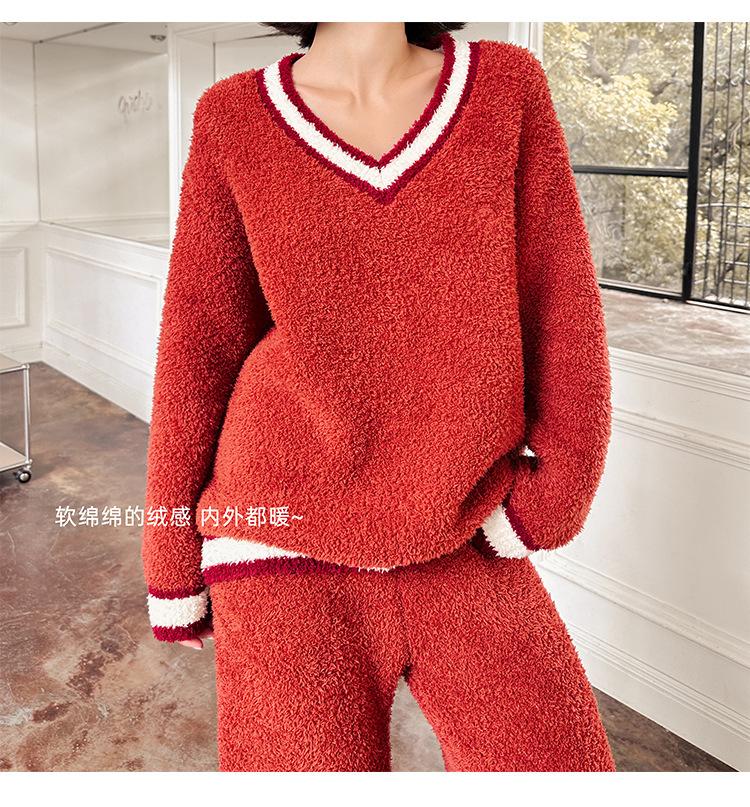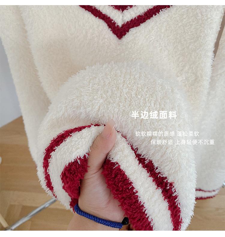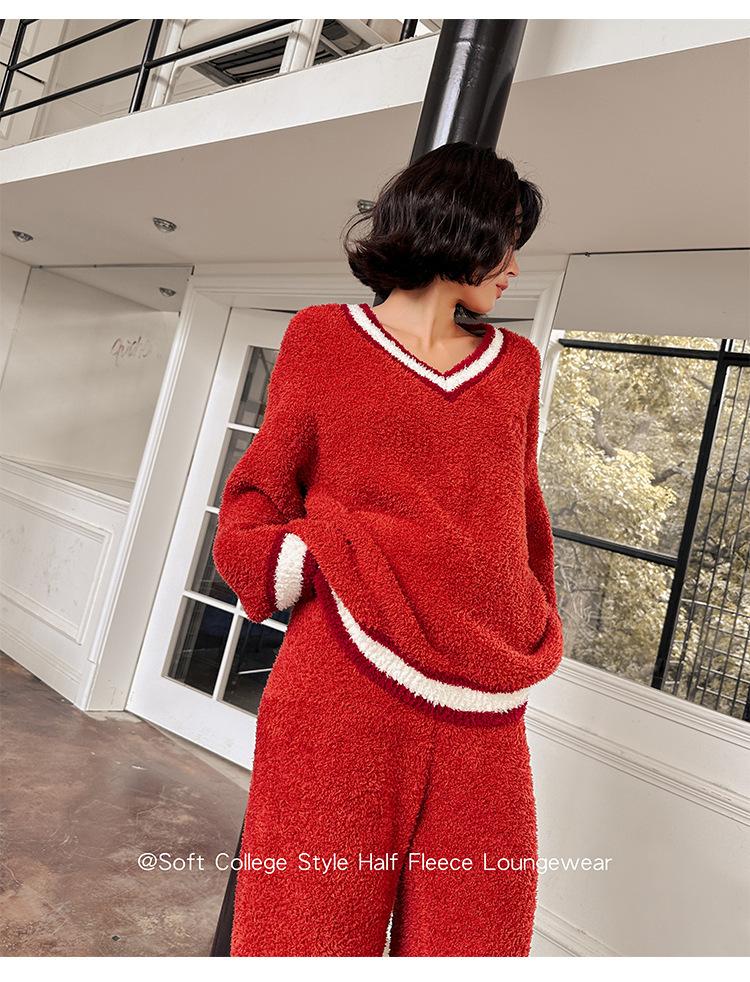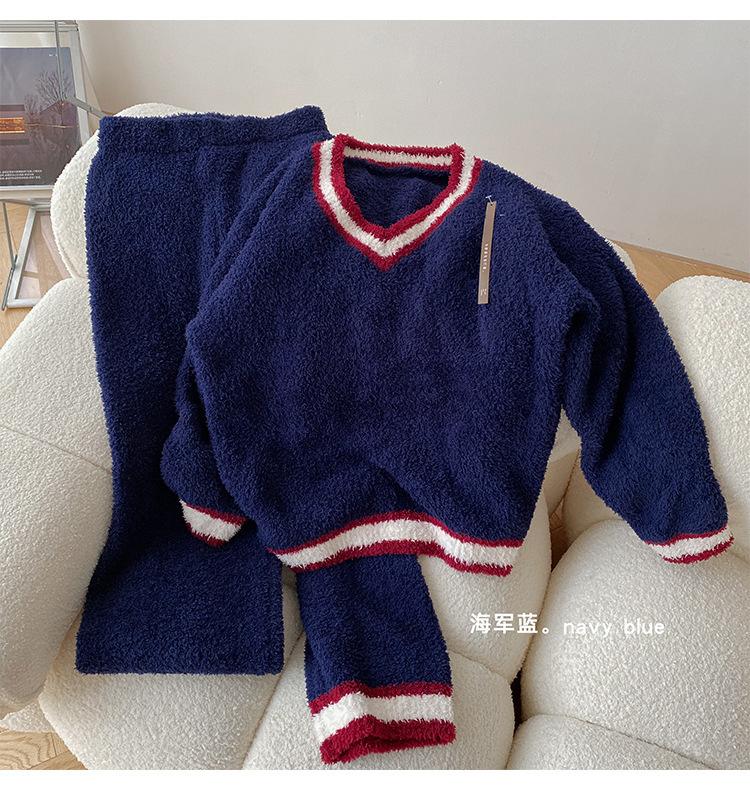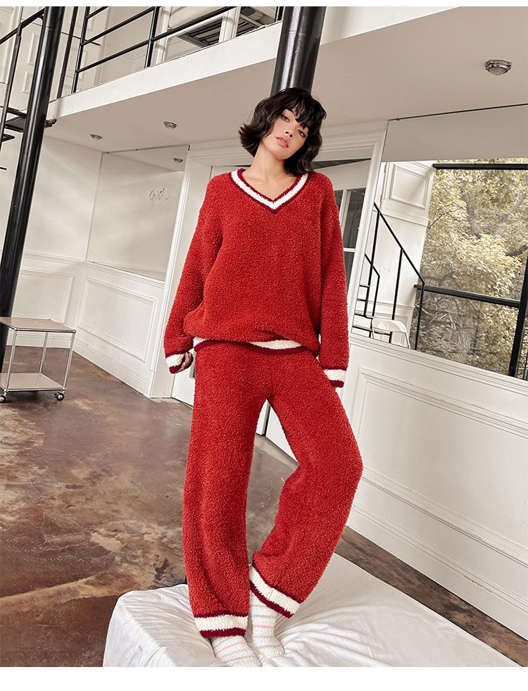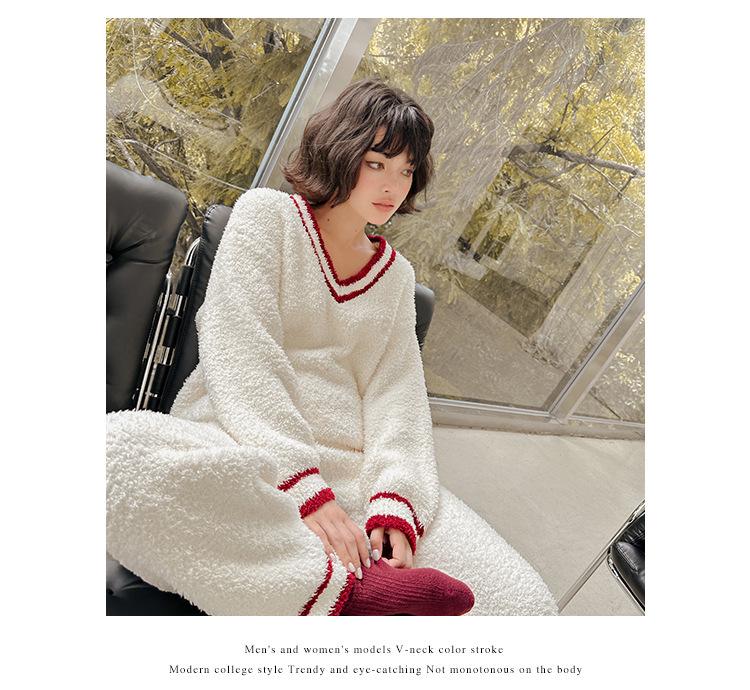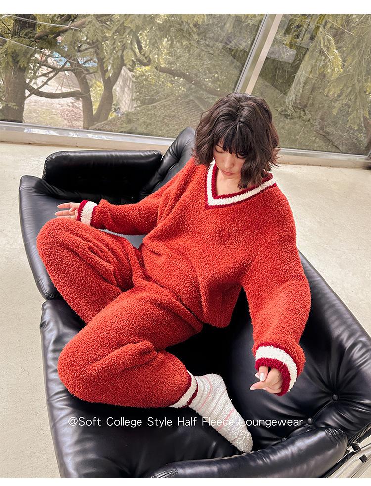 Otoño e Invierno suave cuello en V neutro estilo preppy pijama de mujer media felpa cálido grueso traje de uso en casa se puede usar afuera