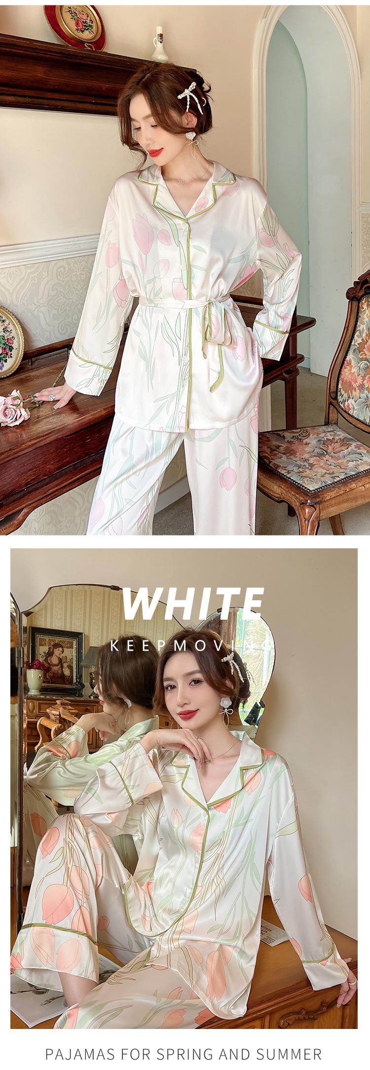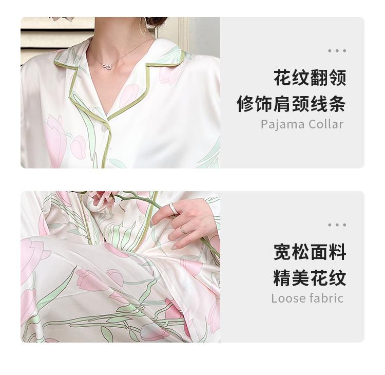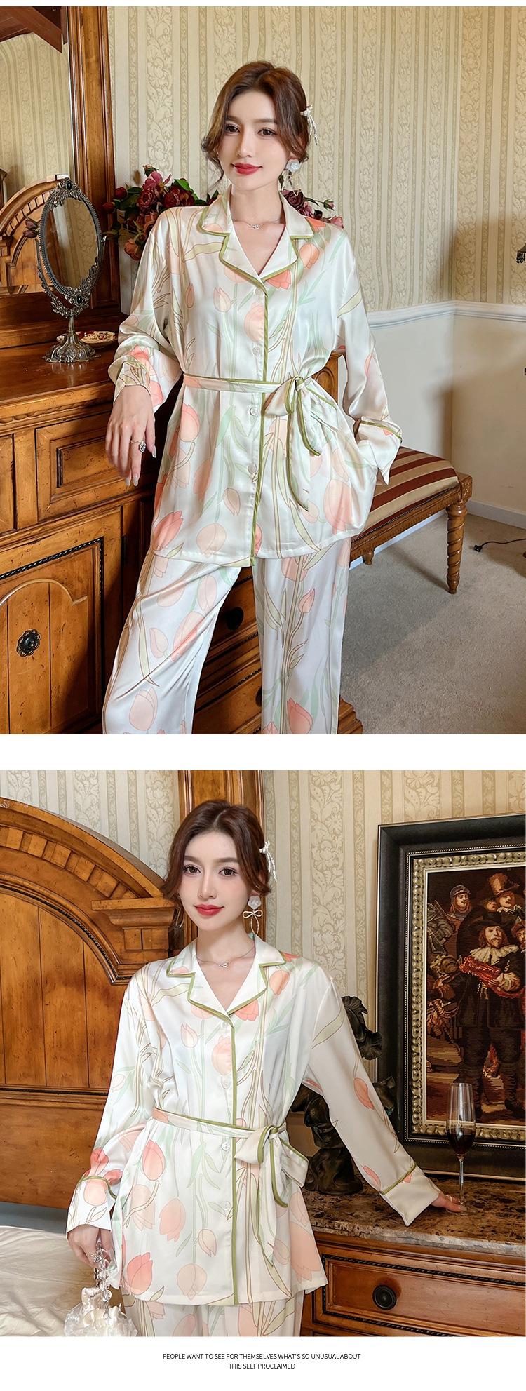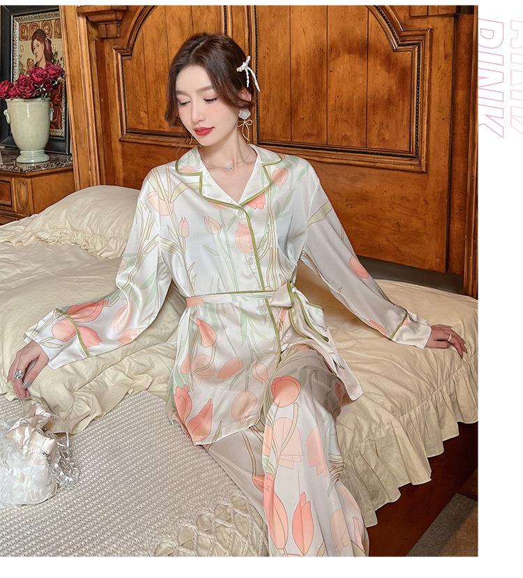 Pijamas de seda helada, elegantes y frescos, de primavera y otoño de 2024, para mujer, con pantalones de manga larga y estampado de tulipán, ropa de casa.