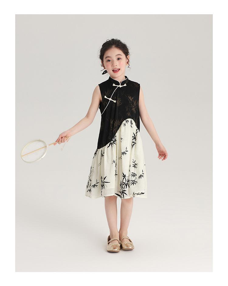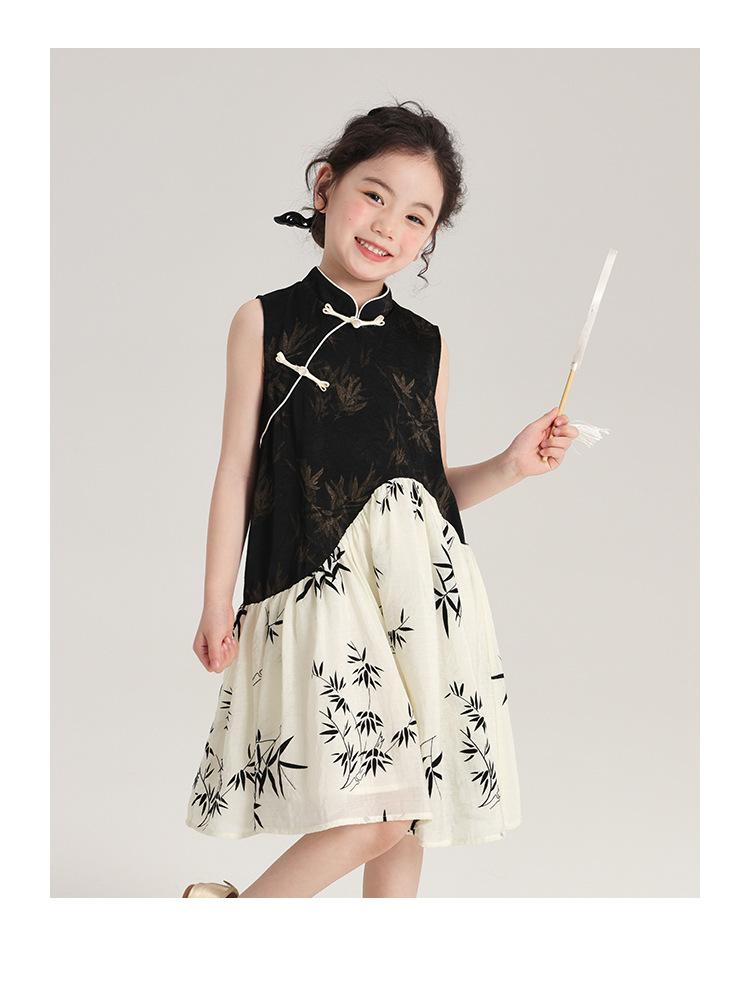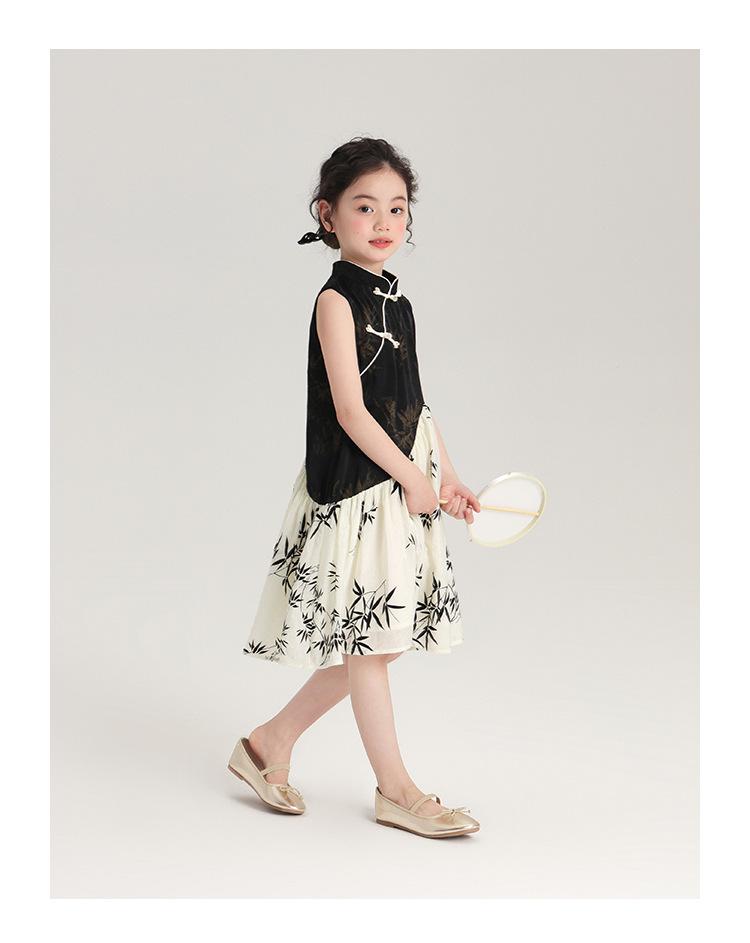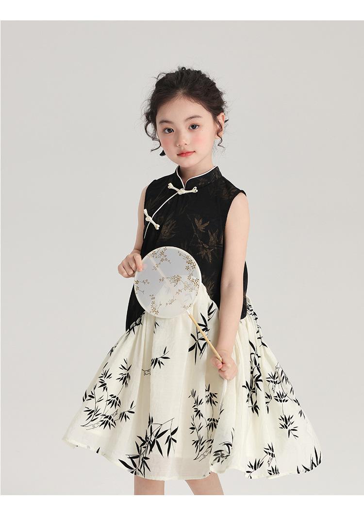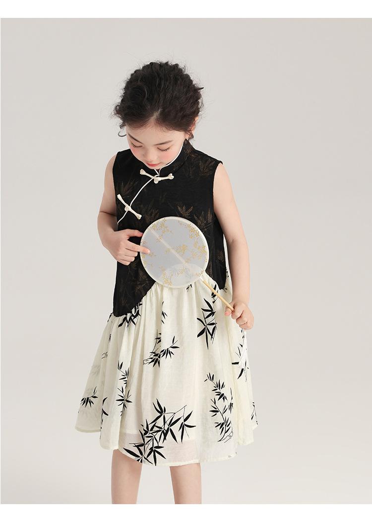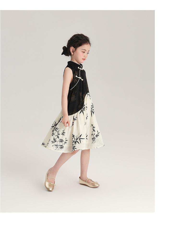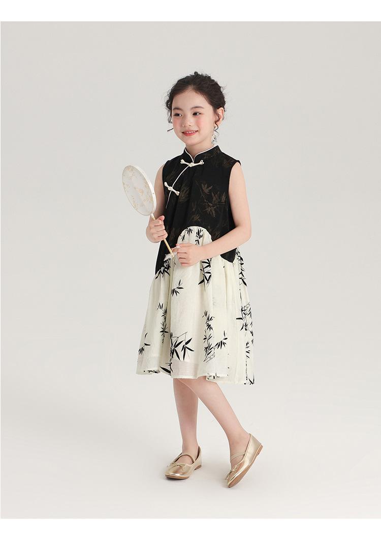 Vestido cheongsam elegante para niña, estilo nacional, estampado de bambú, blanco y negro, novedad de verano de 2024