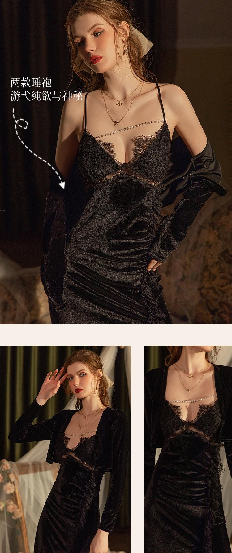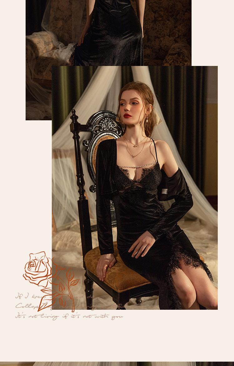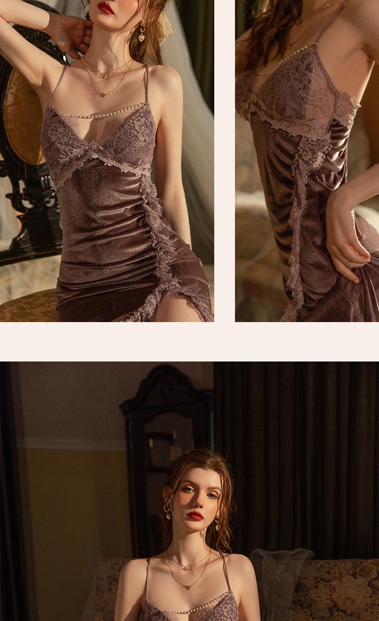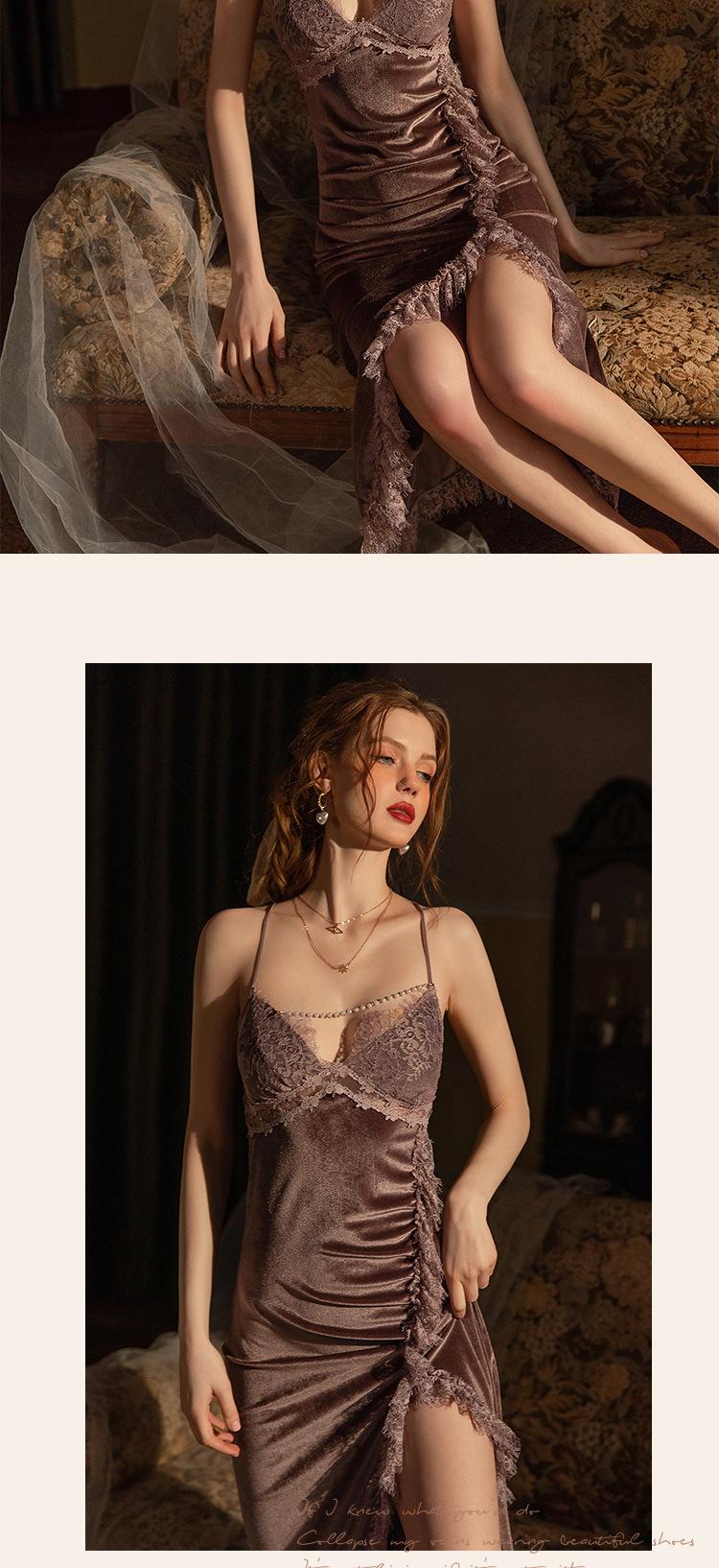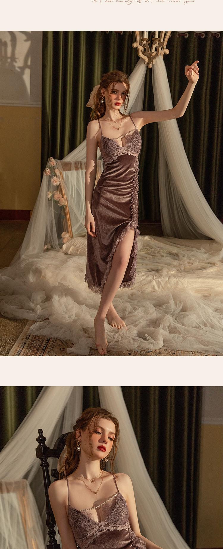 Camisón Sexy Retro Francés con Tirantes para Mujer, Ropa de Casa de Terciopelo Dorado para Otoño e Invierno, Pijama Tentación de Piernas Largas con Abertura y Espalda Hermosa
