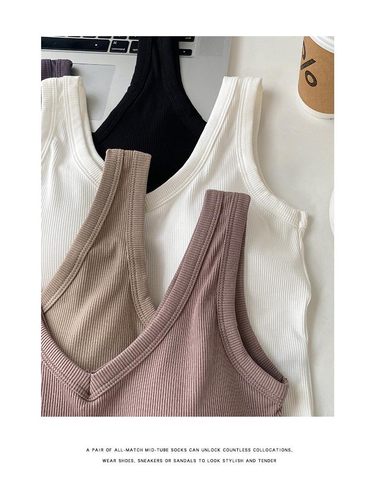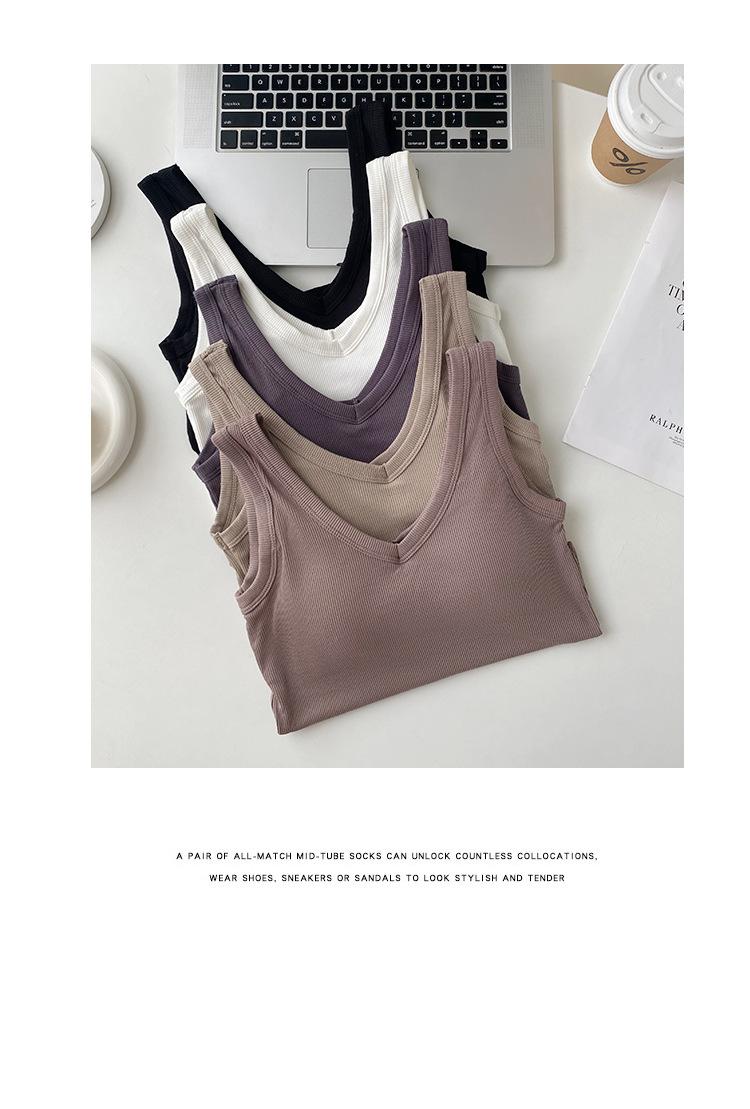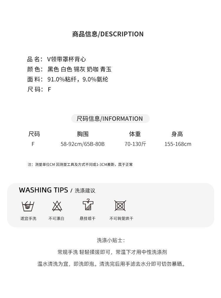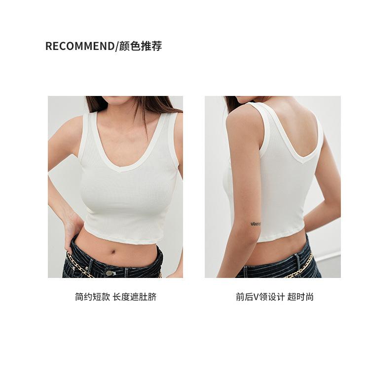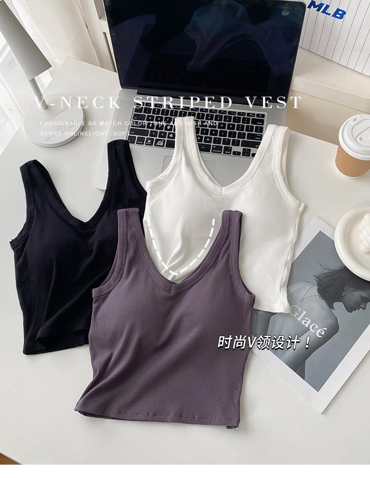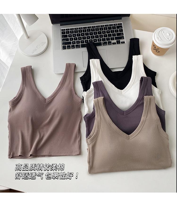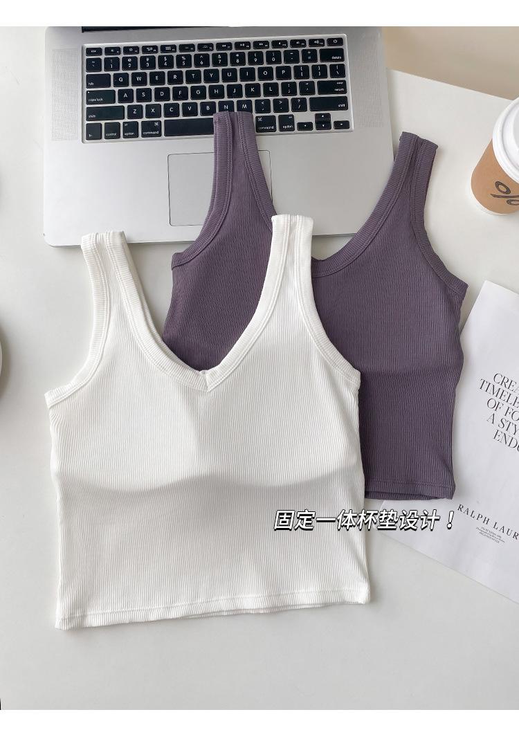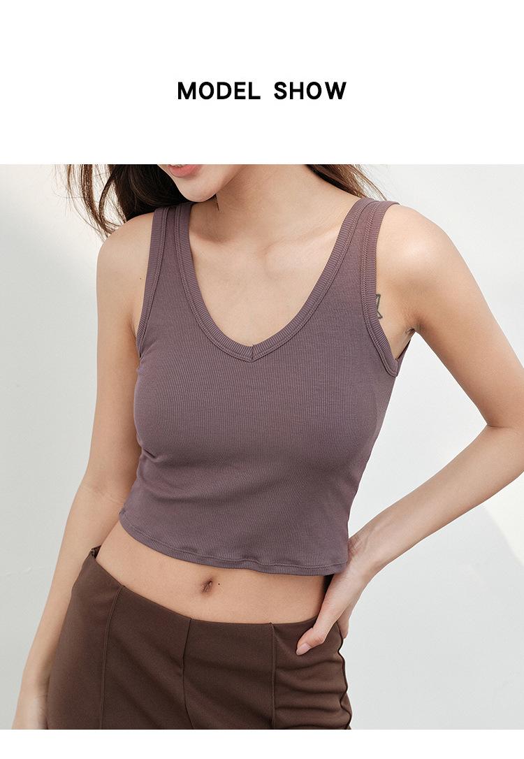 Top interior transpirable de verano de una pieza con escote en V y copa fija con hombros anchos y cierre de pecho.