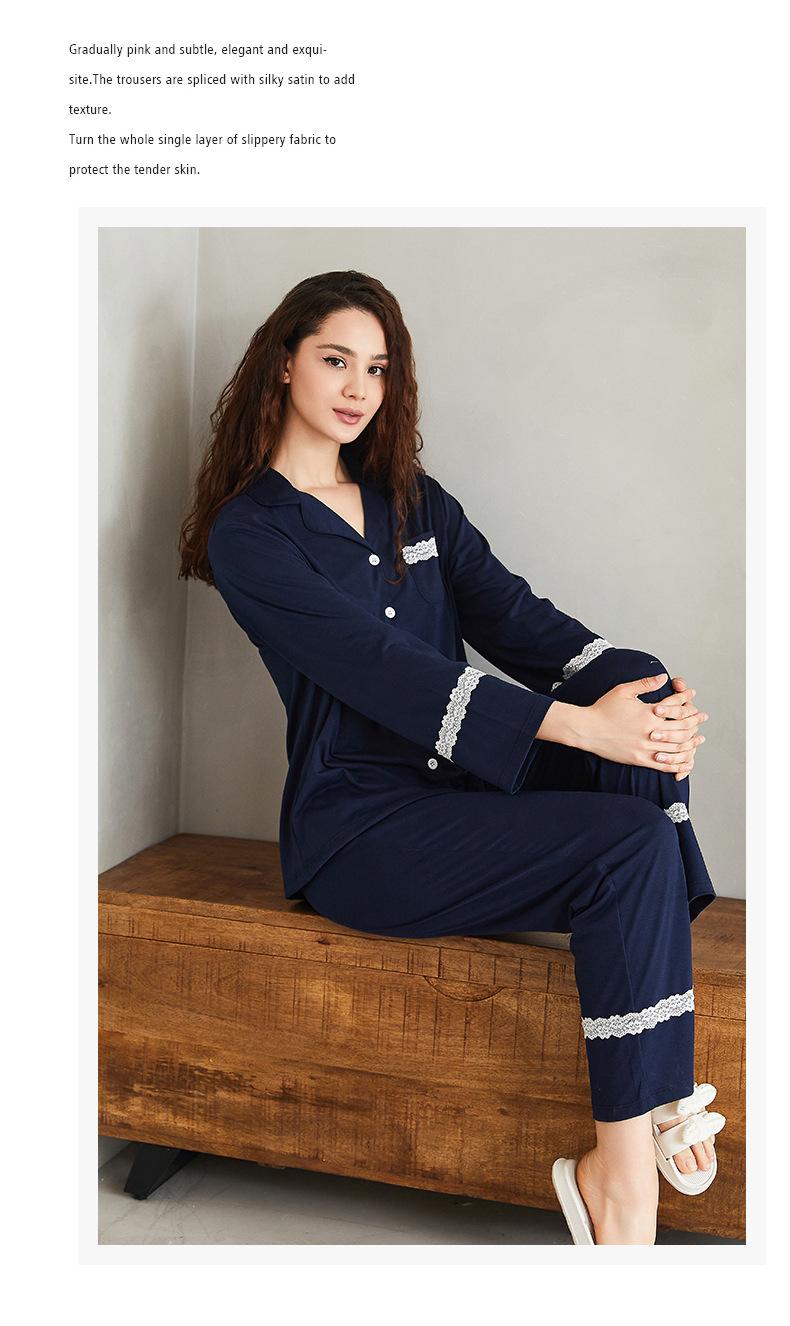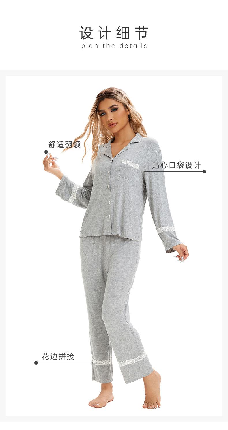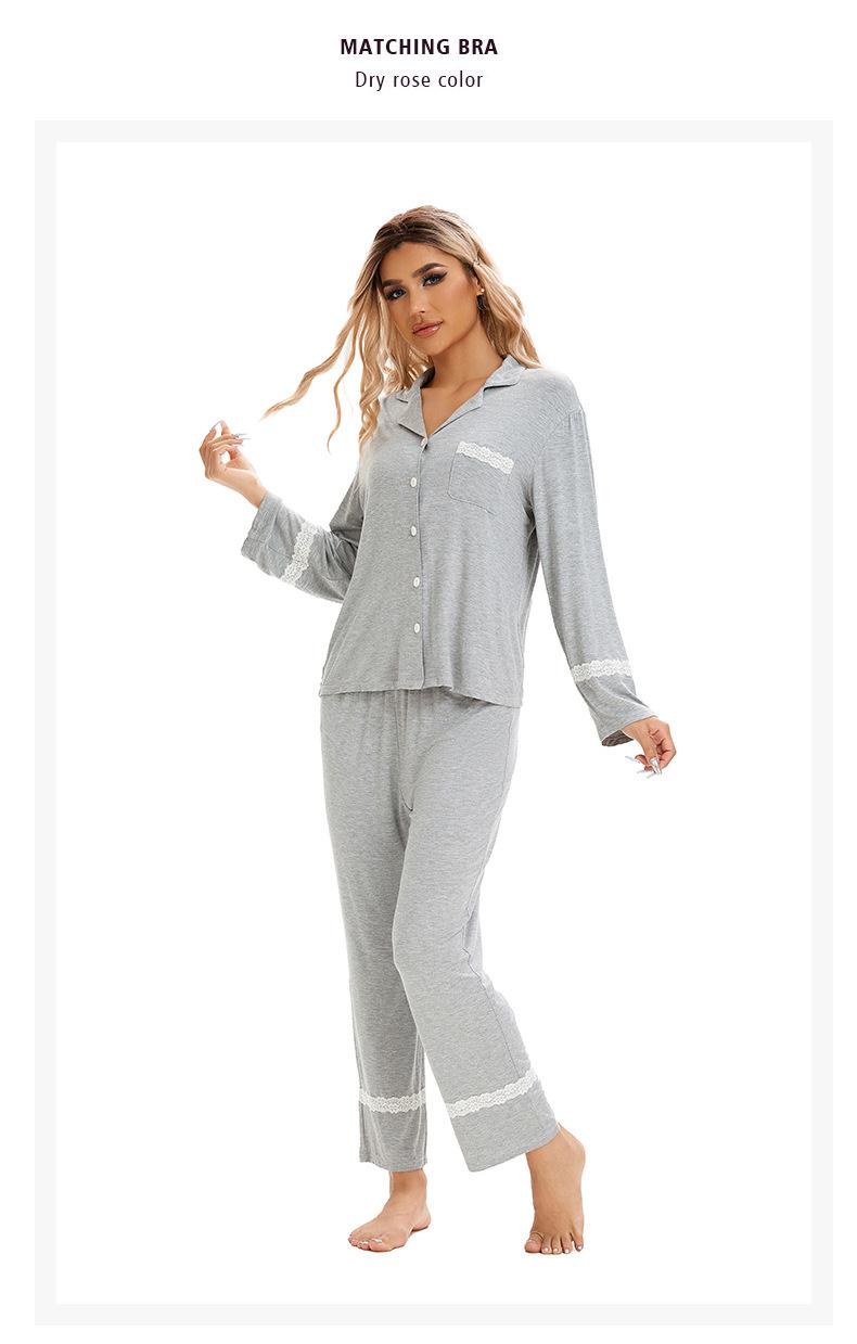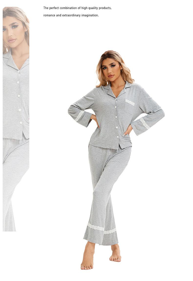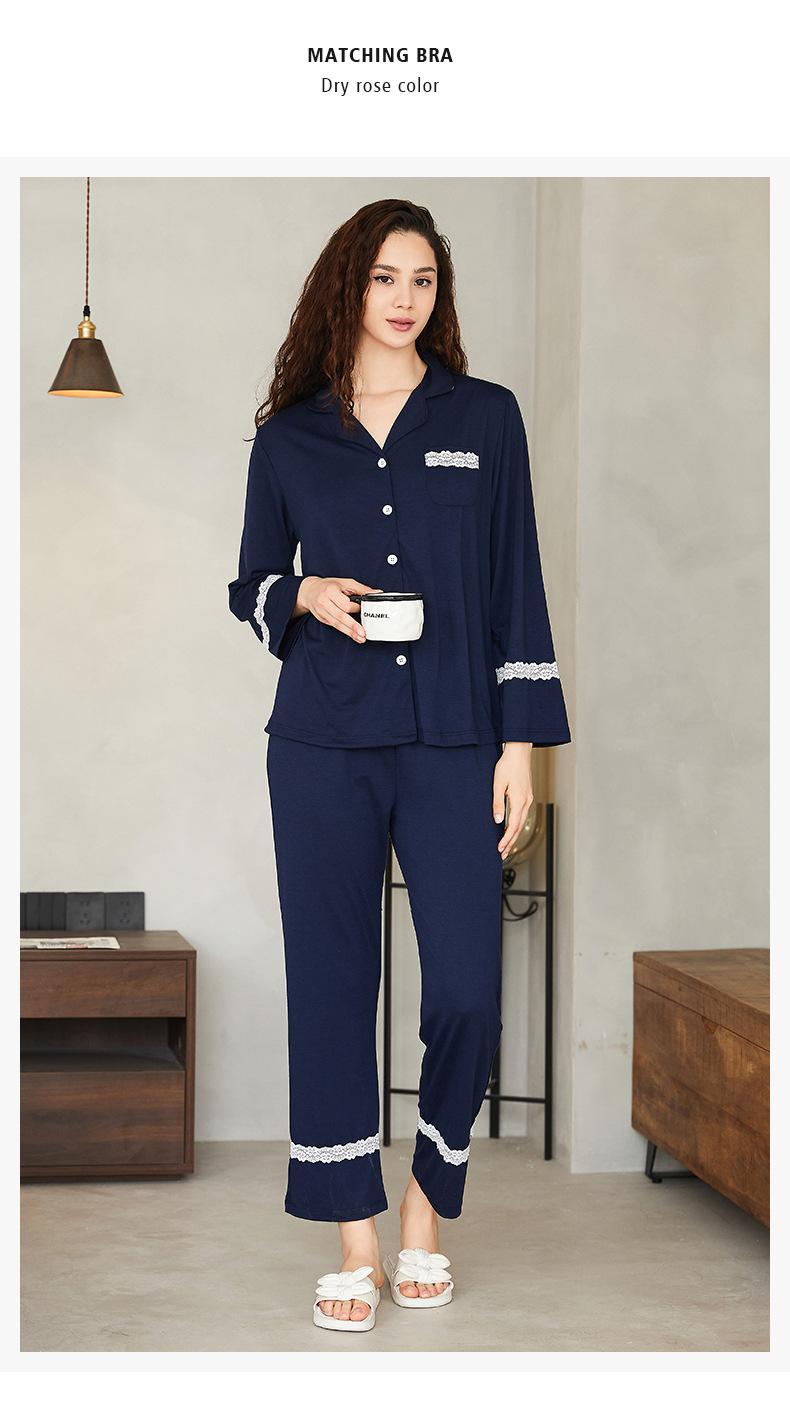 Pijama de comercio exterior para mujer, de color liso, de algodón tejido, suelto, con costuras de encaje, estilo europeo y americano, cárdigan, ropa para el hogar, traje, pantalones de manga larga