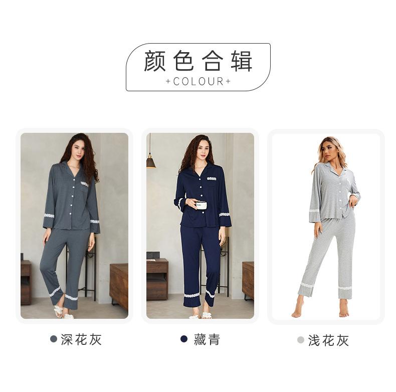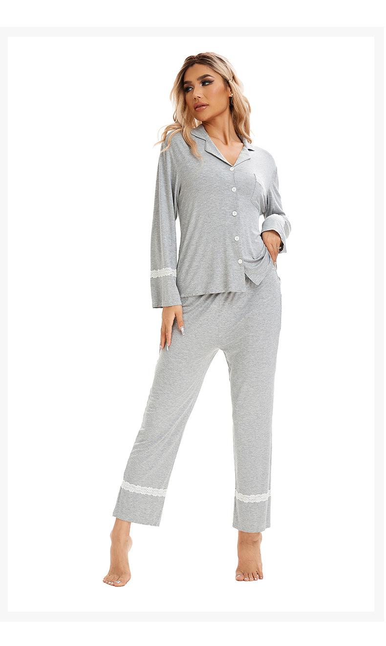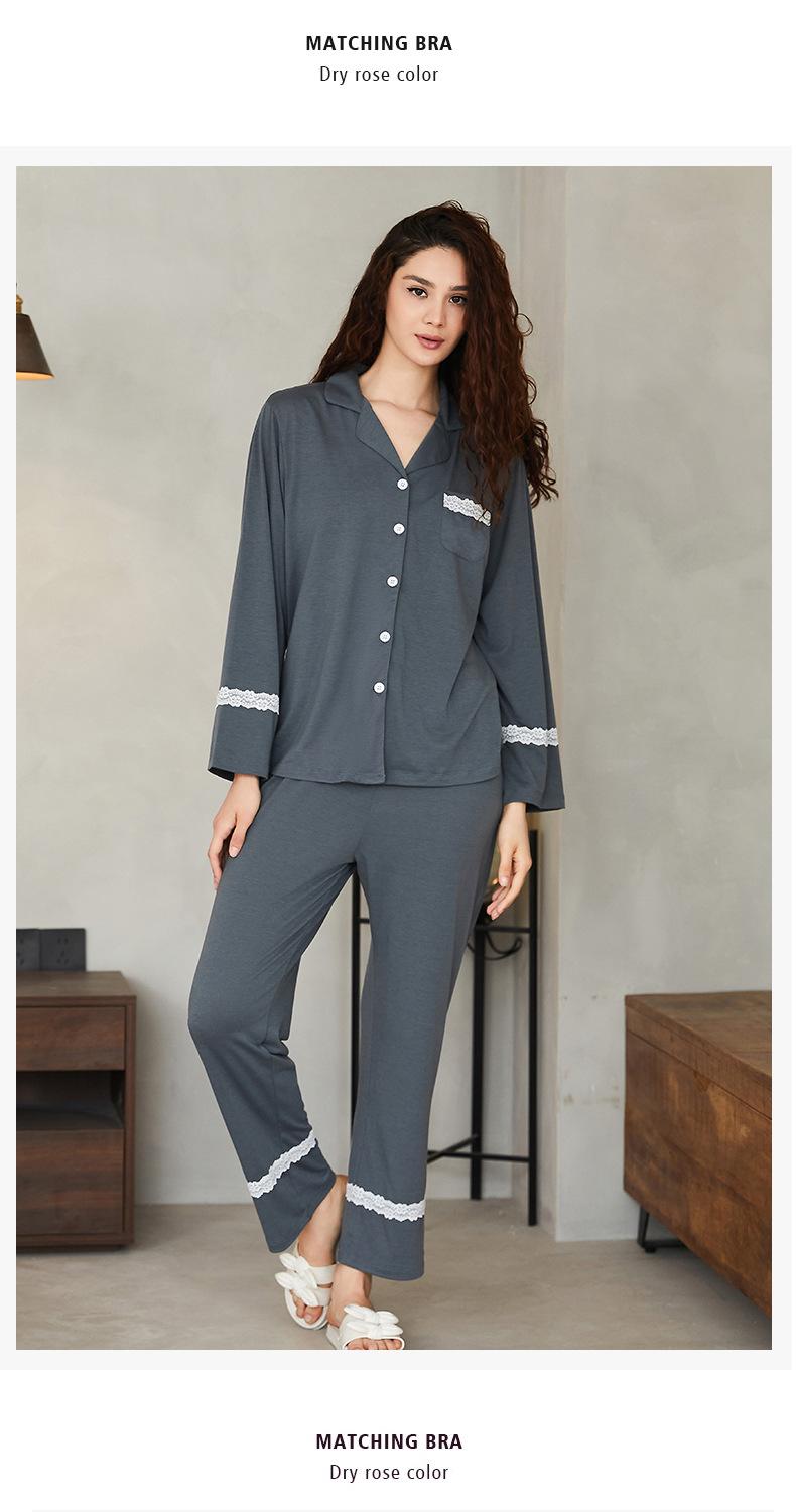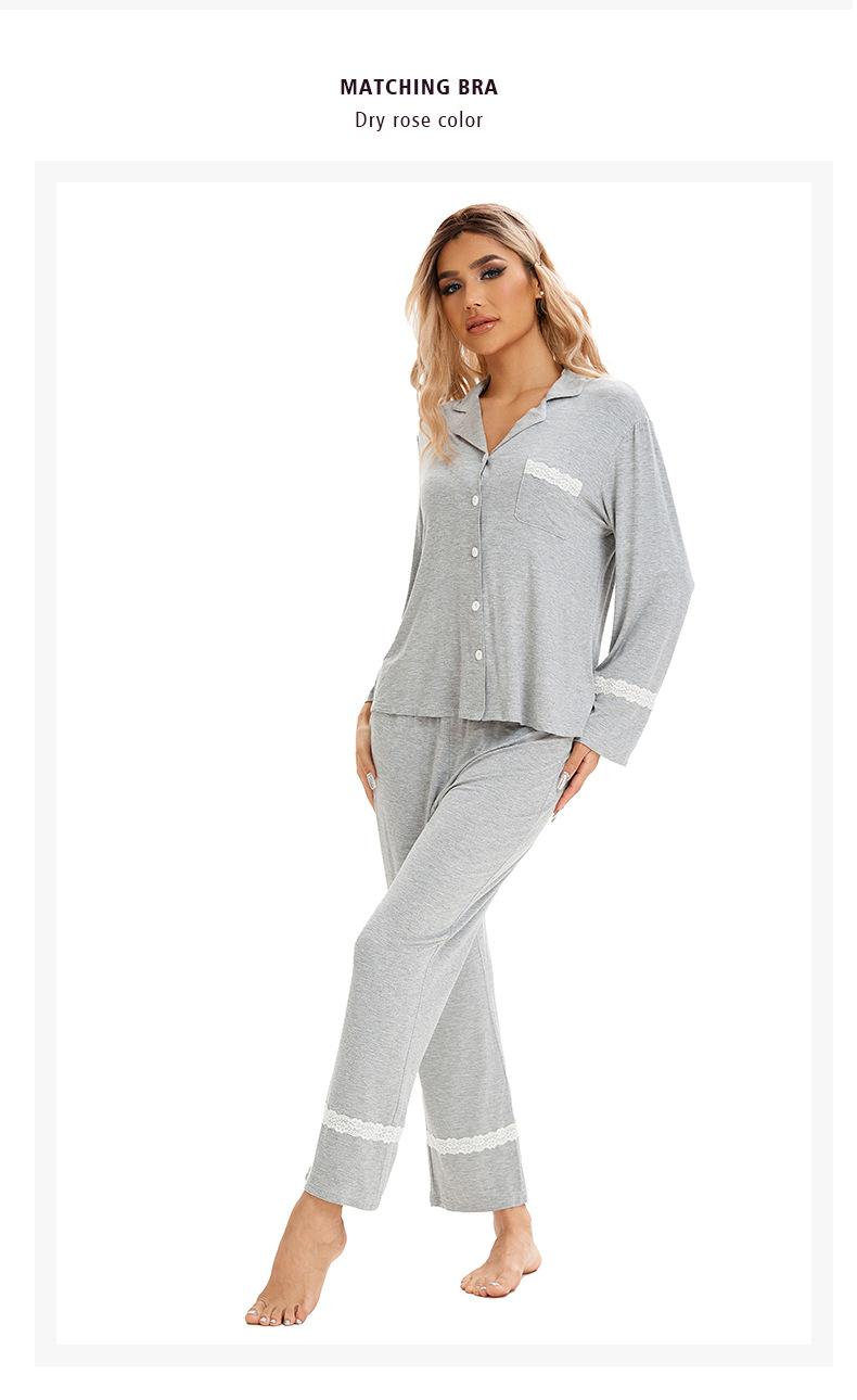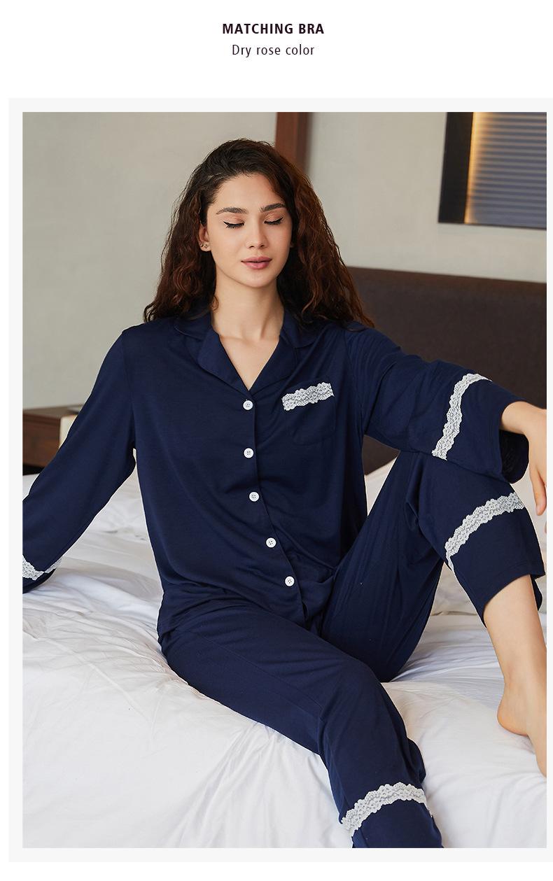 Pijama de comercio exterior para mujer, de color liso, de algodón tejido, suelto, con costuras de encaje, estilo europeo y americano, cárdigan, ropa para el hogar, traje, pantalones de manga larga