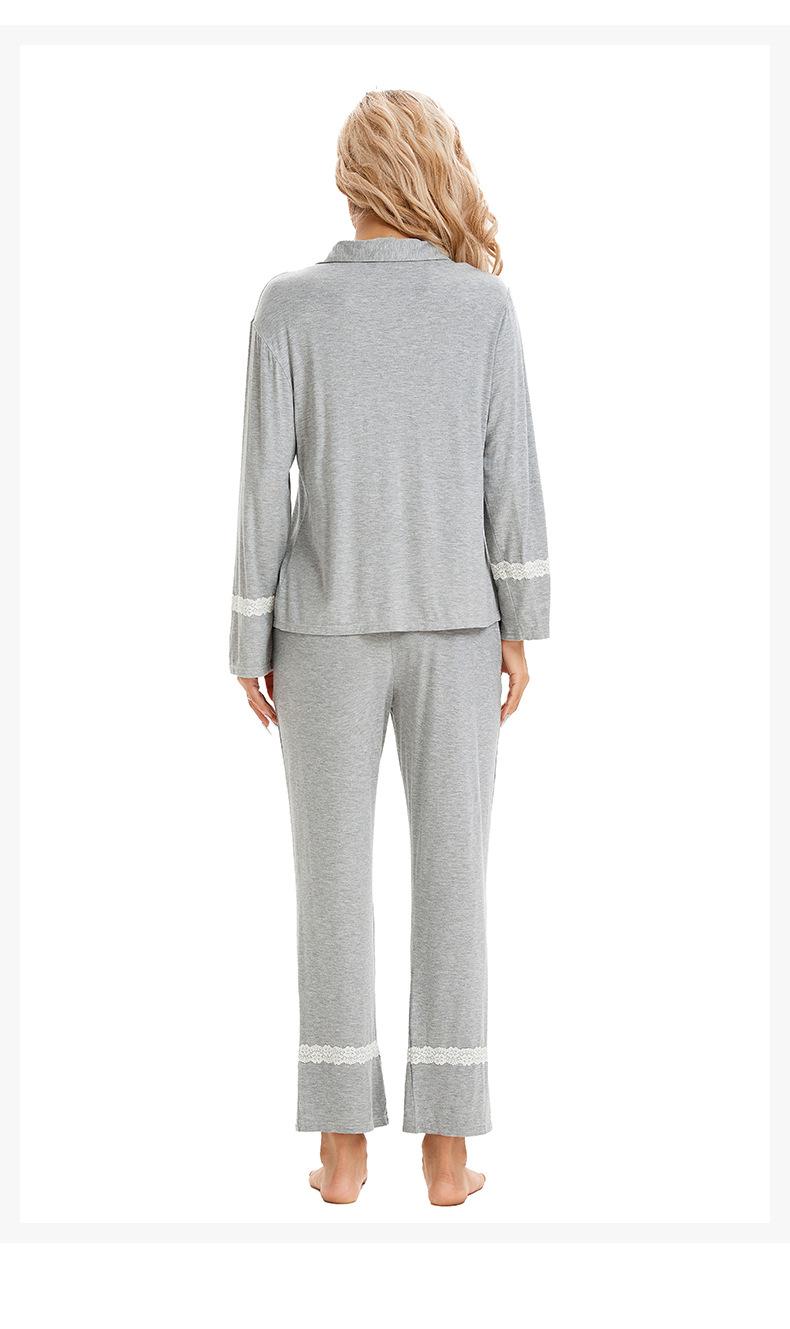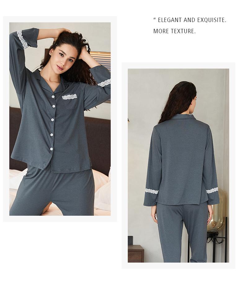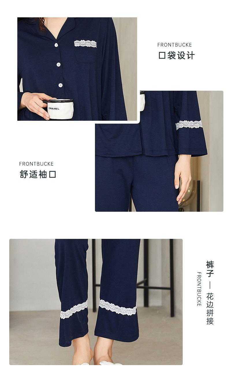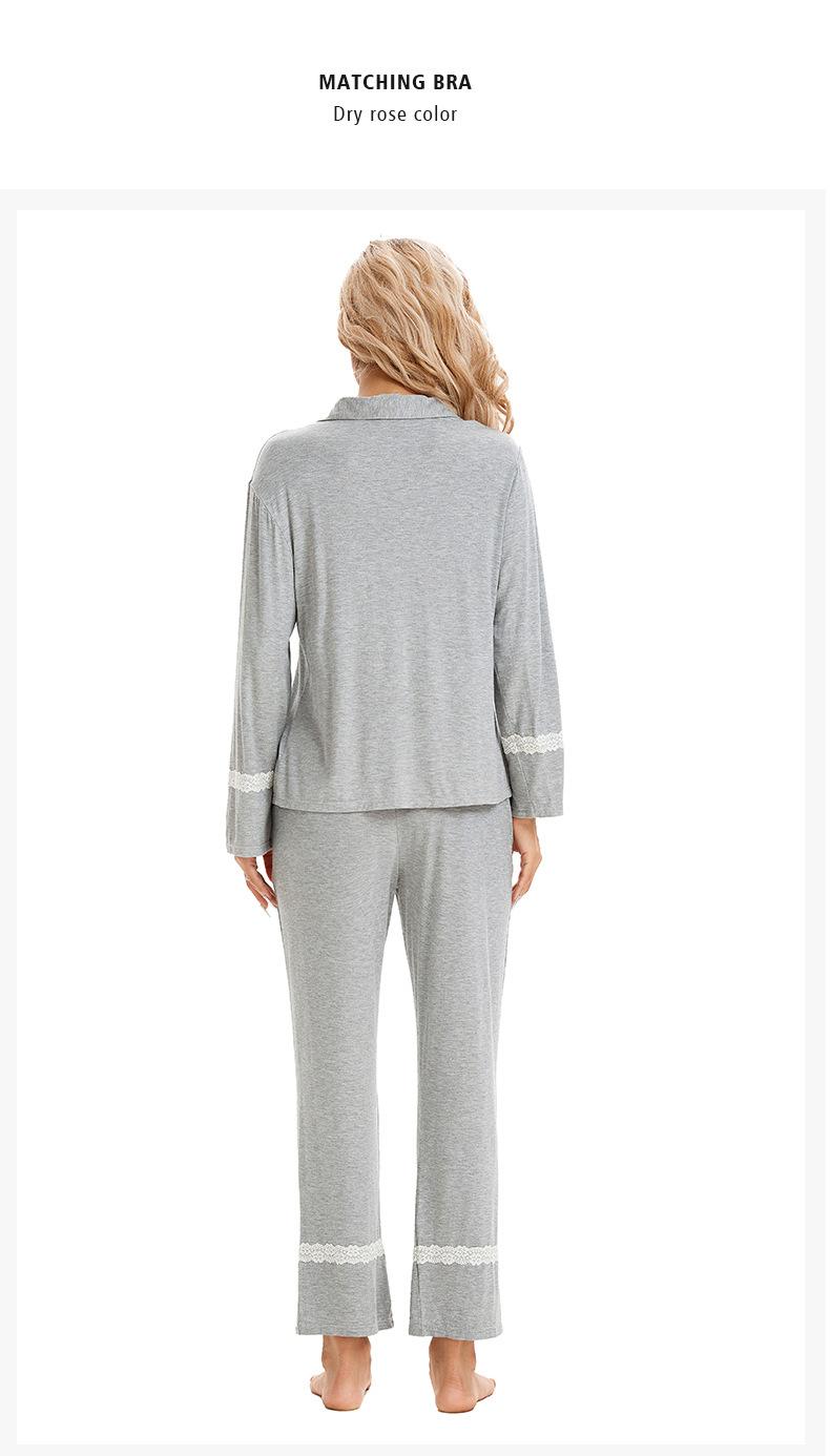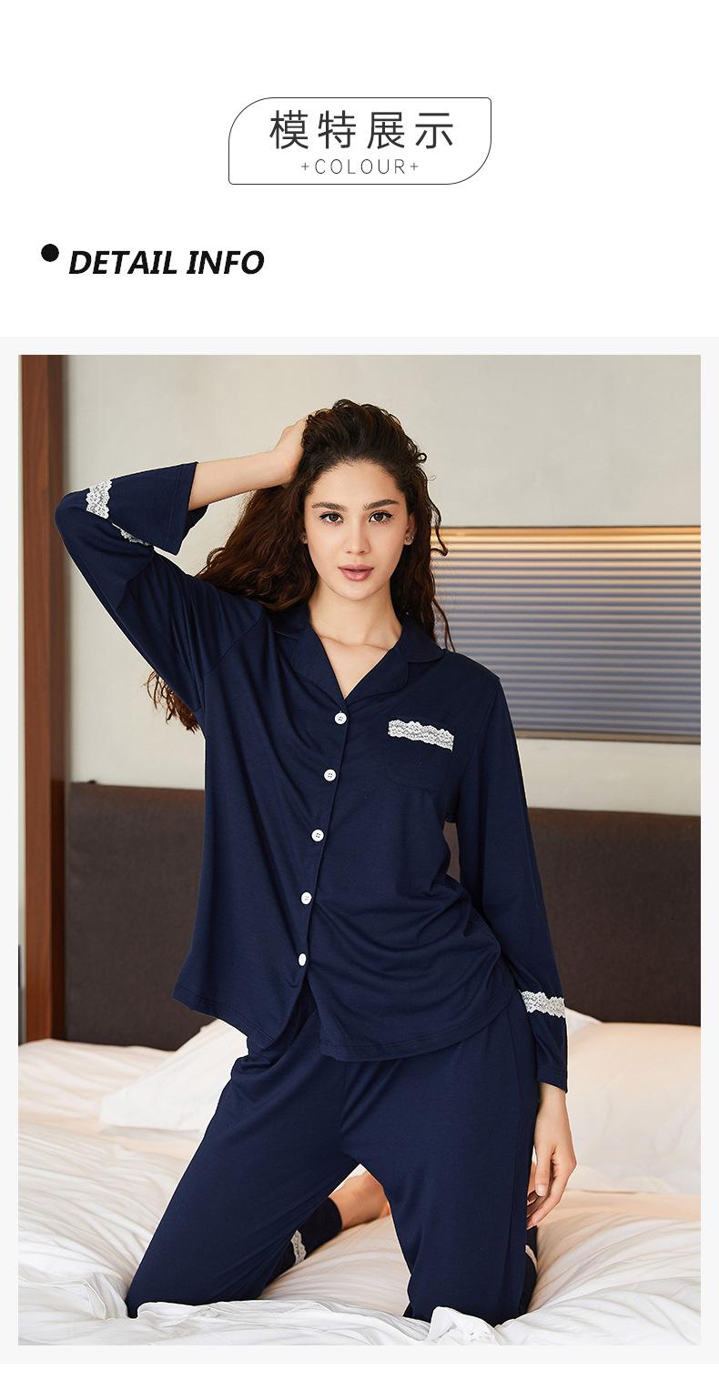 Pijama de comercio exterior para mujer, de color liso, de algodón tejido, suelto, con costuras de encaje, estilo europeo y americano, cárdigan, ropa para el hogar, traje, pantalones de manga larga