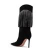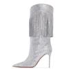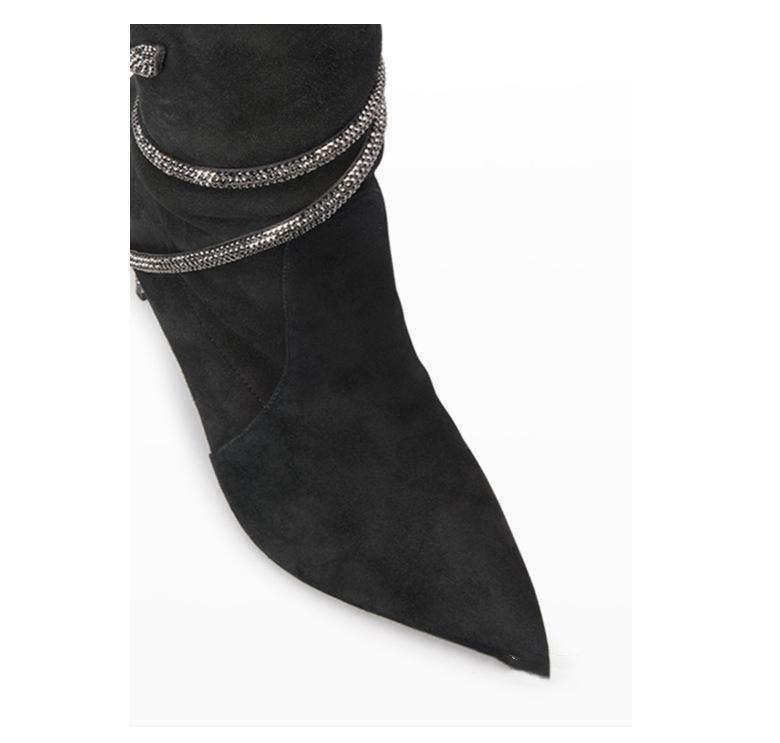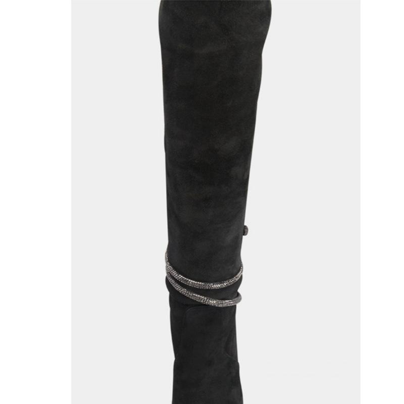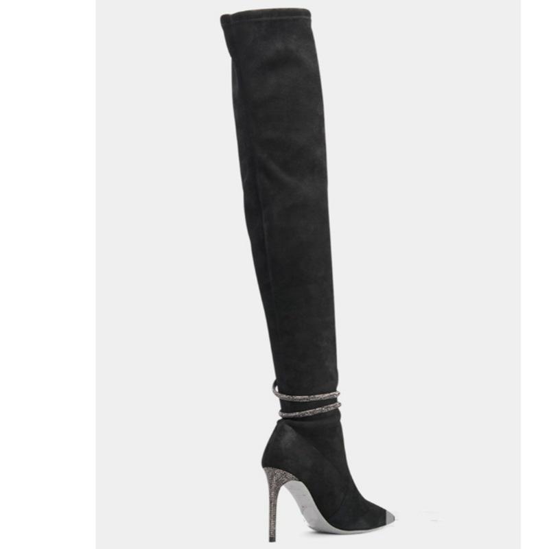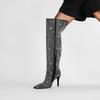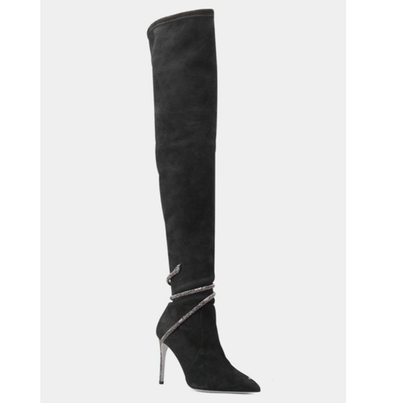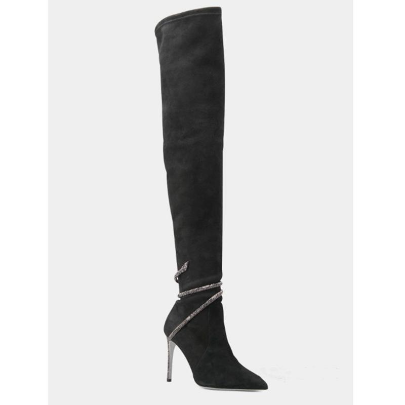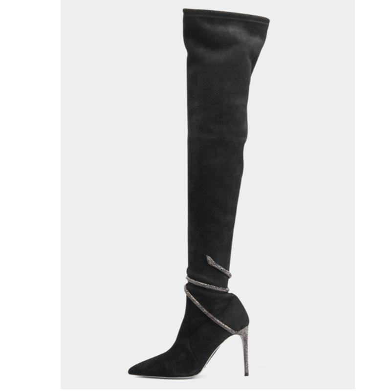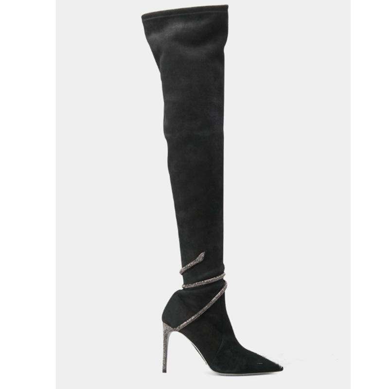 Botas por encima de la rodilla de tacón fino y puntiagudo para mujer, botines elásticos de gran tamaño con diseño de serpiente y diamantes de imitación, para invierno de 2024.