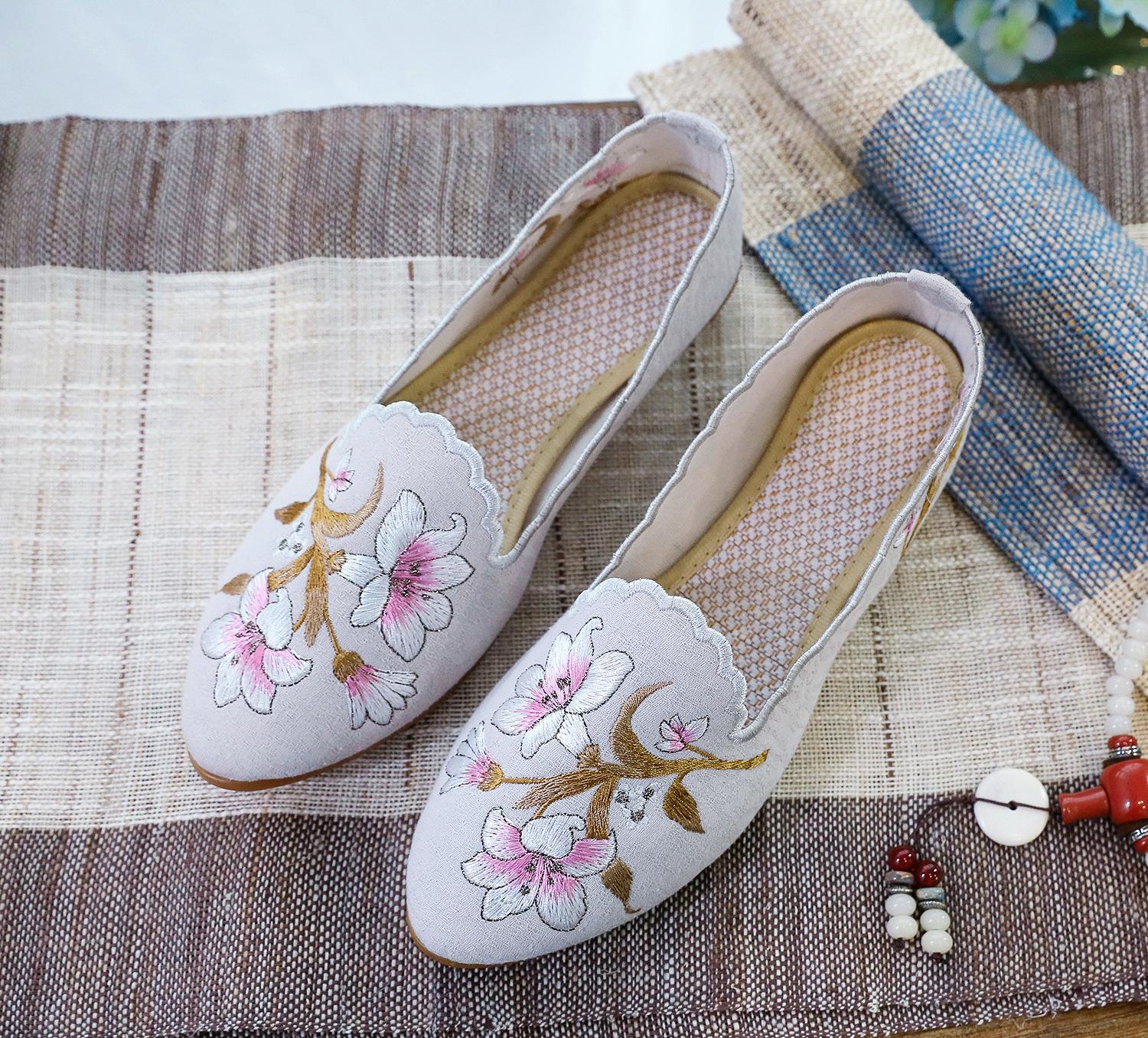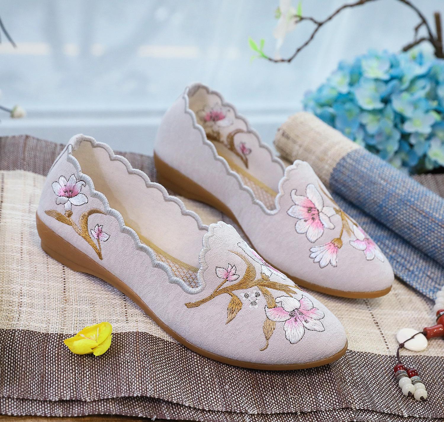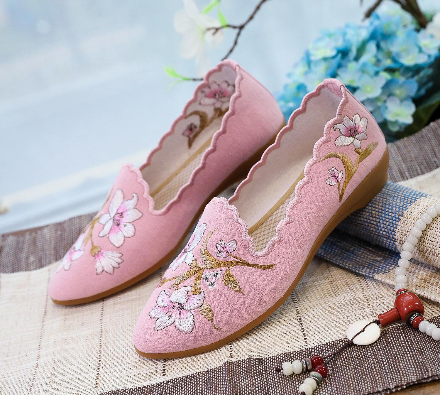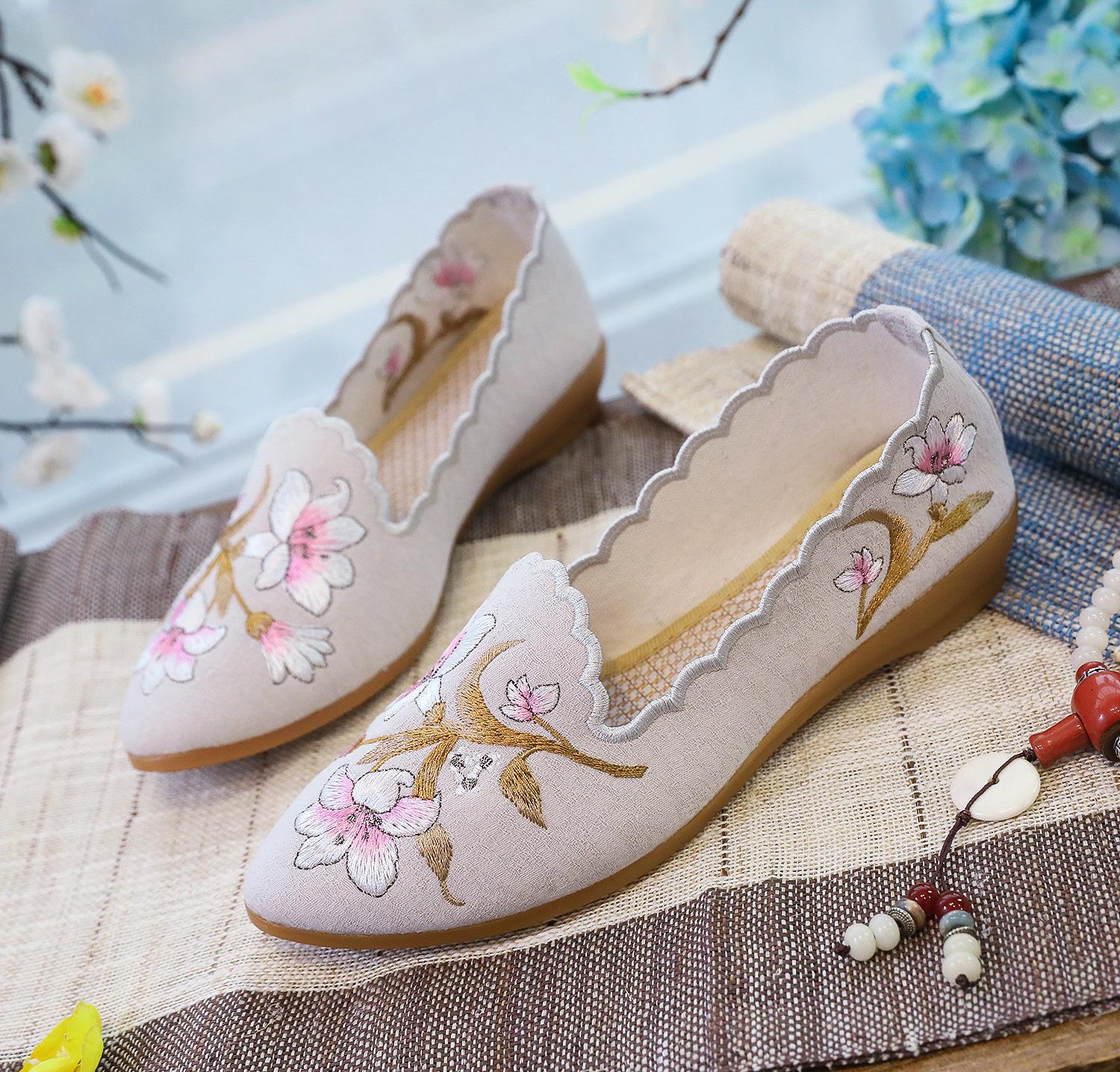 Zapatos planos de suela de res, primavera y verano, bordados tridimensionales, moda, zapatos de tela bordados, zapatos de mujer para madre