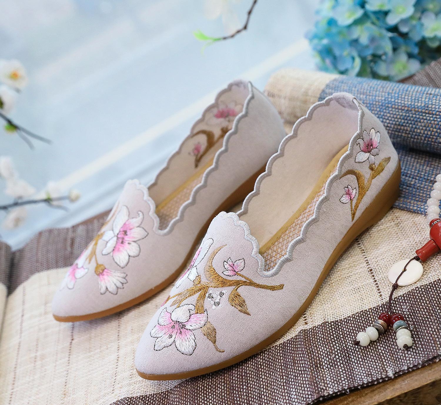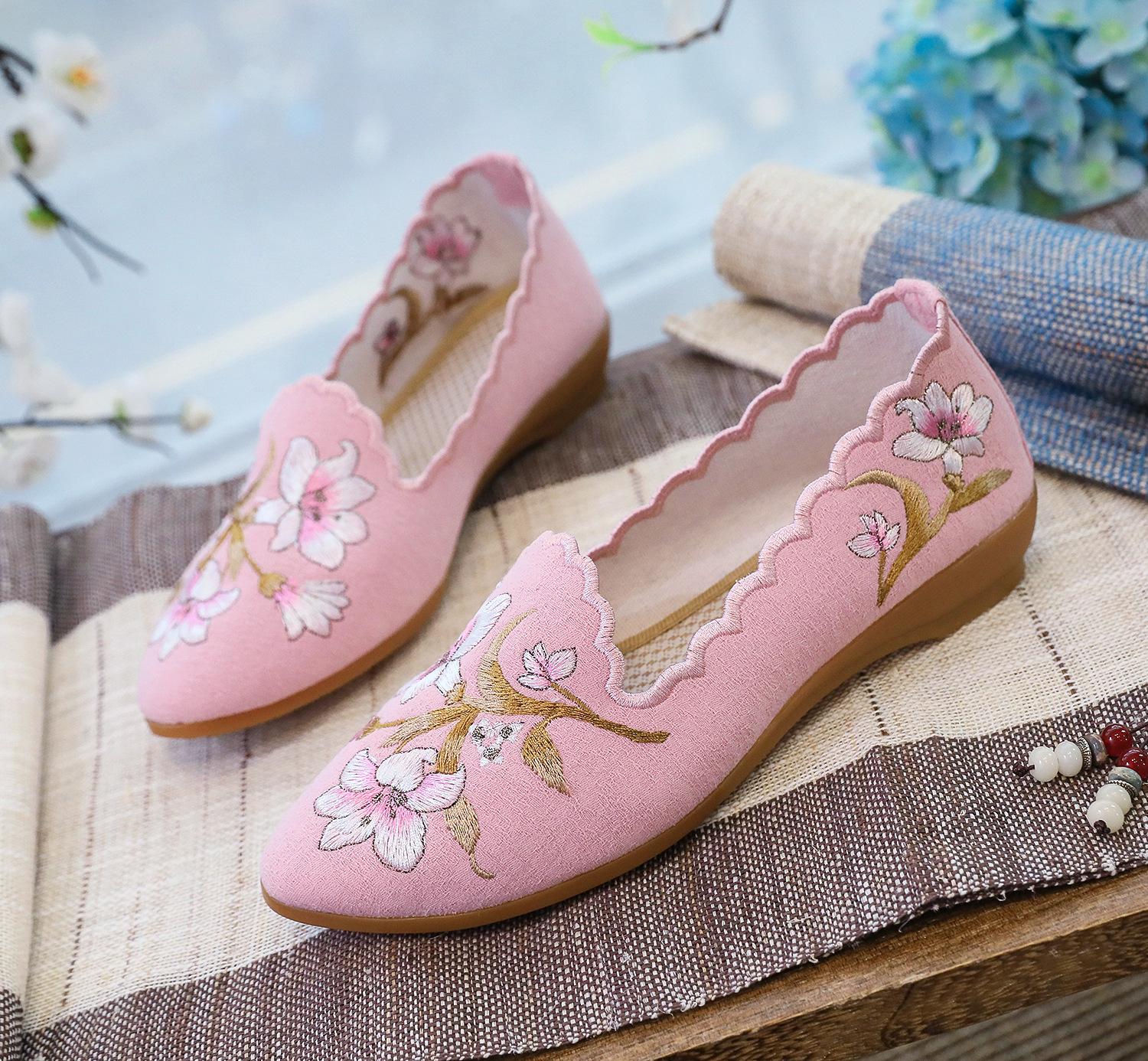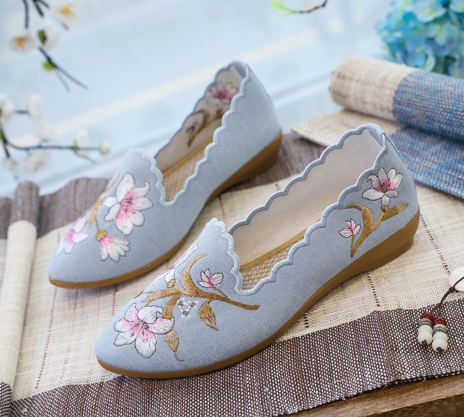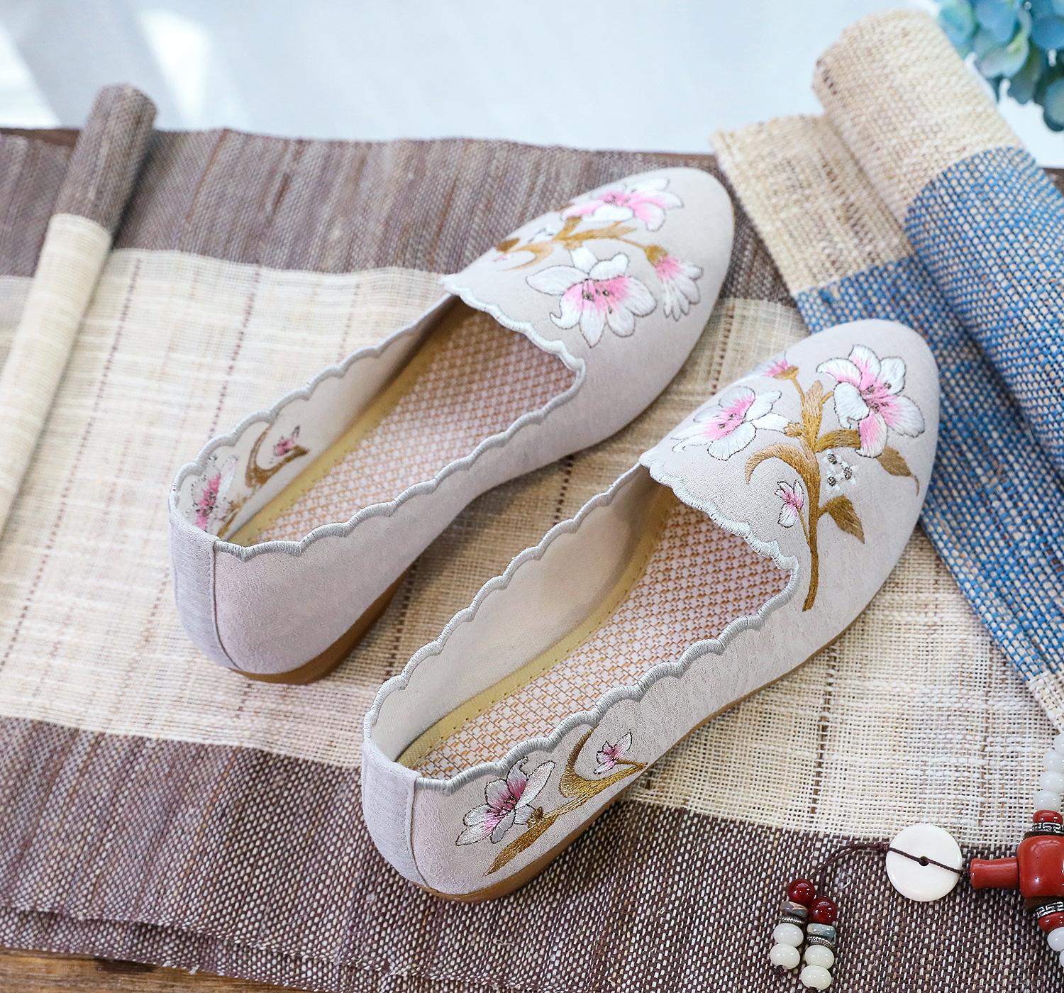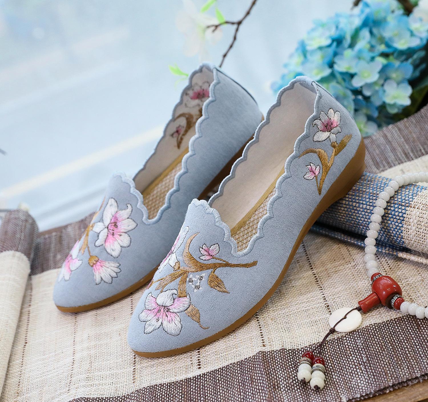 Zapatos planos de suela de res, primavera y verano, bordados tridimensionales, moda, zapatos de tela bordados, zapatos de mujer para madre
