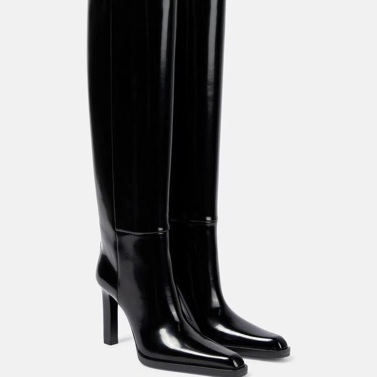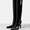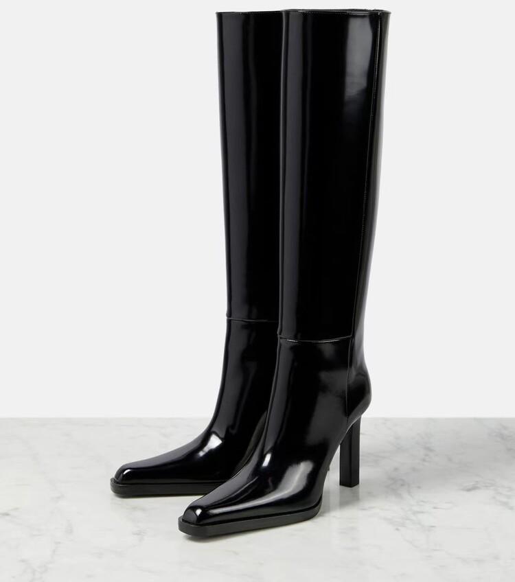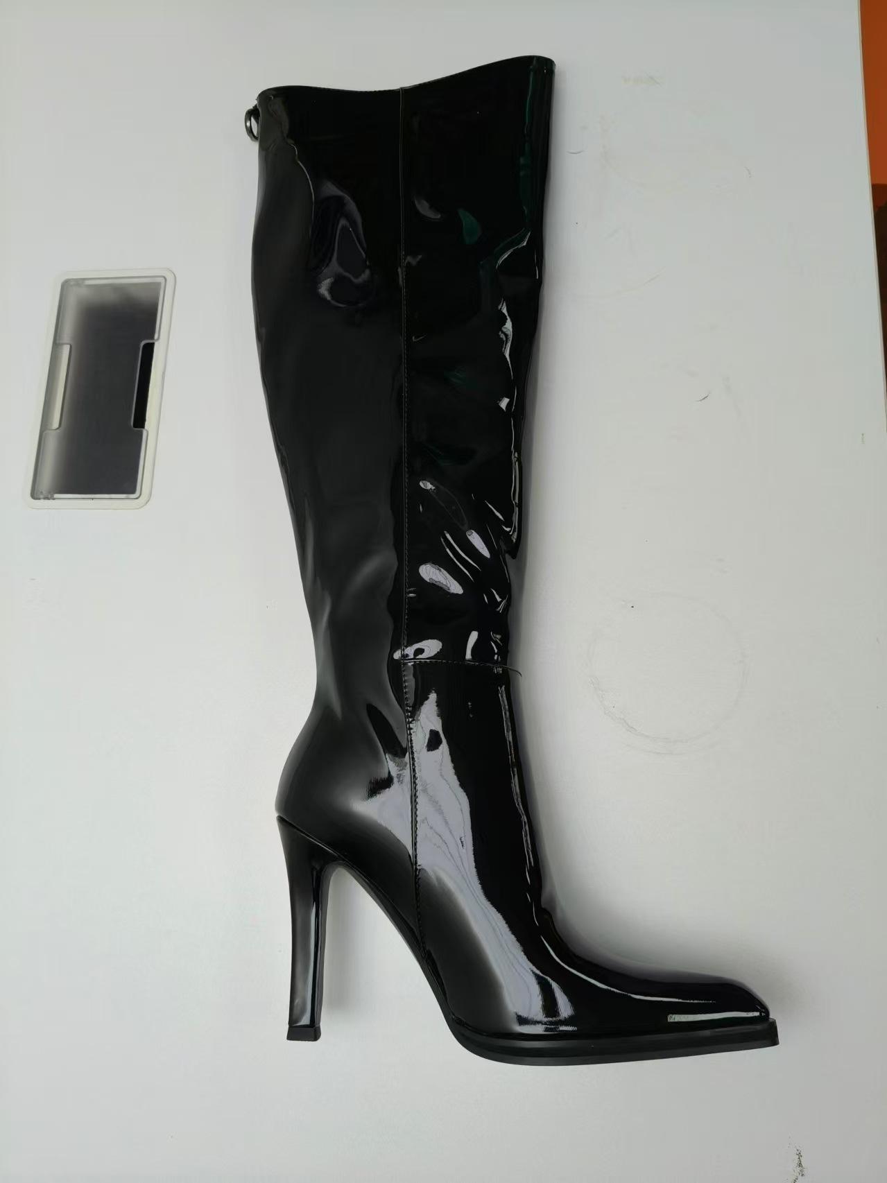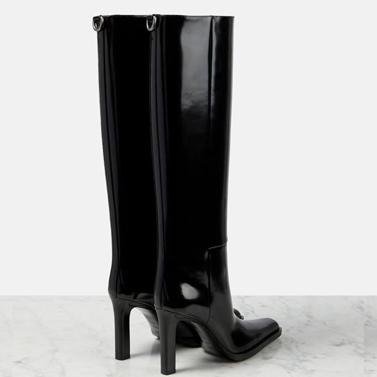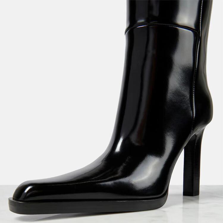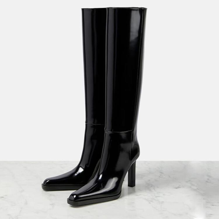 Botas altas de charol de comercio exterior para mujer, nuevas botas negras de 2024, punta cuadrada, tacón fino de moda pero hasta la rodilla.