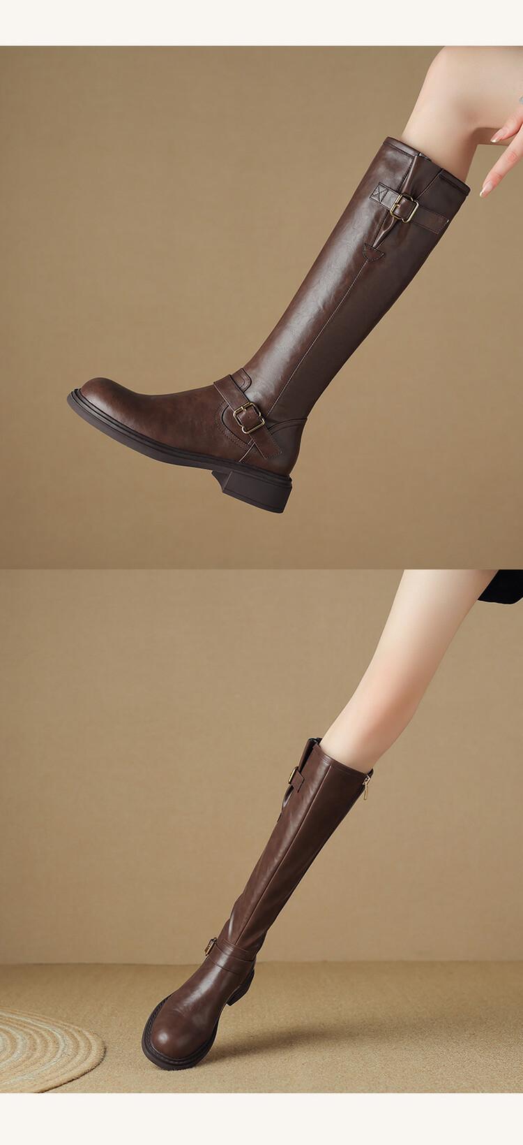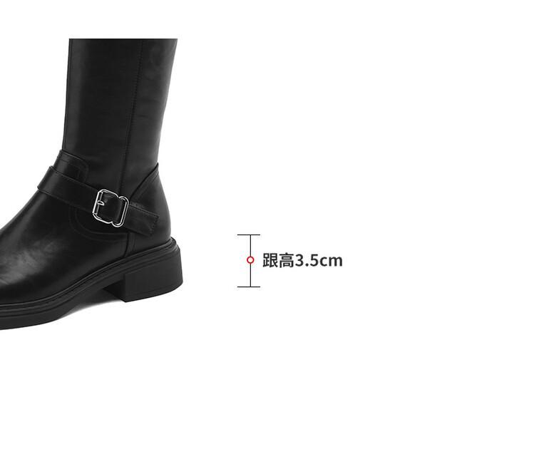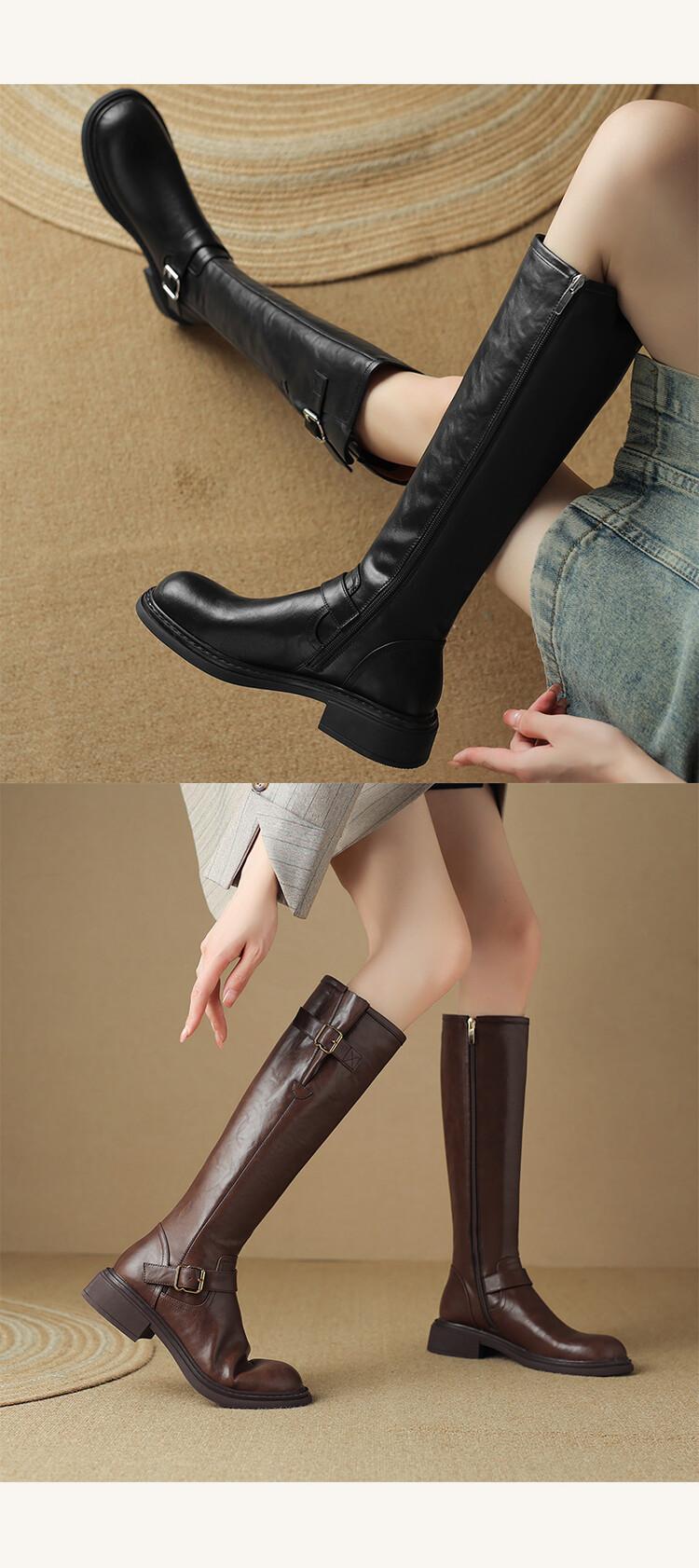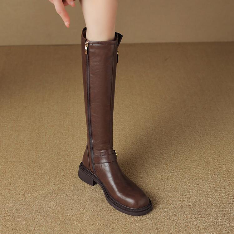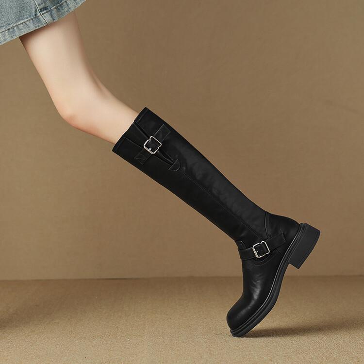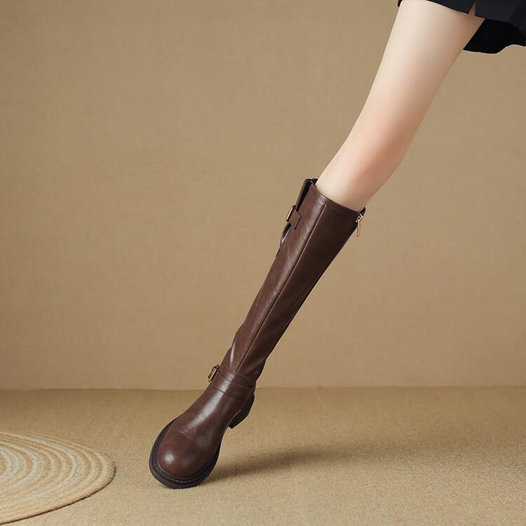 Botas Rectas de Cuero para Mujer 2025 Otoño e Invierno Punta Redonda Tacón Medio Hebilla de Cinturón Sobre la Rodilla Cremallera Lateral Botas de Equitación