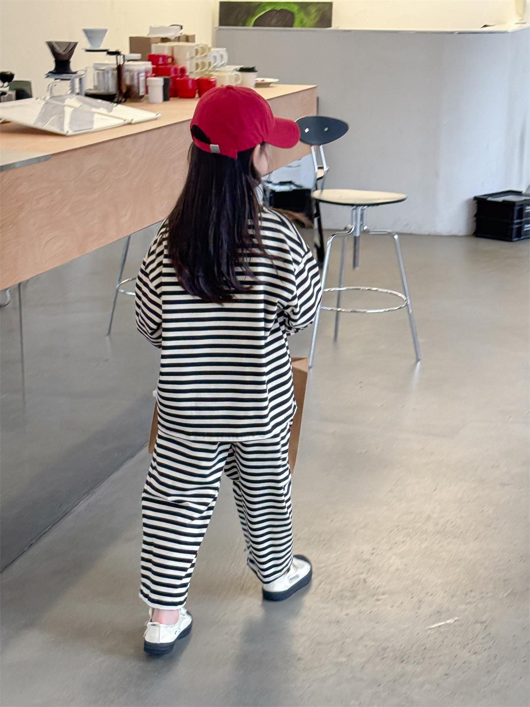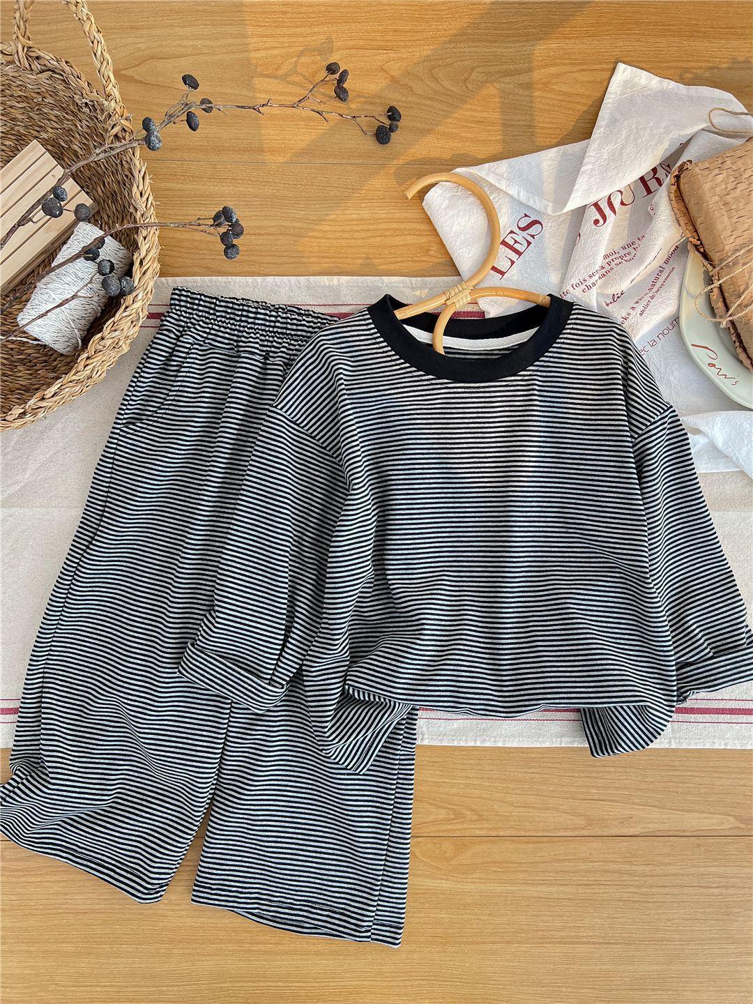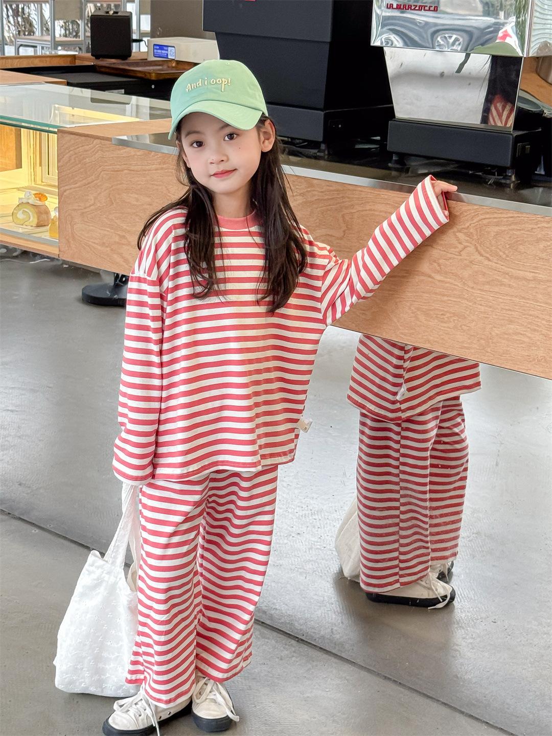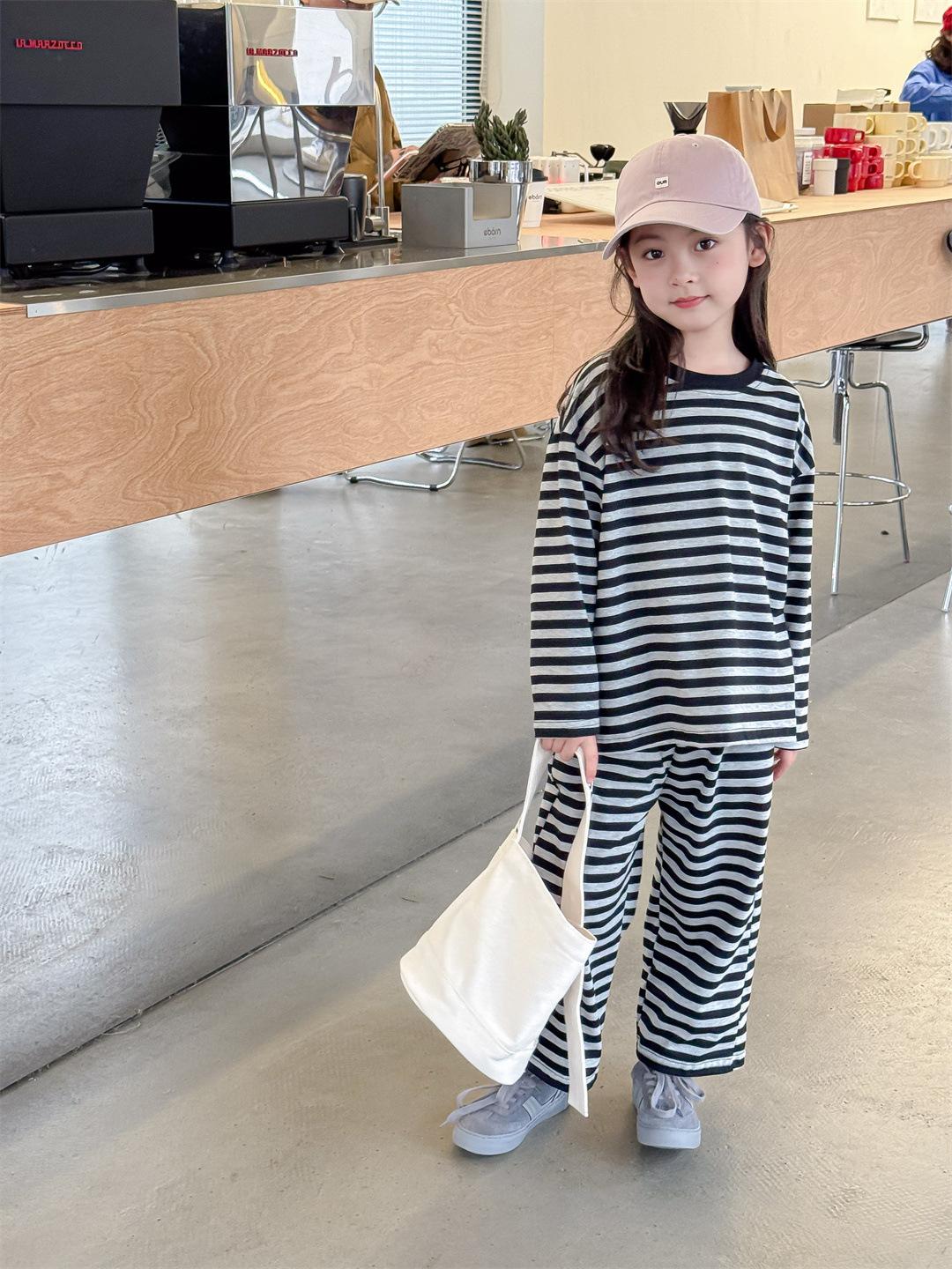Pijamas para niños 2024 Primavera Nuevo traje de ropa para el hogar a rayas Casual Suelto Hombro caído Ropa para el hogar para niños y niñas