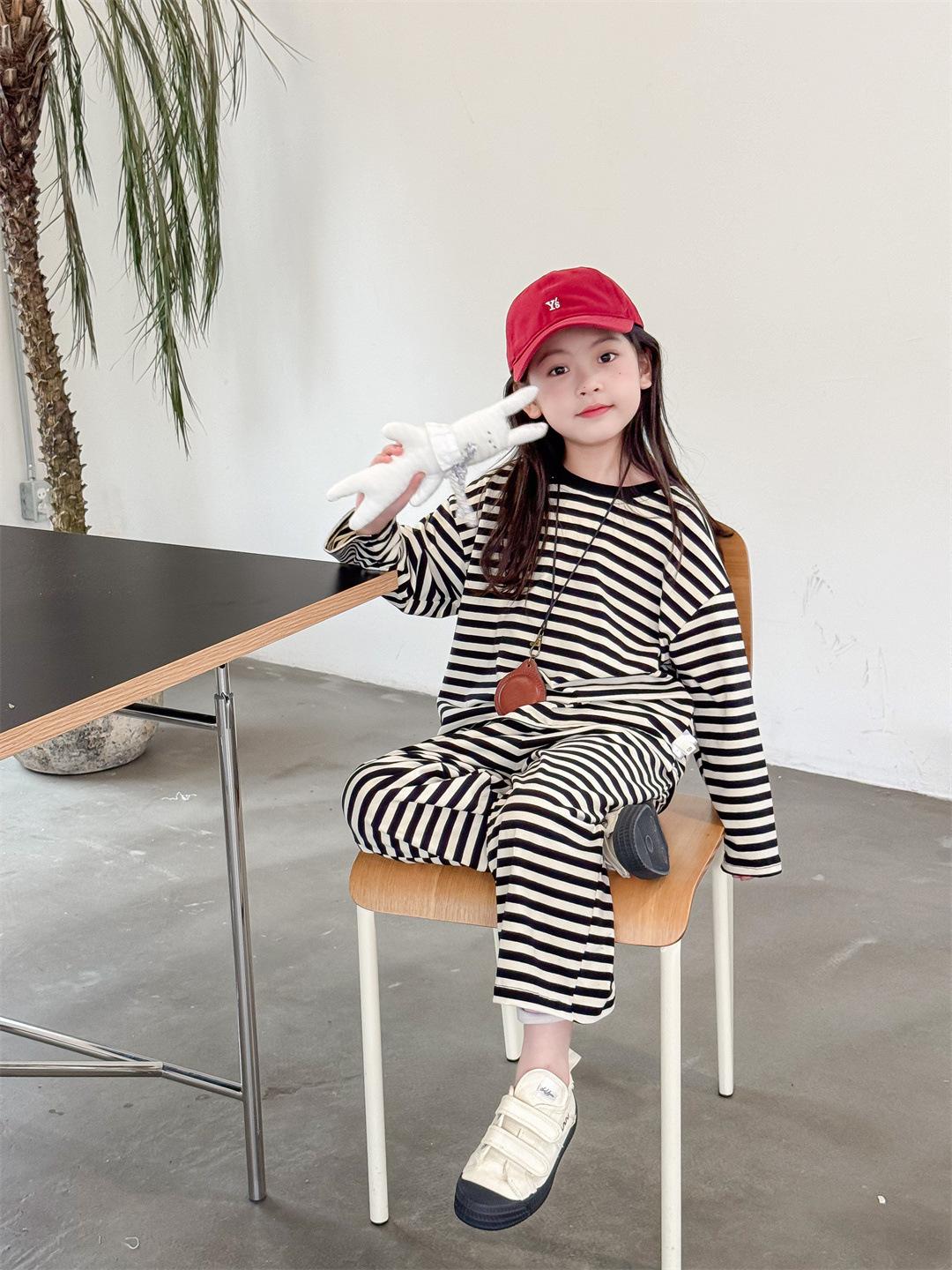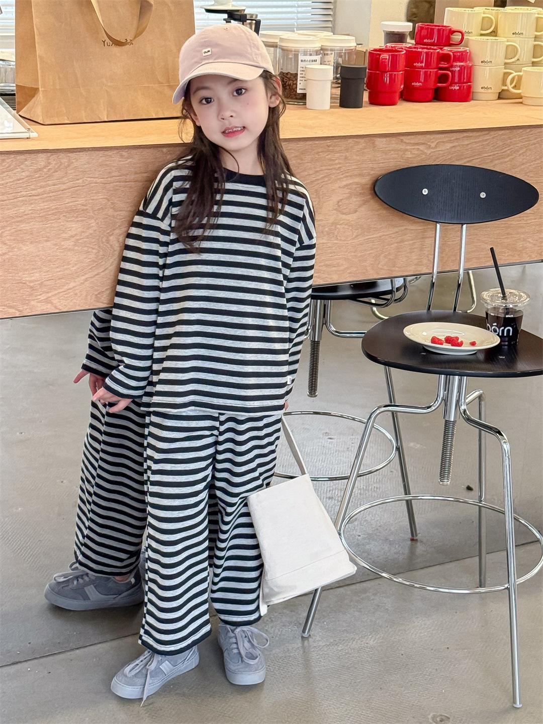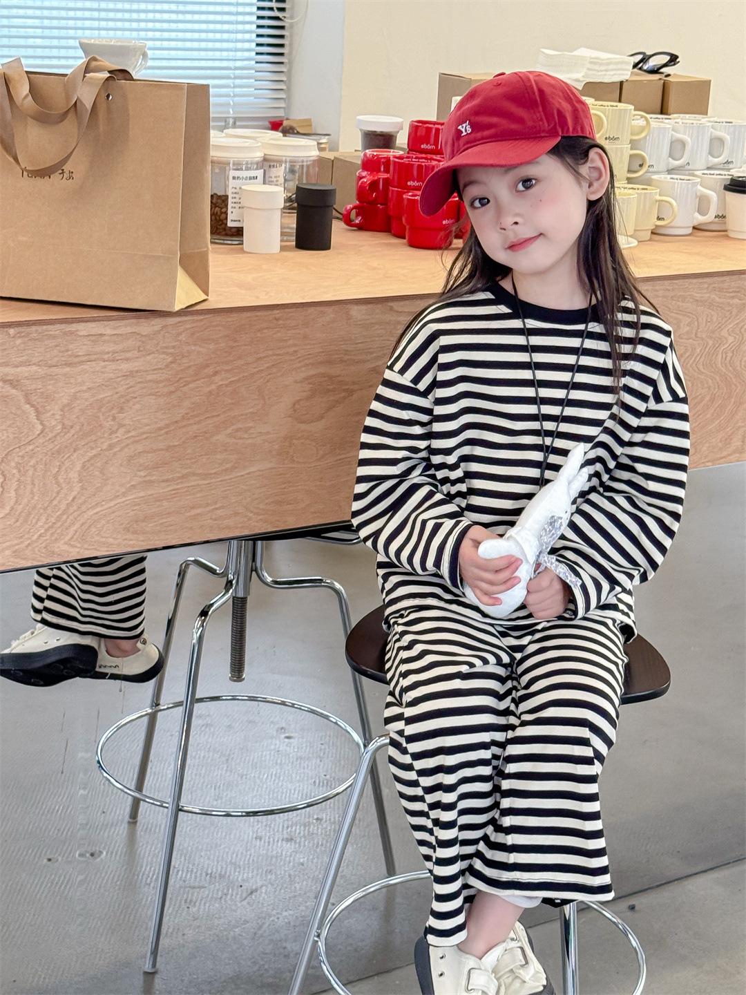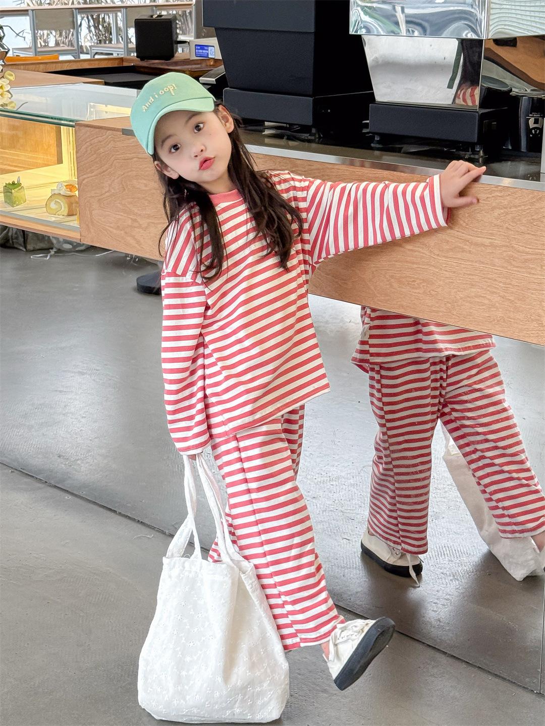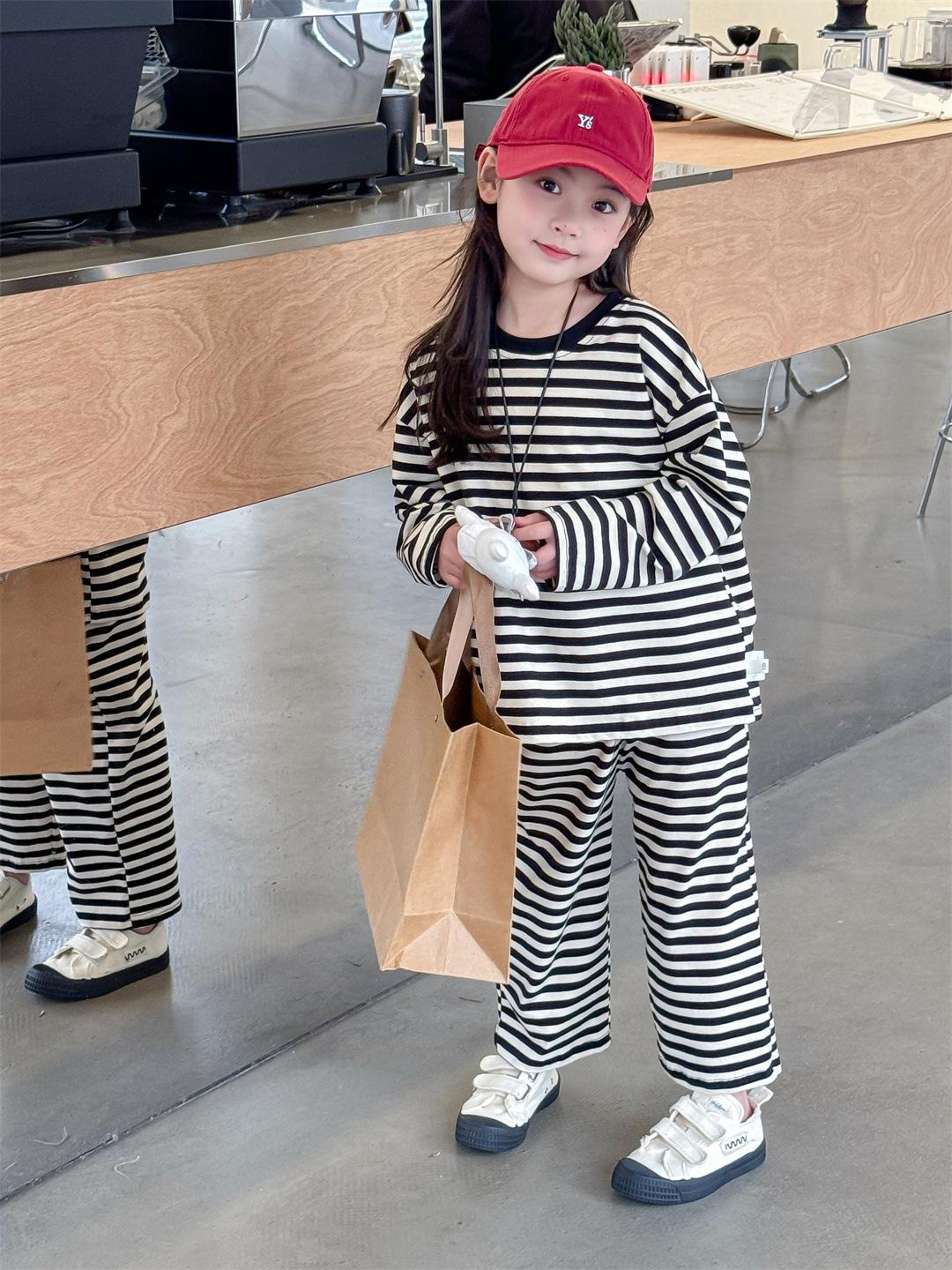 Pijamas para niños 2024 Primavera Nuevo traje de ropa para el hogar a rayas Casual Suelto Hombro caído Ropa para el hogar para niños y niñas