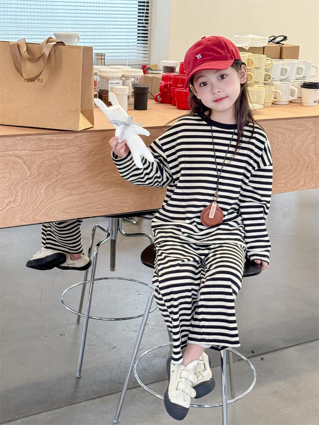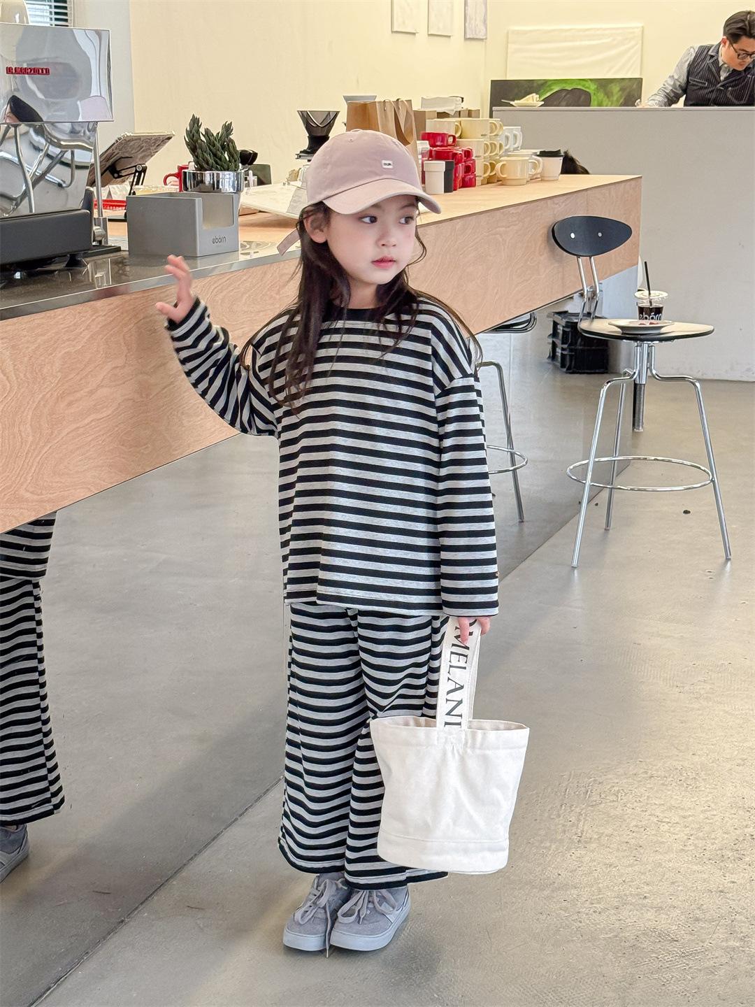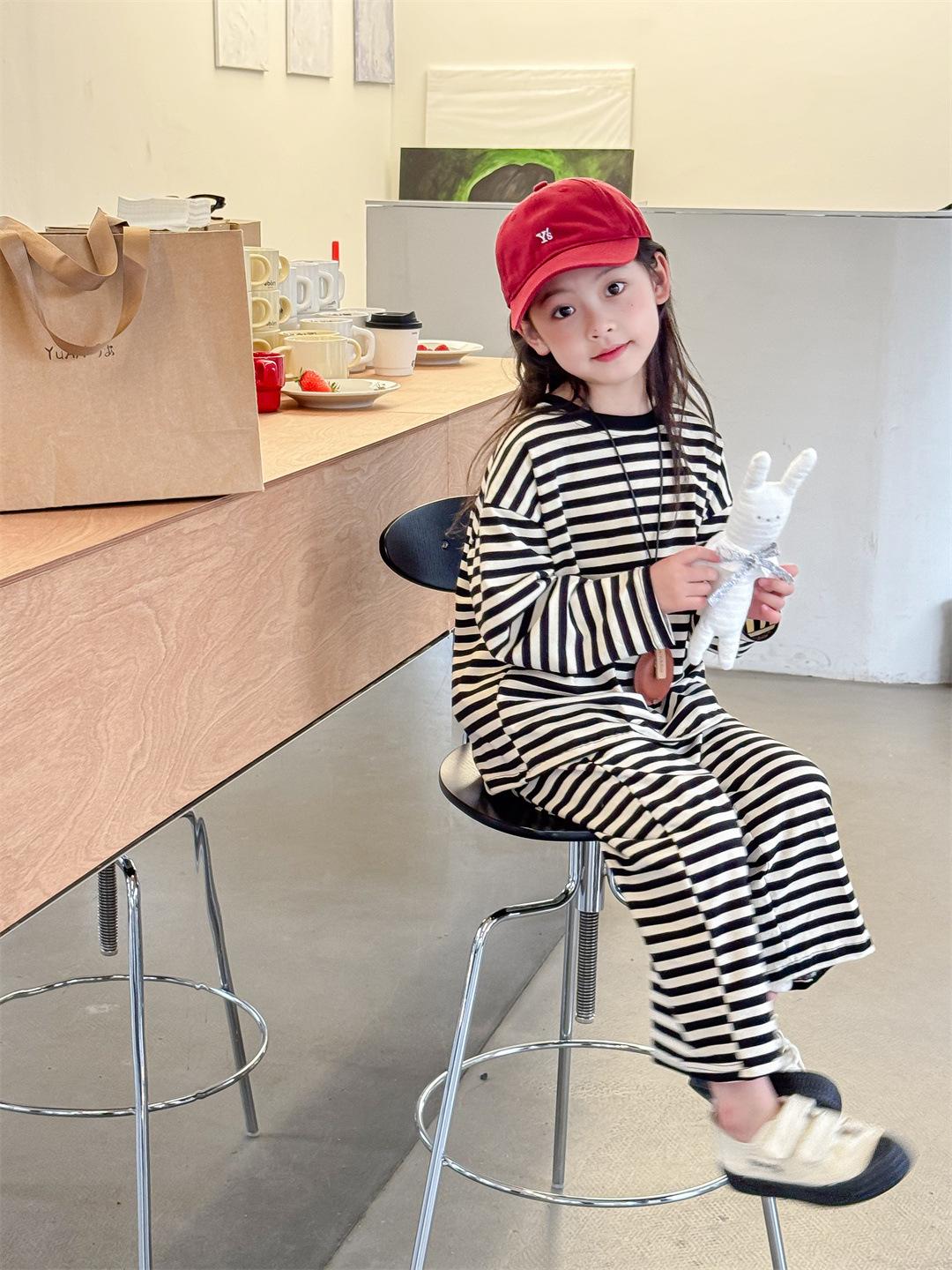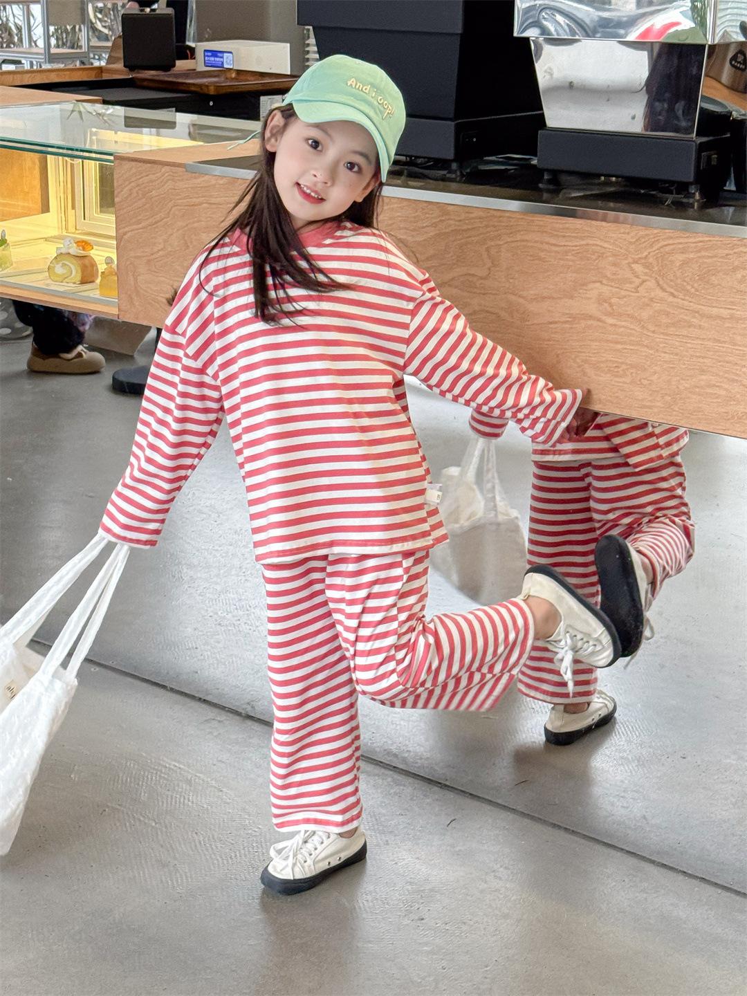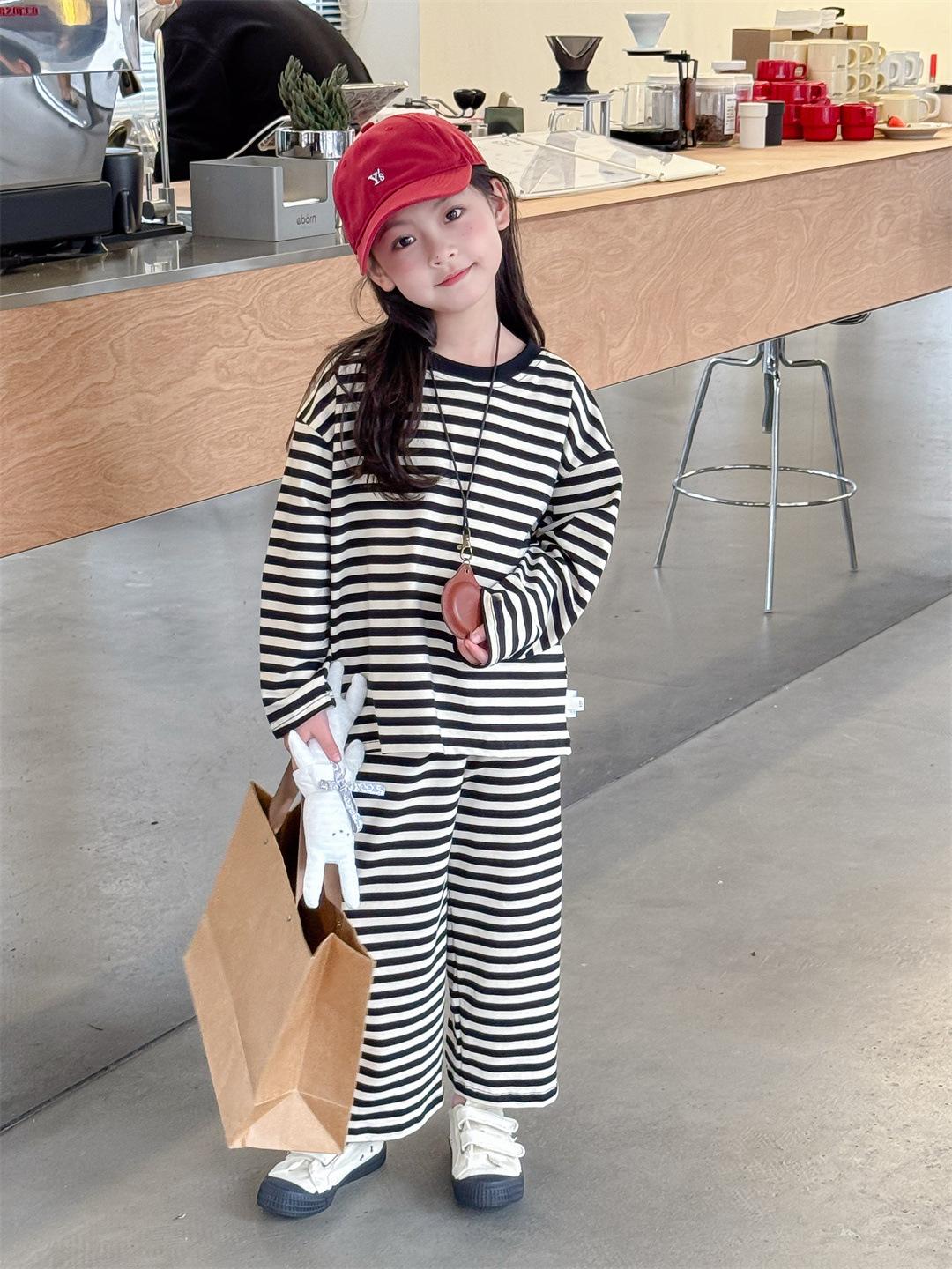 Pijamas para niños 2024 Primavera Nuevo traje de ropa para el hogar a rayas Casual Suelto Hombro caído Ropa para el hogar para niños y niñas