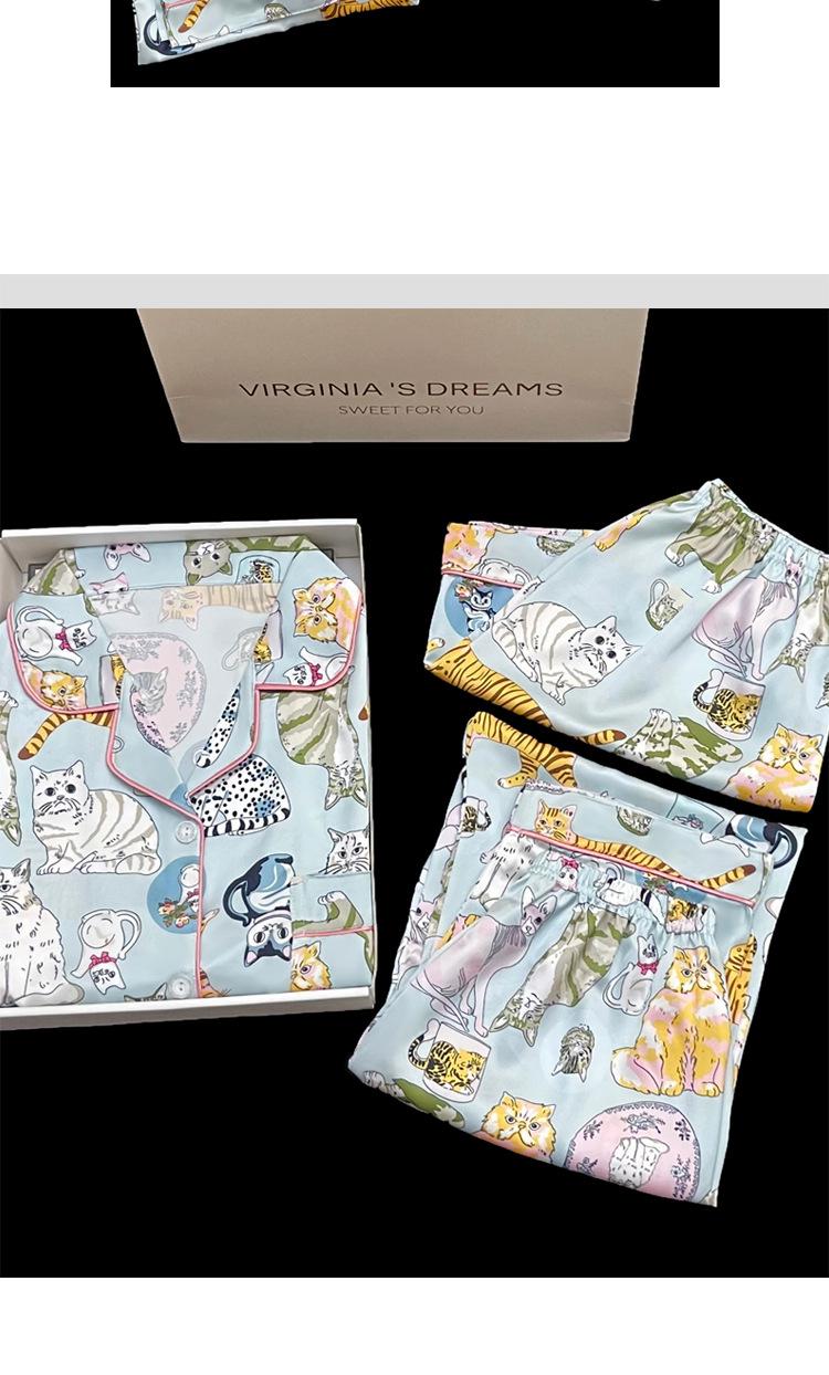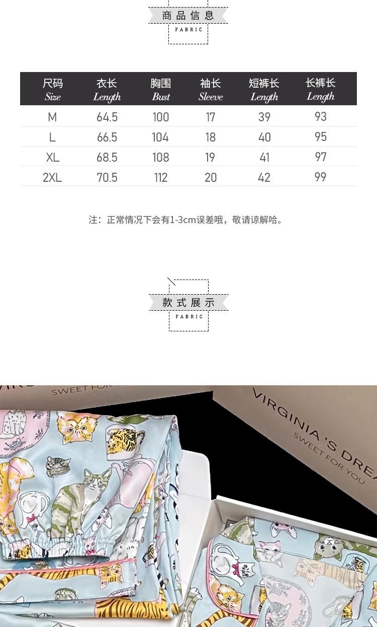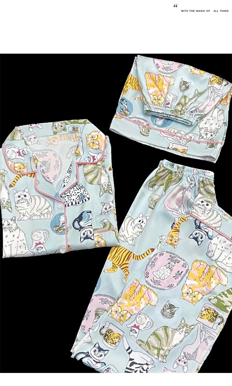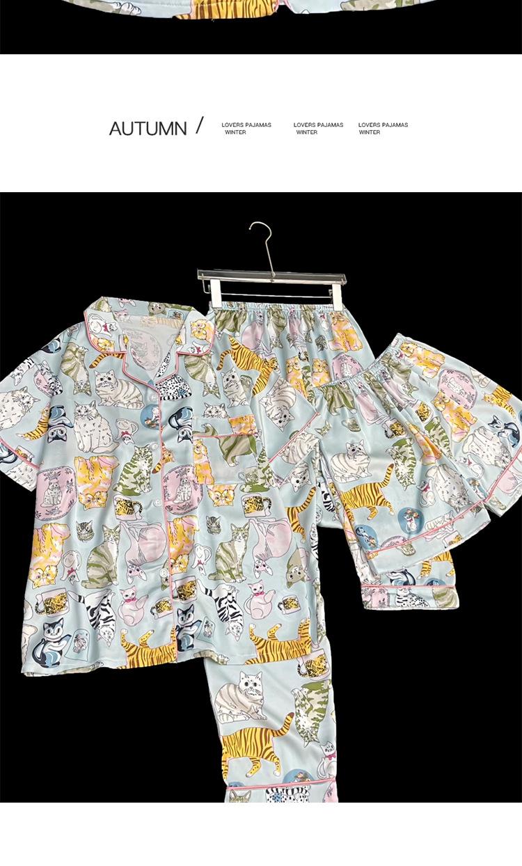 Pijama nuevo de primavera transfronterizo de seda de hielo de manga corta dulce y lindo de niña gato ropa para el hogar conjunto de tres piezas foto real venta al por mayor