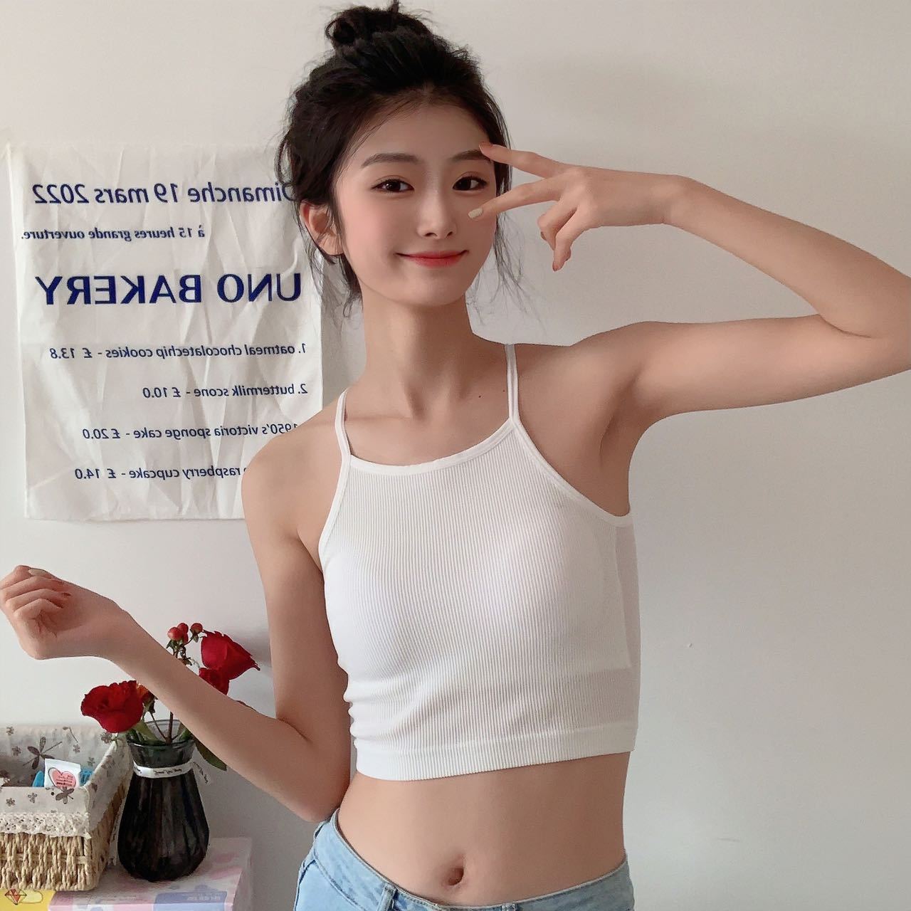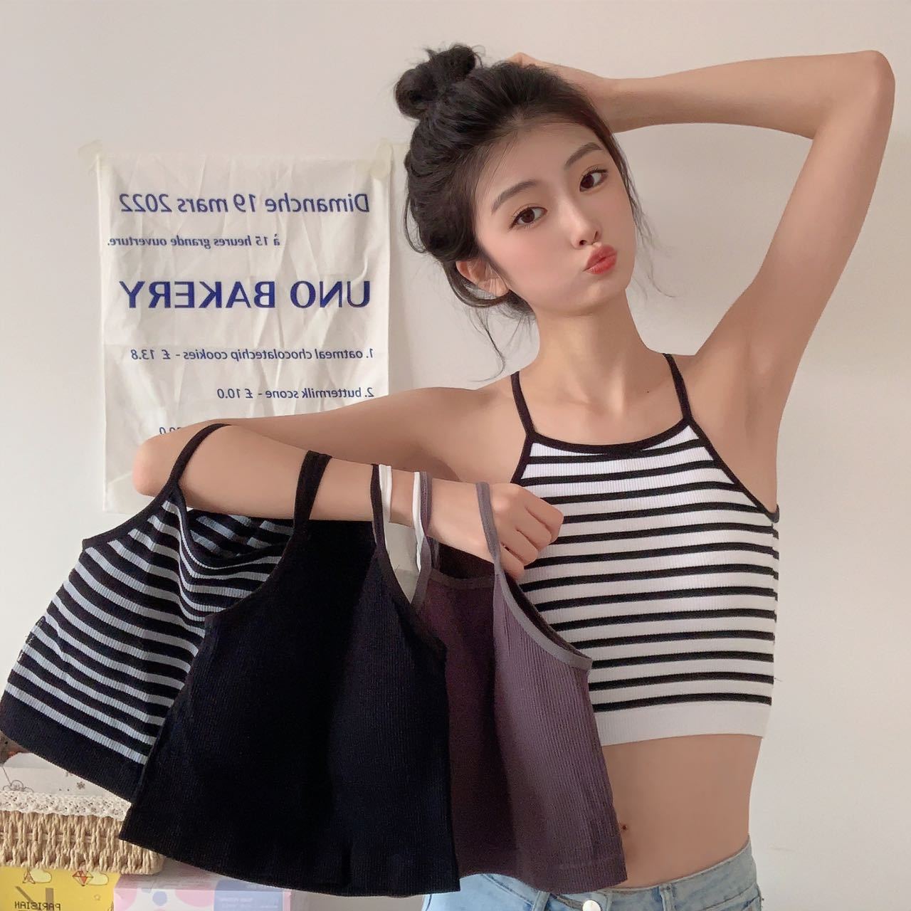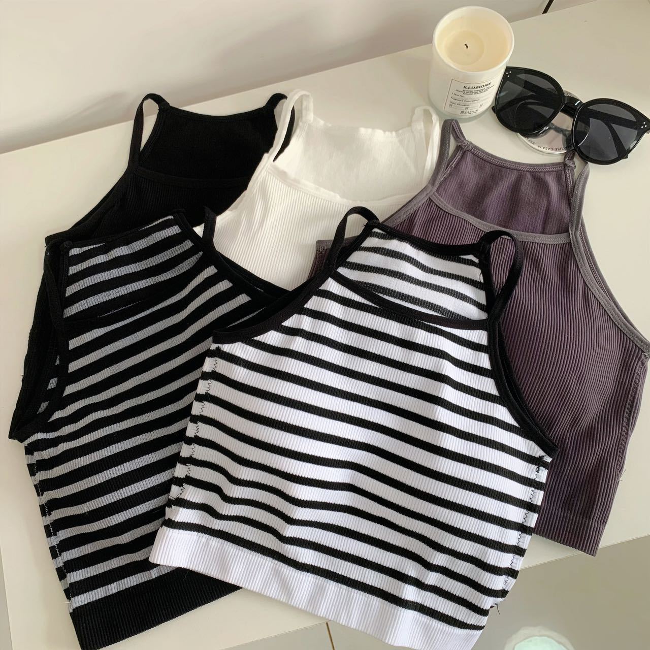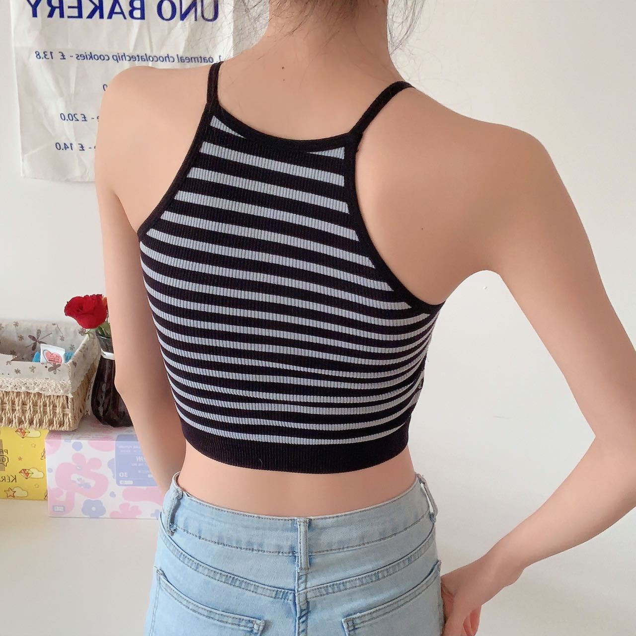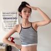 Chaleco de mujer Spice Girl con tirantes finos y almohadilla para el pecho, estilo primavera 2023, con una hermosa espalda y una camisa básica corta a rayas.