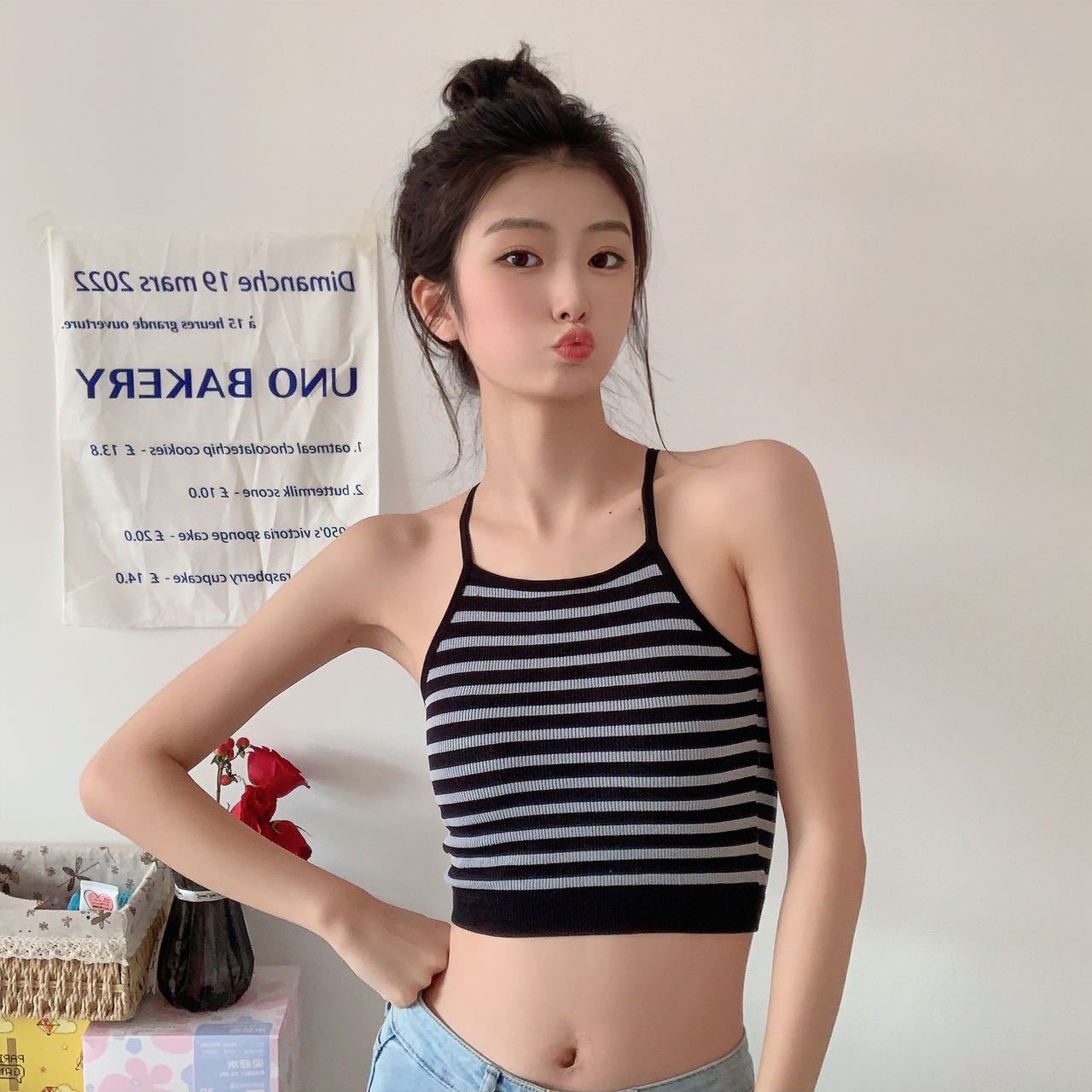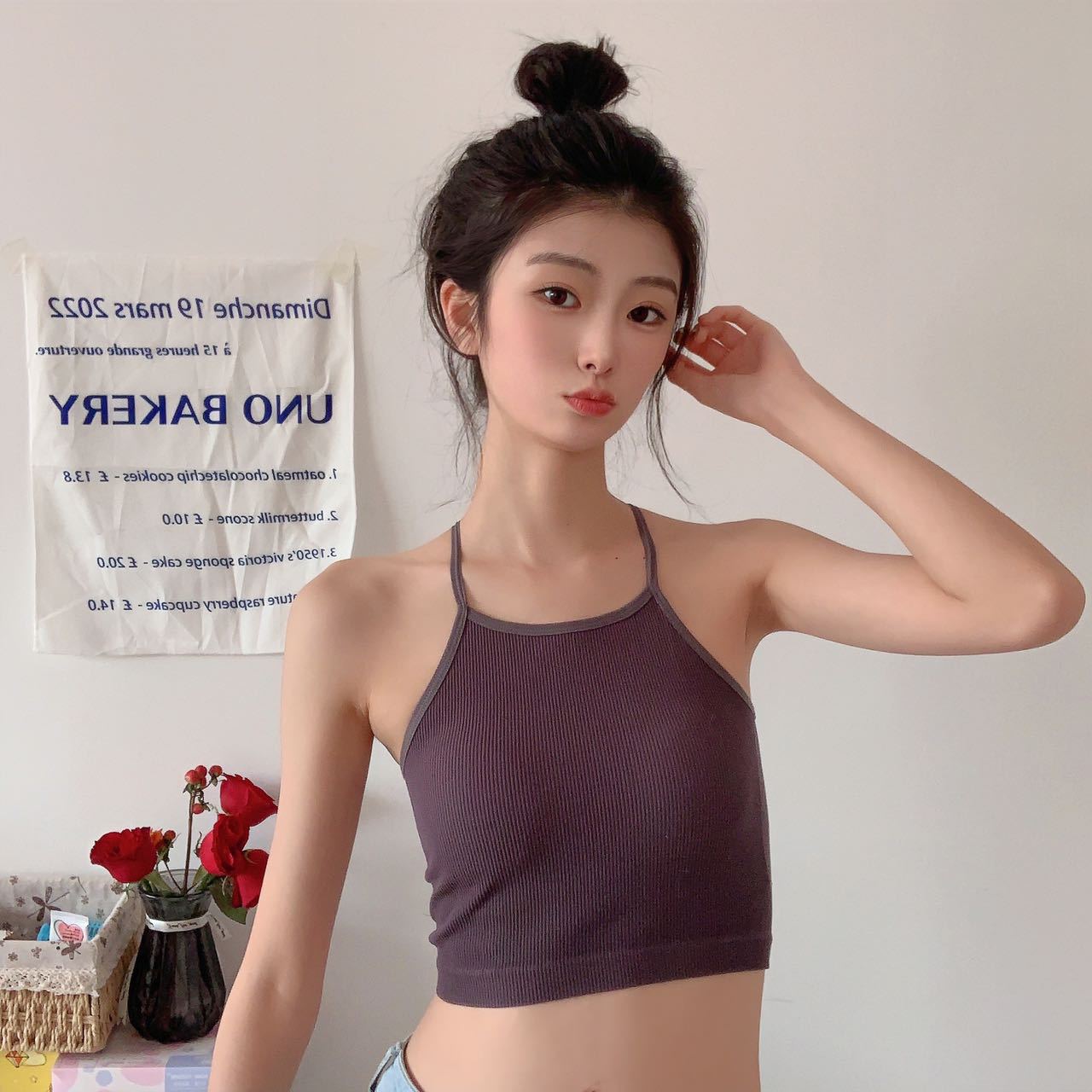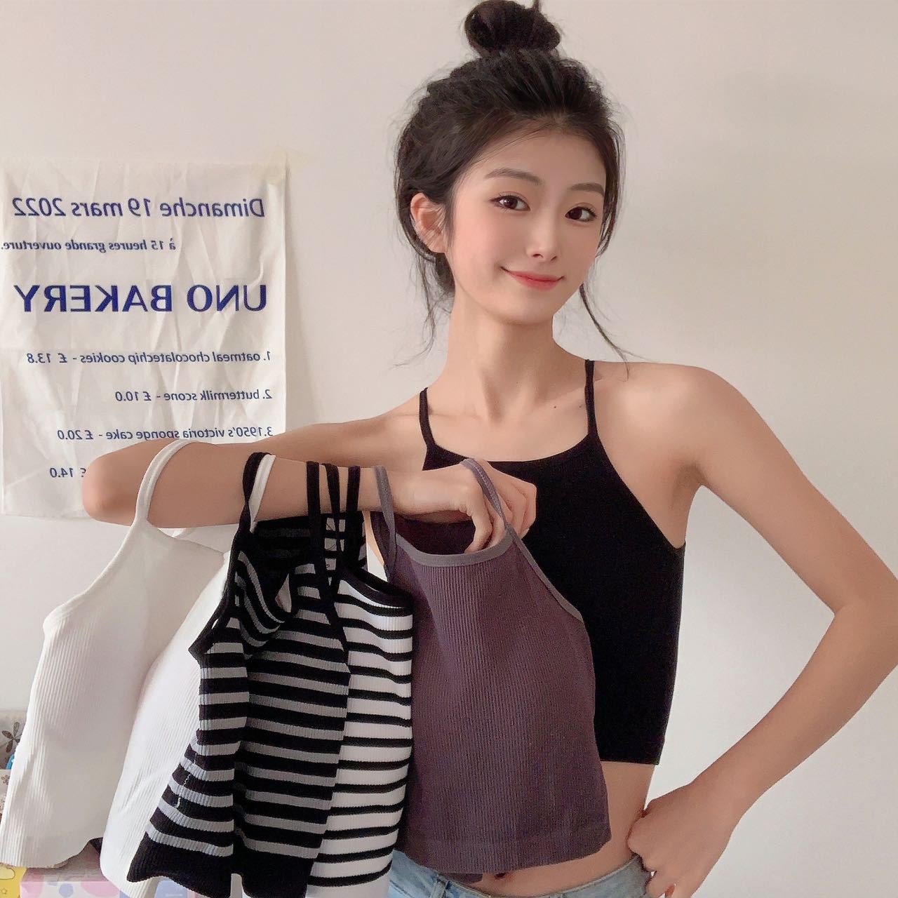 Chaleco de mujer Spice Girl con tirantes finos y almohadilla para el pecho, estilo primavera 2023, con una hermosa espalda y una camisa básica corta a rayas.