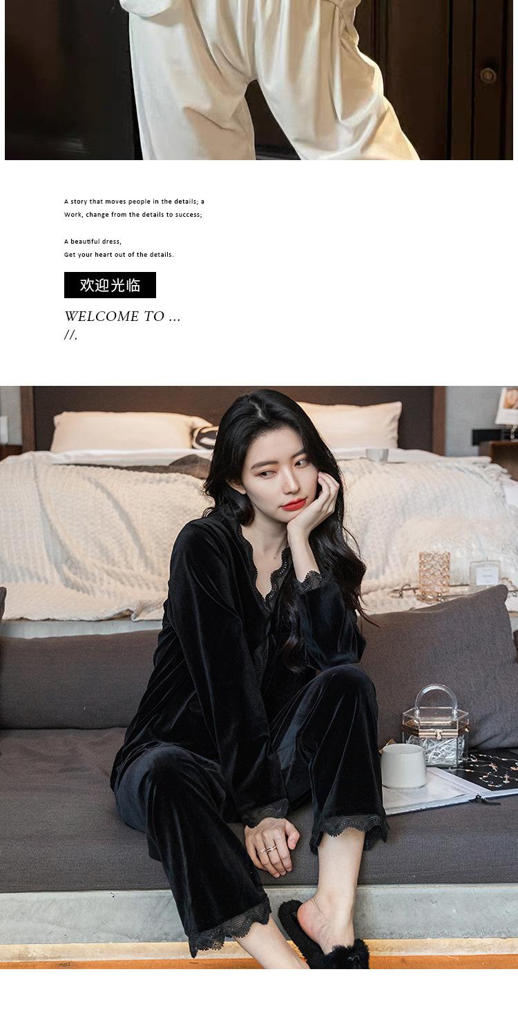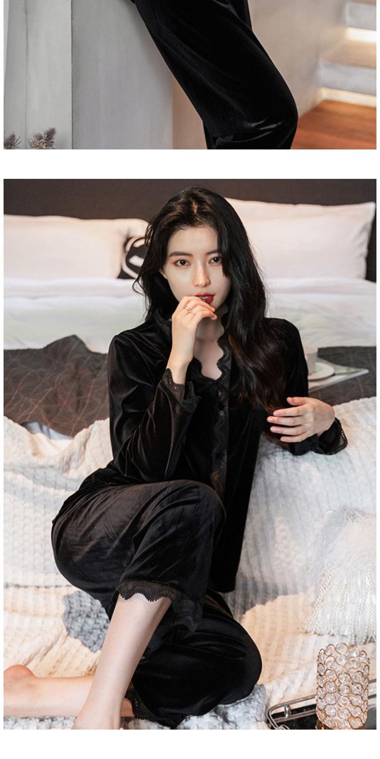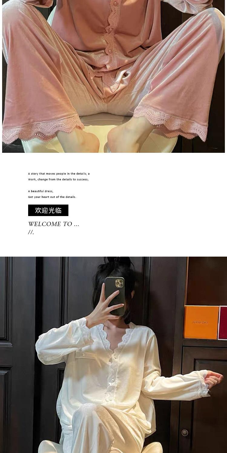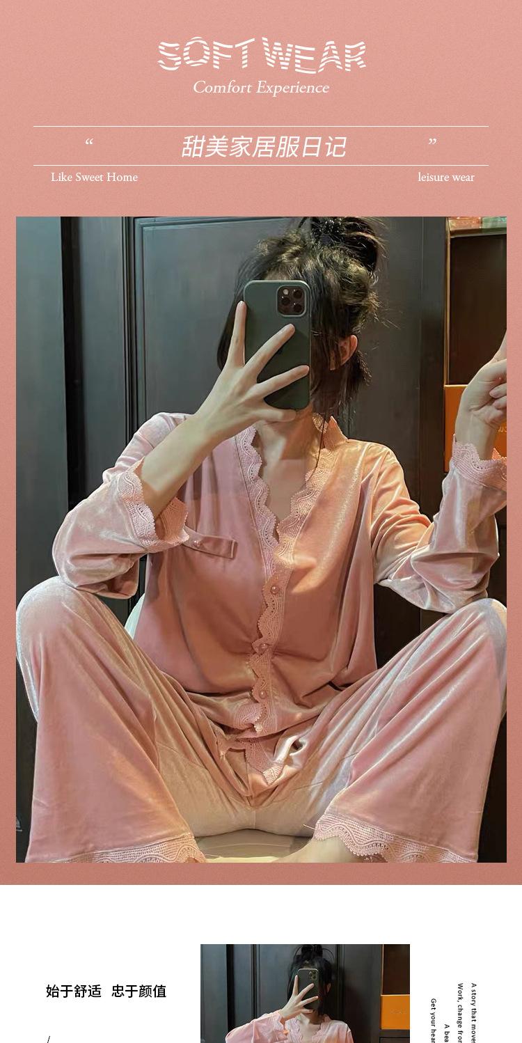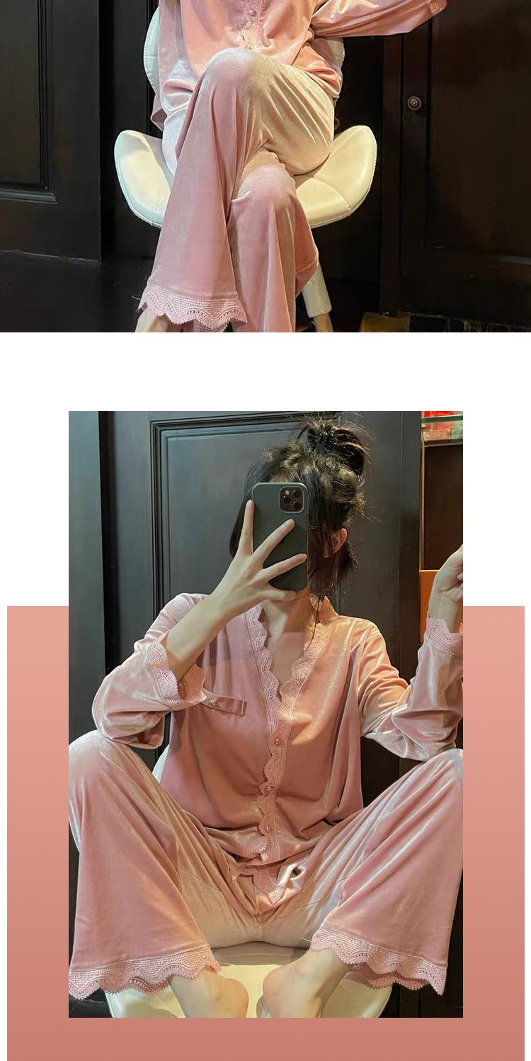 Otoño e invierno nuevo rojo en línea traje de pijama de terciopelo dorado para mujer moda de alta gama temperamento encaje cárdigan ropa de casa al por mayor