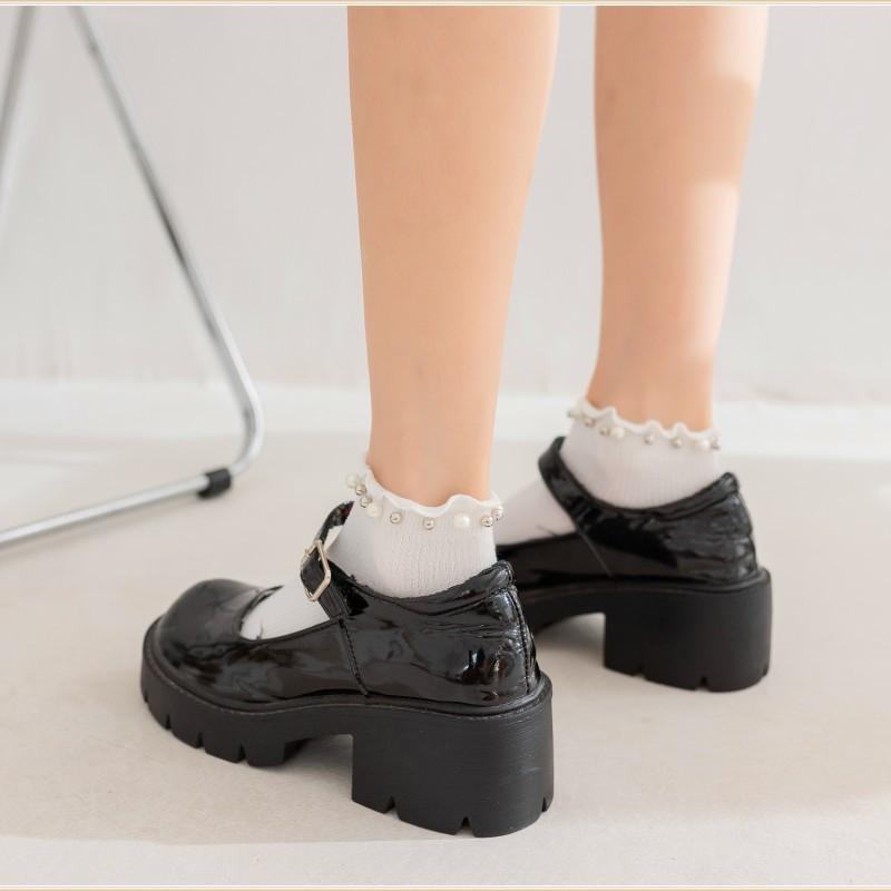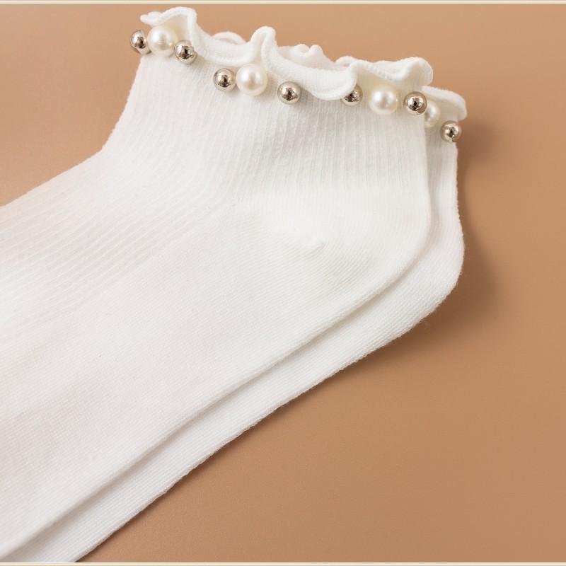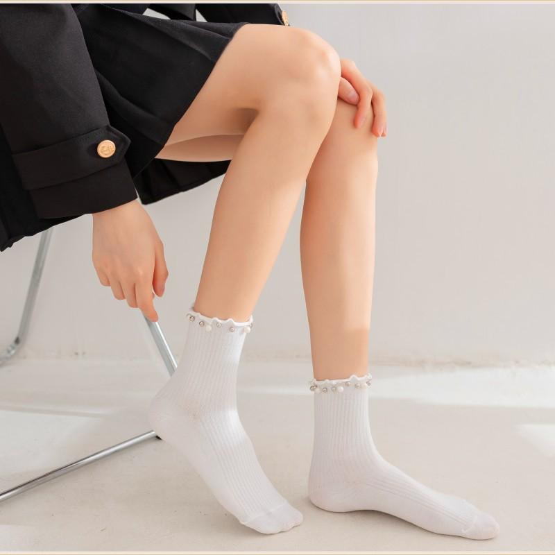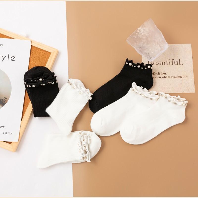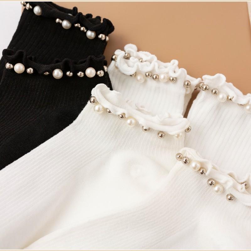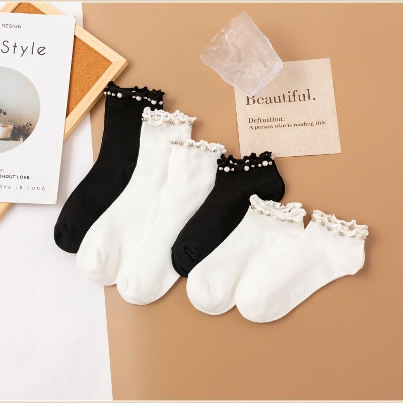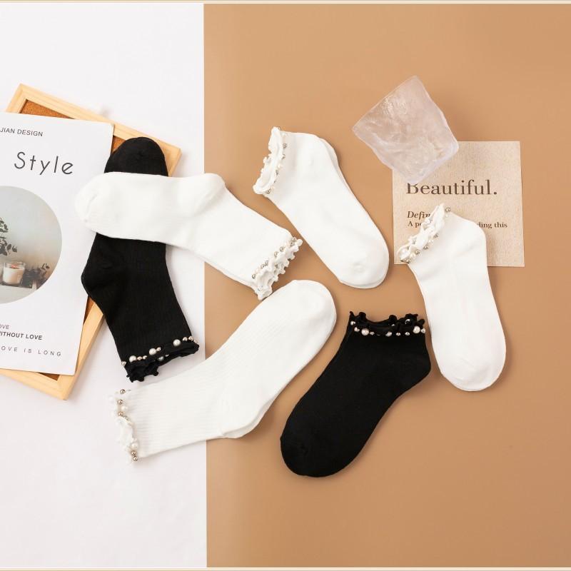 Calcetines para Mujer Primavera y Otoño Color Clásico Blanco y Negro Calcetines de Media Caña Populares en Internet Calcetines de Barco de Perlas para Mujer Moda Combinable Calcetines JK