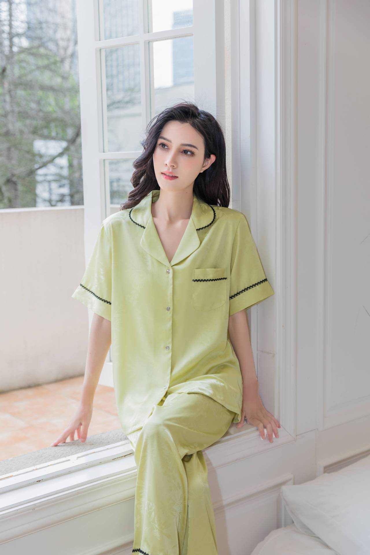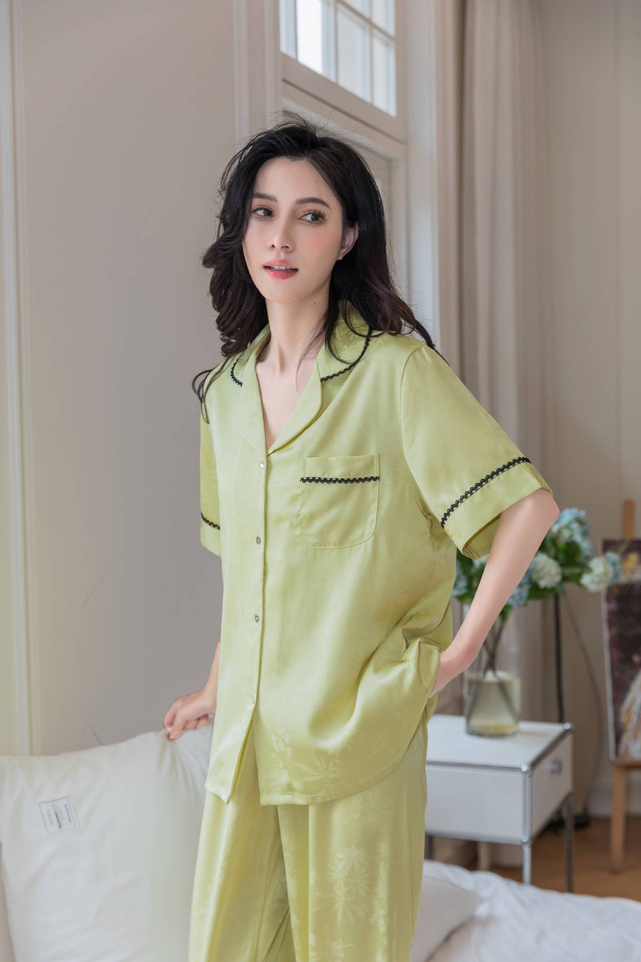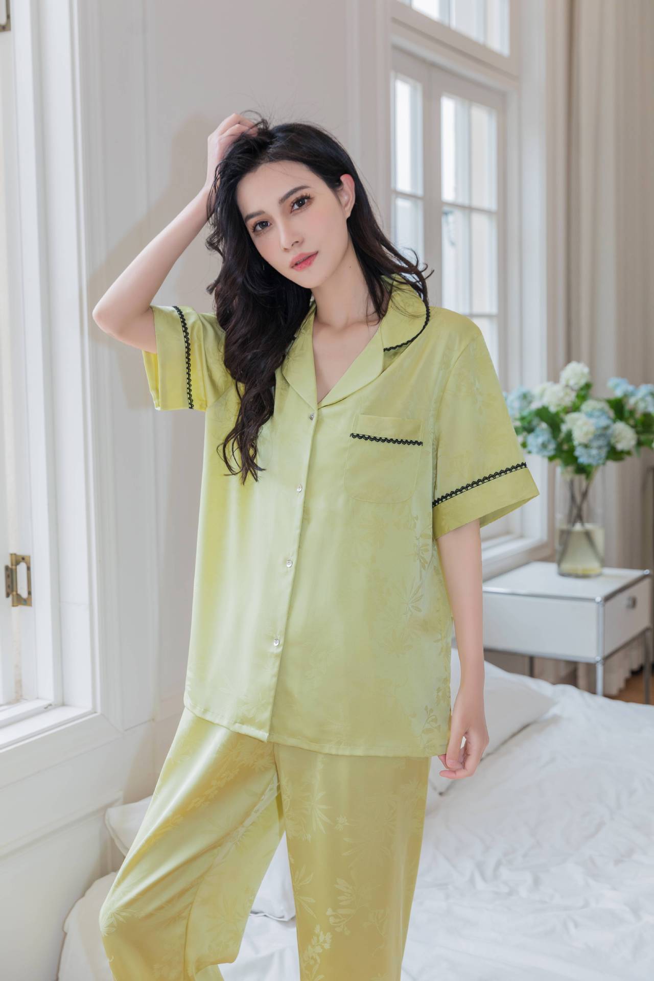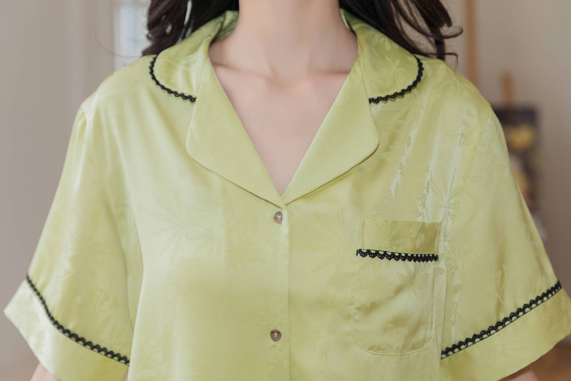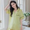 Pijamas de Mujer 2023 Nuevos Seda de Hielo Elegantes Nobles Manga Corta para Mujer Seda Jacquard Hoja Verde Sensación de Alta Gama Ropa para el Hogar