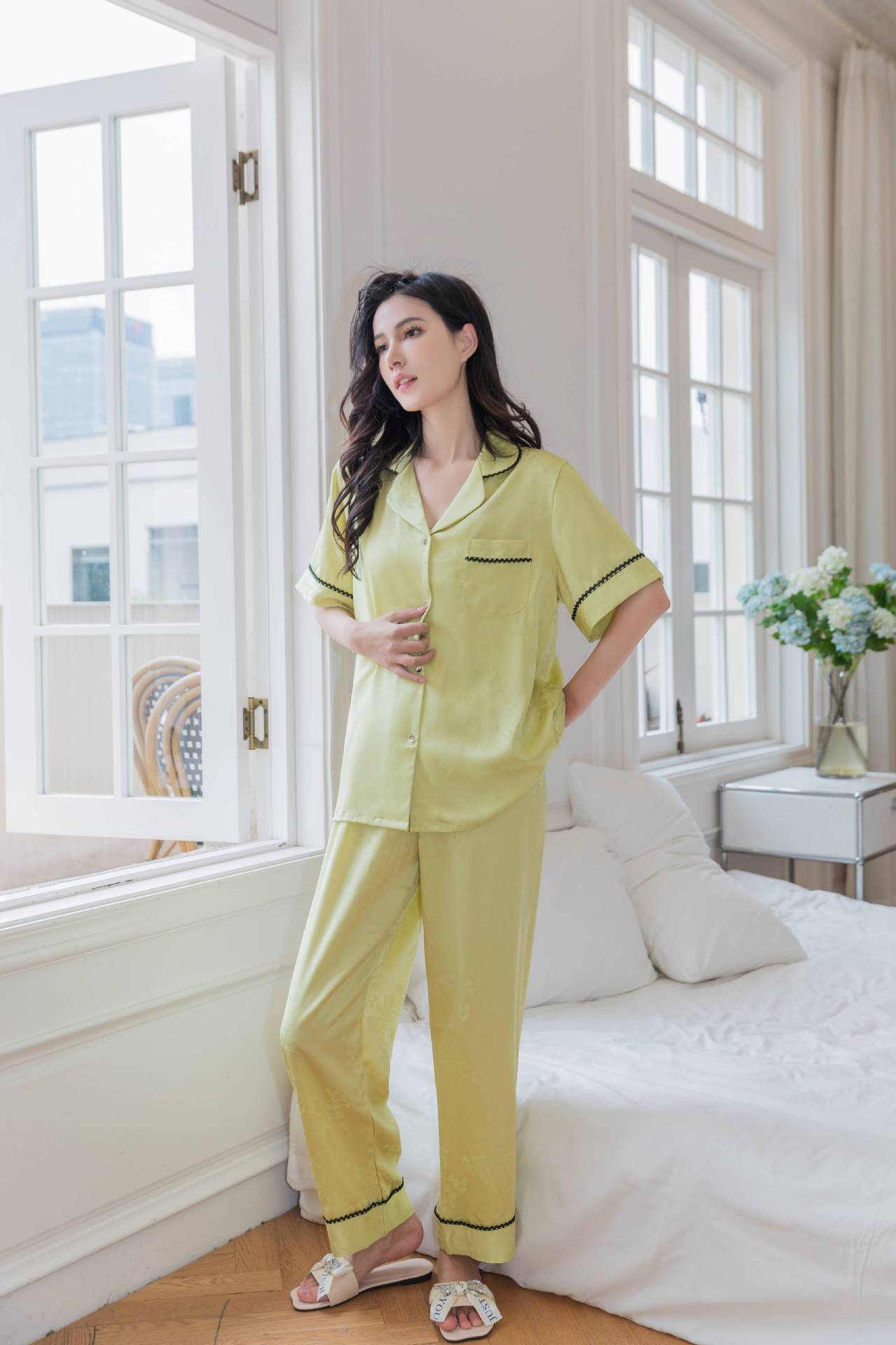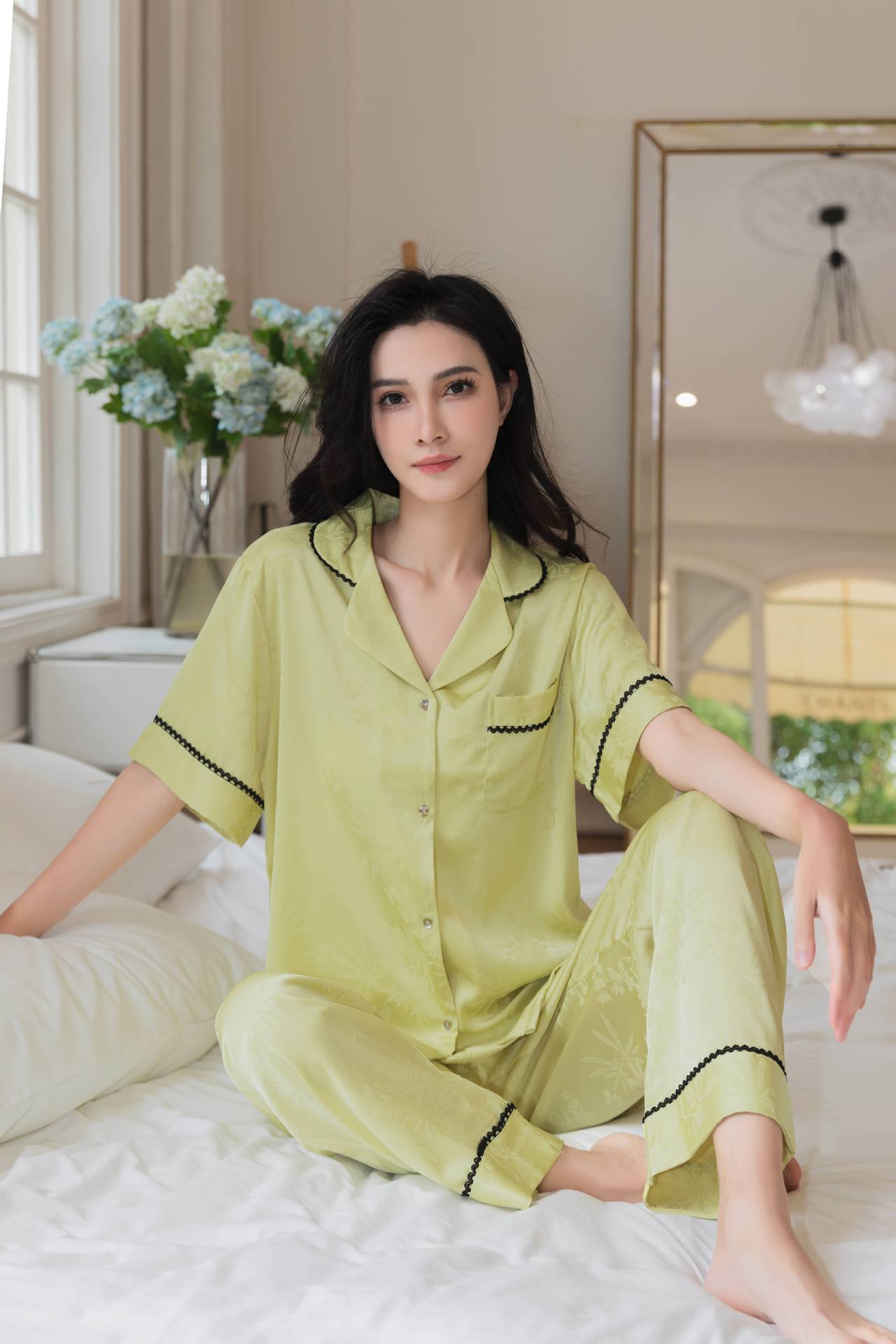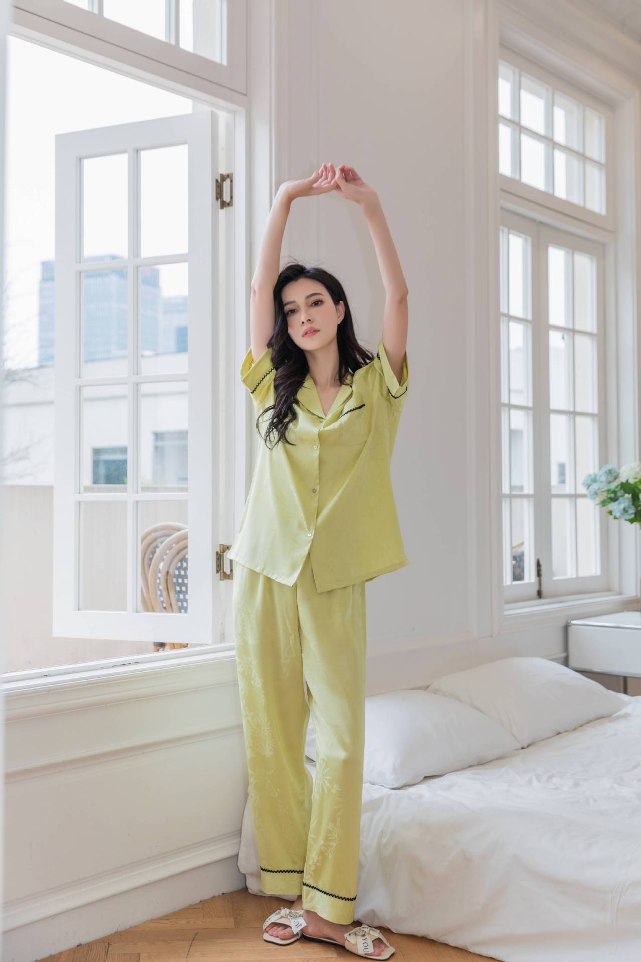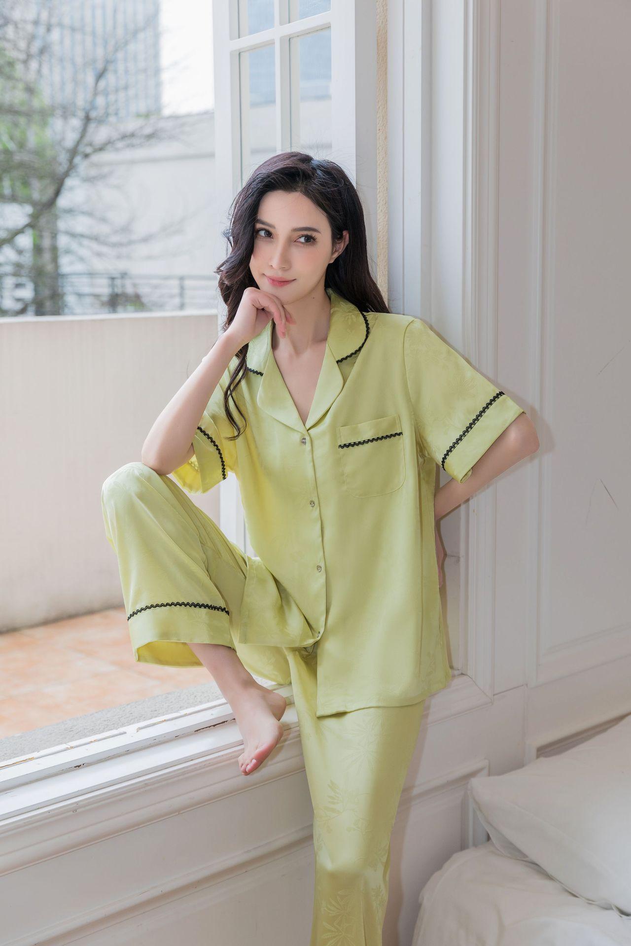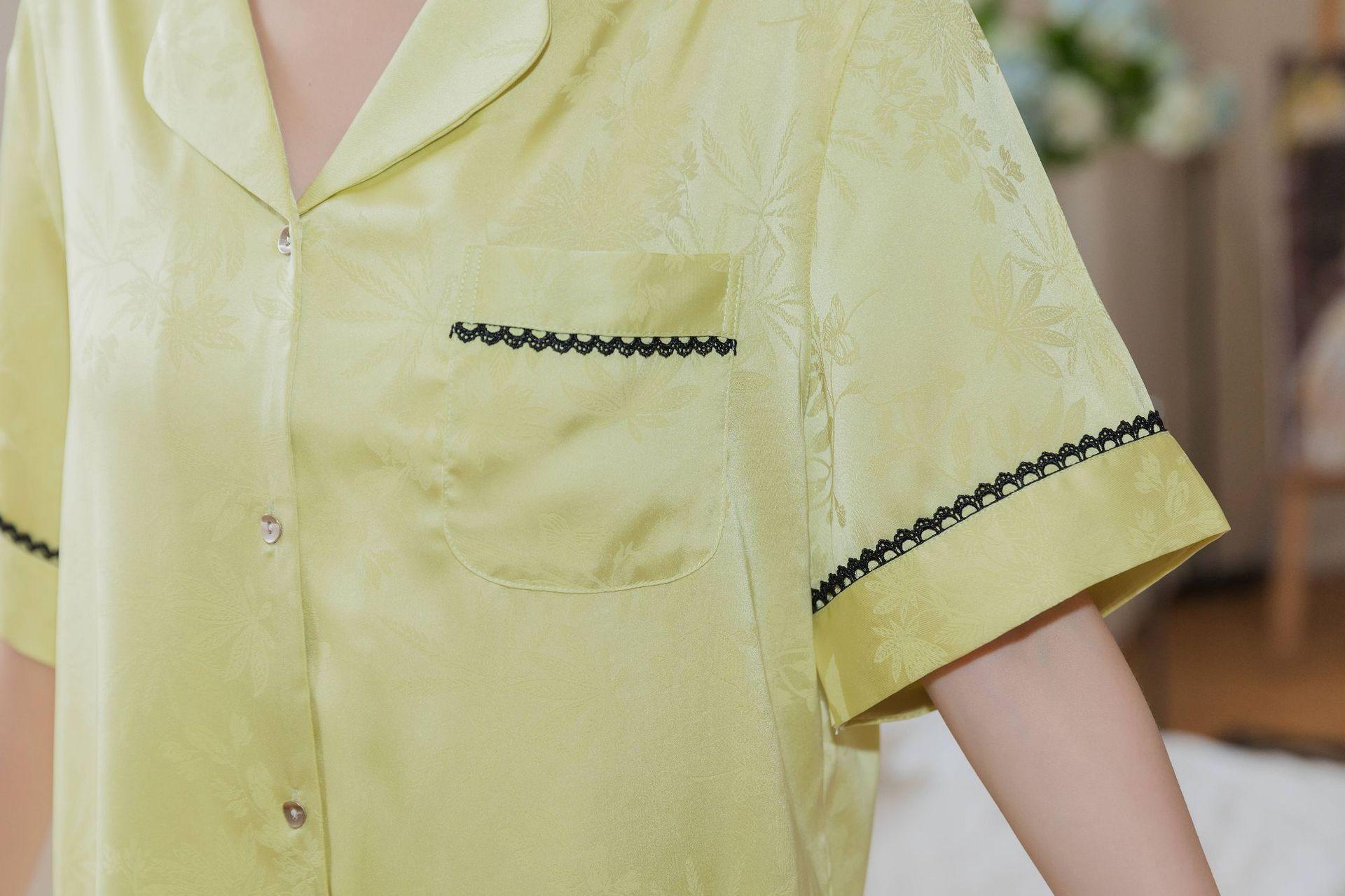 Pijamas de Mujer 2023 Nuevos Seda de Hielo Elegantes Nobles Manga Corta para Mujer Seda Jacquard Hoja Verde Sensación de Alta Gama Ropa para el Hogar